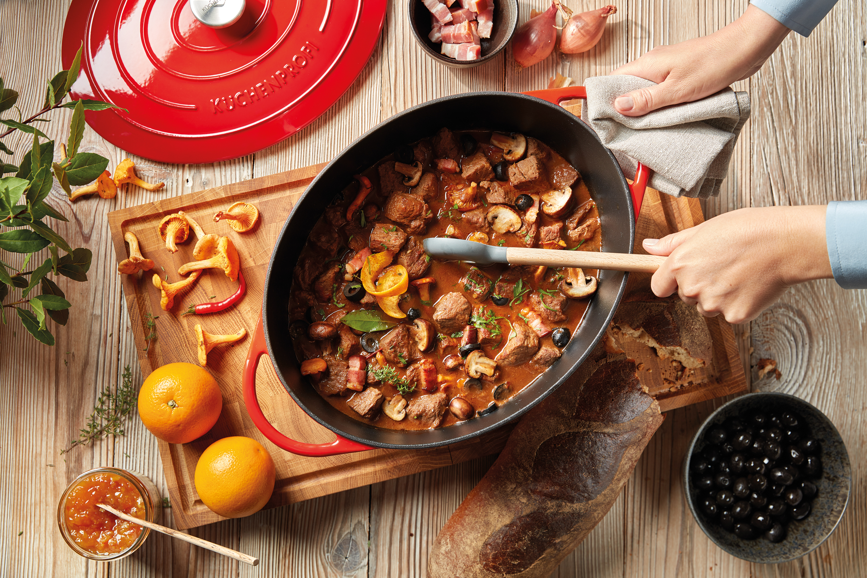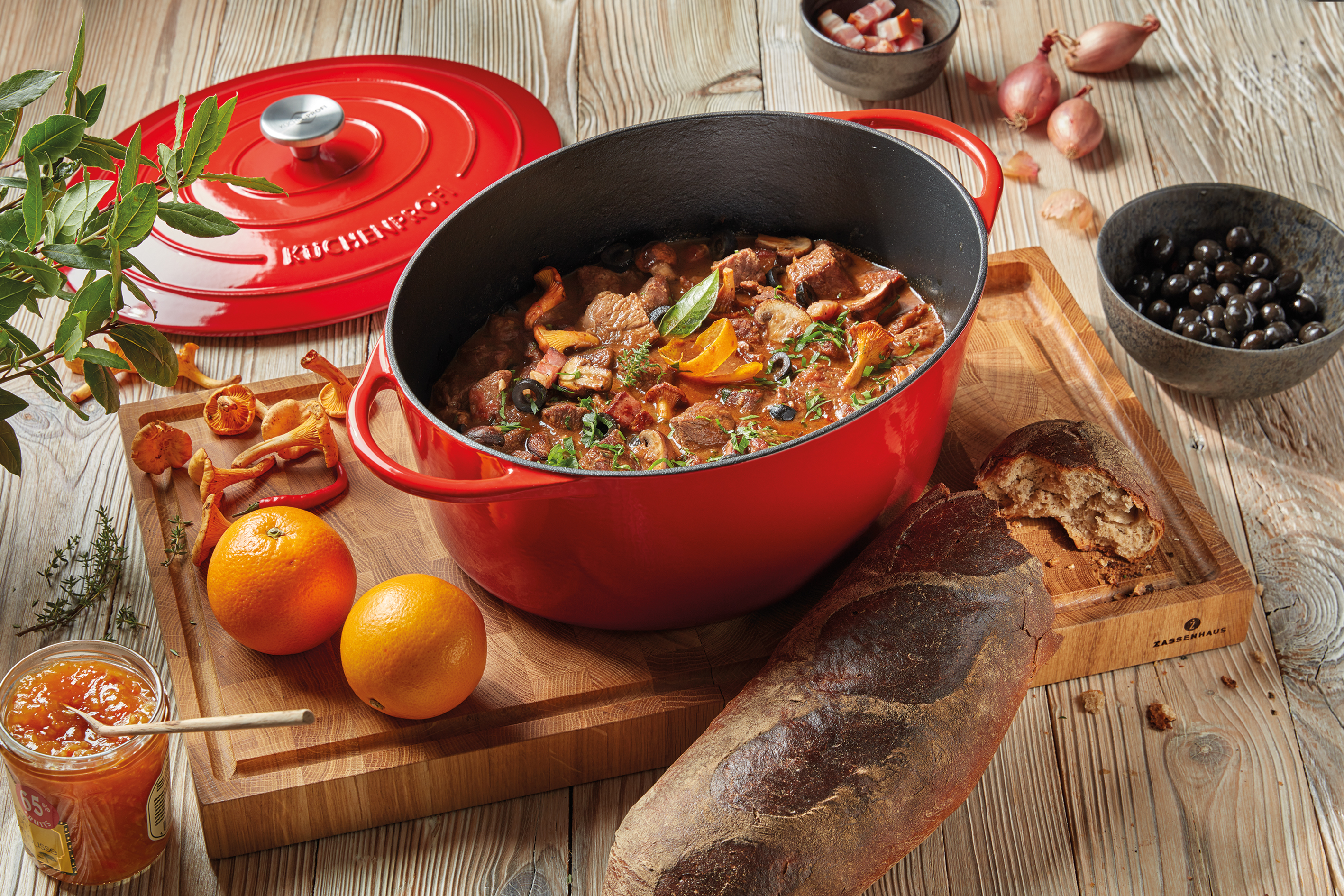 Von der Sonne verwöhntes Gemüse, Lammfleisch aus dem Hochland, Fisch und Meeresfrüchte – das alles bietet die Provence. Vielseitig, leicht und gesund ist die Küche dieser südfranzösischen Region. In dieser Tradition steht die KÜCHENPROFI Guss-Kollektion PROVENCE. Die Serie ist ideal zum Schmoren, Köcheln, Kochen, Braten und Frittieren. Das Gusseisen nimmt die Hitze schnell auf und verteilt sie optimal. So können Sie nach kurzer Zeit die Energiezufuhr reduzieren – das spart Strom und erhält das Aroma Ihrer Lebensmittel. Die PROVENCE-Kochgeschirre sind für alle Herdarten inklusive Induktion geeignet, die Knöpfe bis 250 °C backofenfest. Beim stilvollen Servieren ist das Kochgeschirr der Frische-Kick auf Ihrer Tafel. Das ebenso zeitlose wie durchdachte Design mit den handlichen Knöpfen und ergonomischen Griffen ist ein echter Blickfang. Und jetzt ist Ihre Fantasie gefragt. Wie wäre es mit einem Miesmuscheleintopf mit Seelachs, Lauch, Kartoffeln und einem Schuss Wermut? Bon appétit!