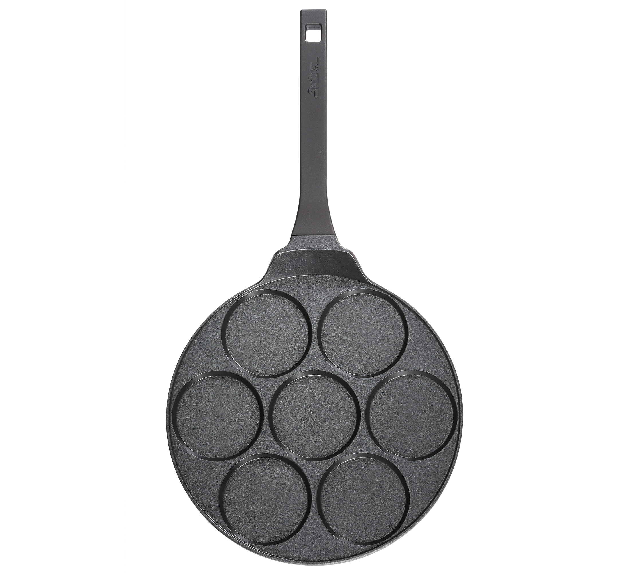 Material: Pfannen-Körper aus Aluminium in Schmiede-Qualität, Hochleistungs-Antihaftbeschichtung mit mineralisch verstärkter Grundschicht. Vollflächen-Induktionsboden. 7 Vertiefungen mit einem Durchmesser von 8 cm. Geeignet für sämtliche Herdarten inklusive Induktion.