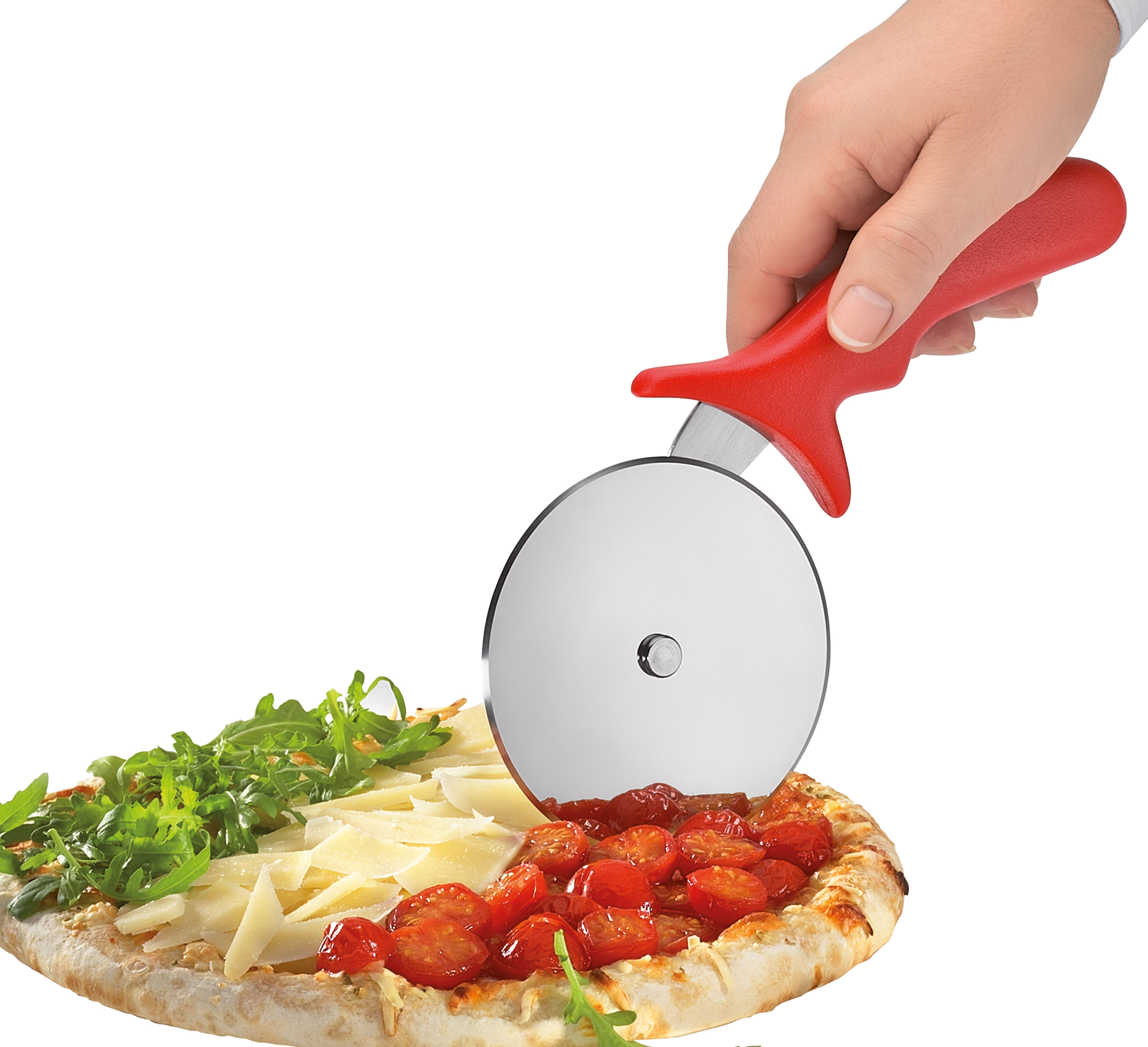 KÜCHENPROFI zeigt Flagge. Der Pizzaschnei-der ITALIA ist in den Nationalfarben Grün, Weiß, Rot erhältlich. Der ergonomisch geformte Griff liegt gut in der Hand, das Pizzarad teilt den knusprigen Fladen schnell und sauber. Wie wäre es standesgemäß mit einer Pizza Margherita, die ebenfalls die Tricolore trägt? Der Legende nach hat der Neapolitaner Raffaele Esposito seine Kreation mit Tomaten, Mozzarella und Basilikum zu Ehren der italienischen Königin Margherita im Jahr 1889 entwickelt. Auch die Klassiker mit Salami und Thunfisch teilt der Pizzaschneider mühelos. Nach der Reinigung geht es zur sicheren Aufbewahrung in die Schutzhülle.