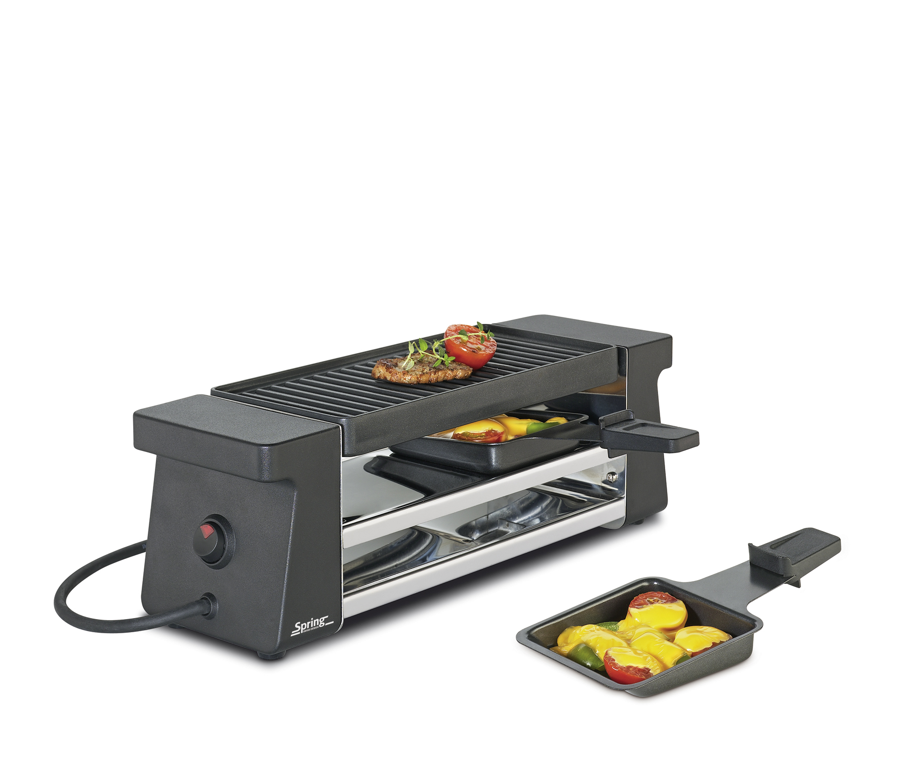 Das Set enthält: 1 Raclettegerät mit Grillplatte aus Aluminiumguss antihaftbeschichtet 23.5 x 10,5 cm, 2 Pfännchen, 2 Spachtel.