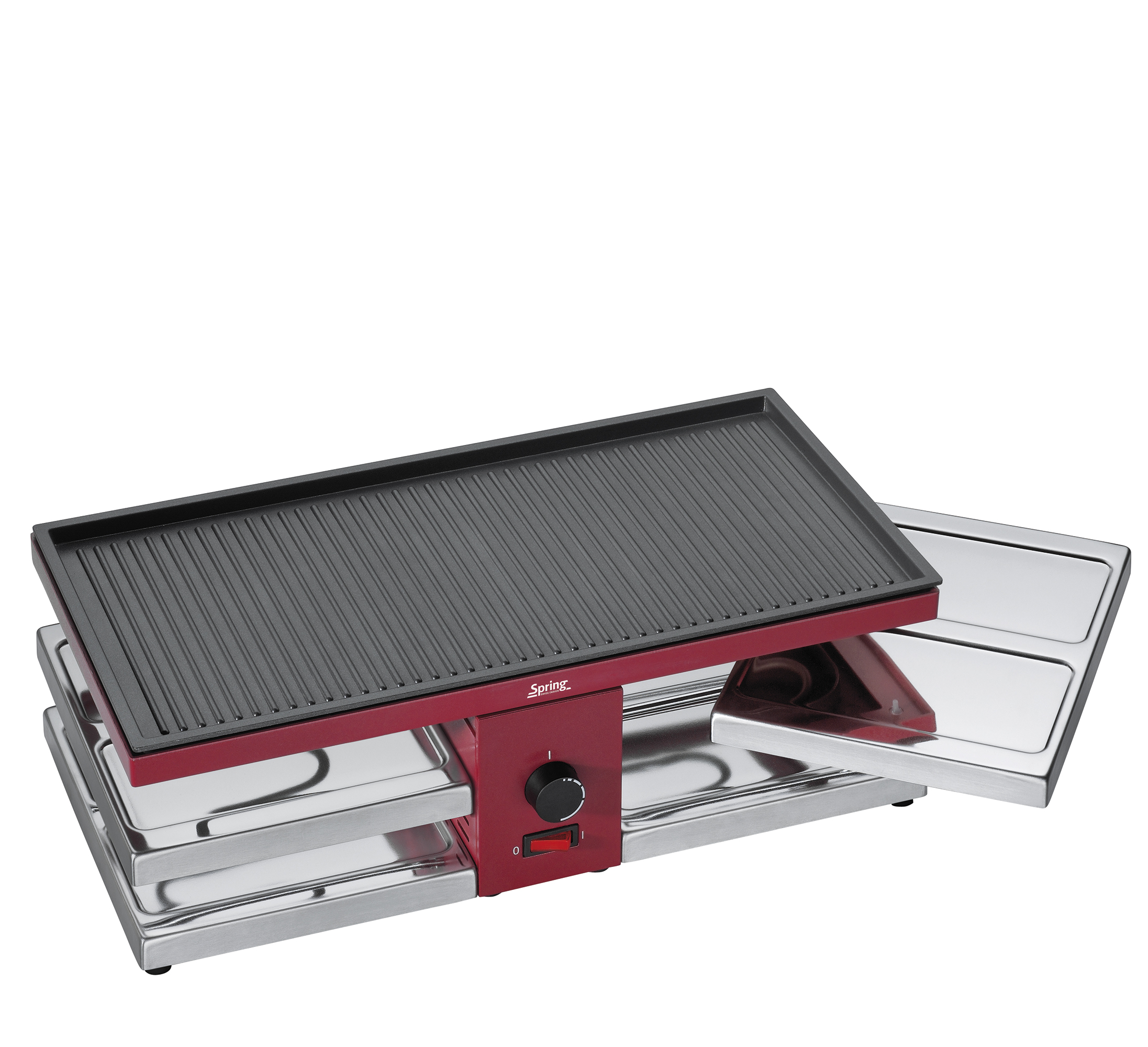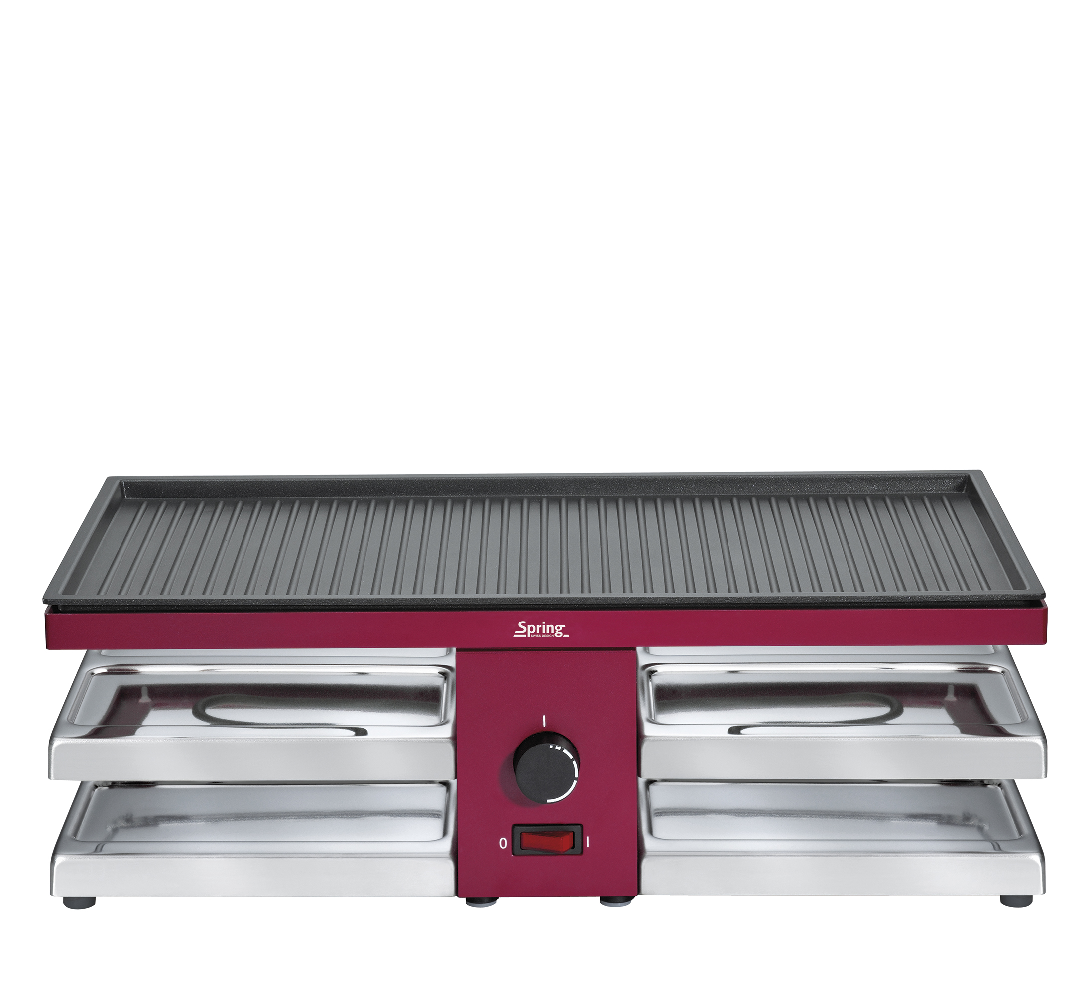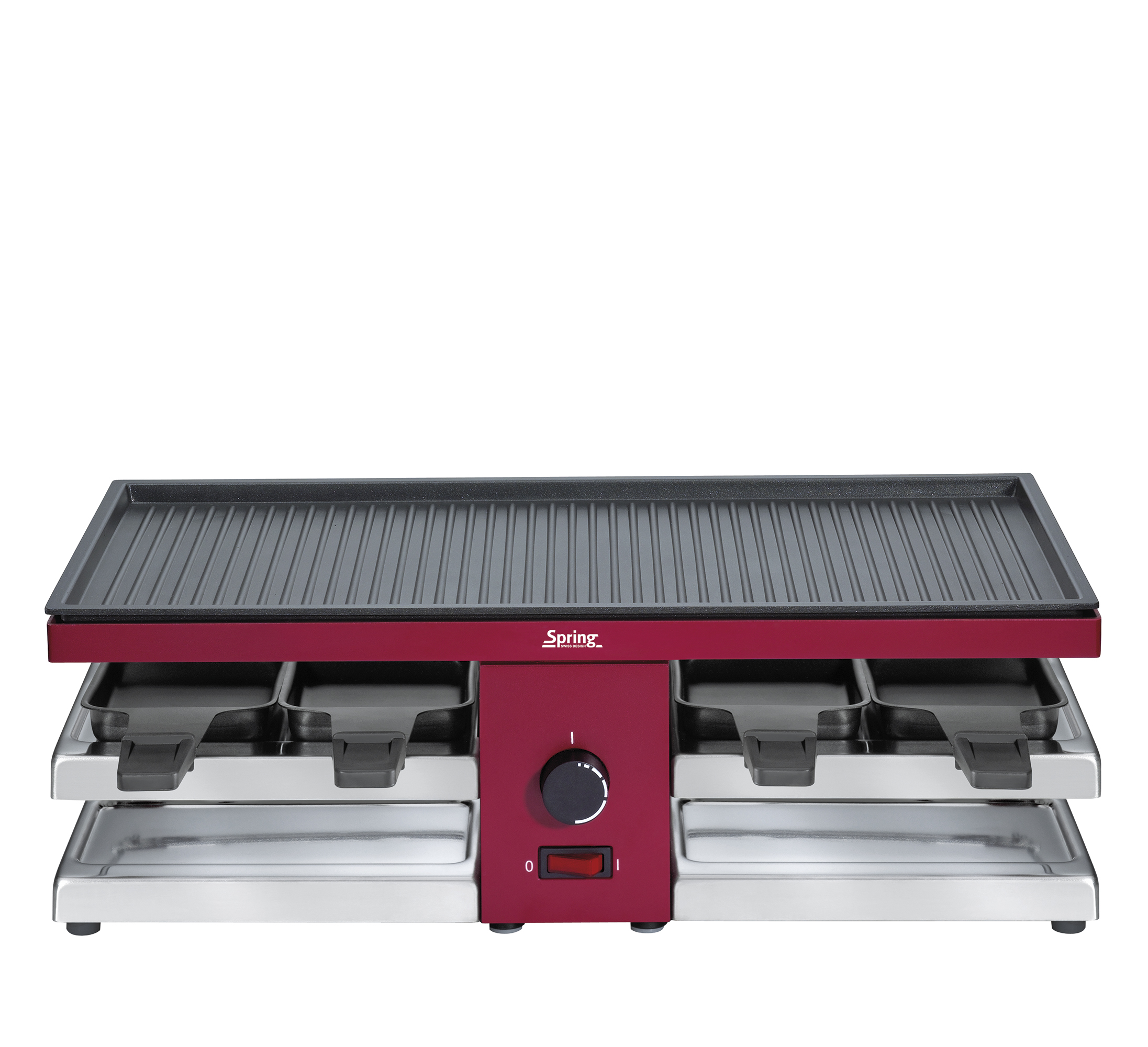 Da kommt Freude auf! Mit dem Raclette8 FUN von SPRING starten Sie mit Freunden oder der Familie in einen geselligen Abend. Acht Pfännchen finden in dem Raclette aus hochwertigem Edelstahl Platz und warten darauf, nach individuellem Geschmack befüllt zu werden. Dann geht es ab auf die antihaftbeschichtete, abnehmbare Grillplatte aus Aluminium. Die Temperatur des Raclettes lässt sich stufenlos regeln, die leistungsstarke Heizspirale bringt den Käse rasch zum Schmelzen. Und Sie haben Zeit, sich entspannt mit Ihren Gästen zu unterhalten. Da die köstlichen Kreationen direkt am Tisch zubereitet werden, müssen Sie nicht zwischen Küche und Esszimmer pendeln. Beim Essen ist ebenfalls Entschleunigung angesagt. Wer zwischendurch eine Pause einlegt, findet auf der praktischen Ablage einen Platz für sein Pfännchen. Nach der Raclette-Party ist die Reinigung des Gerätes schnell erledigt, die beiden mittleren Edelstahlplatten lassen sich abnehmen und dürfen in die Spülmaschine.