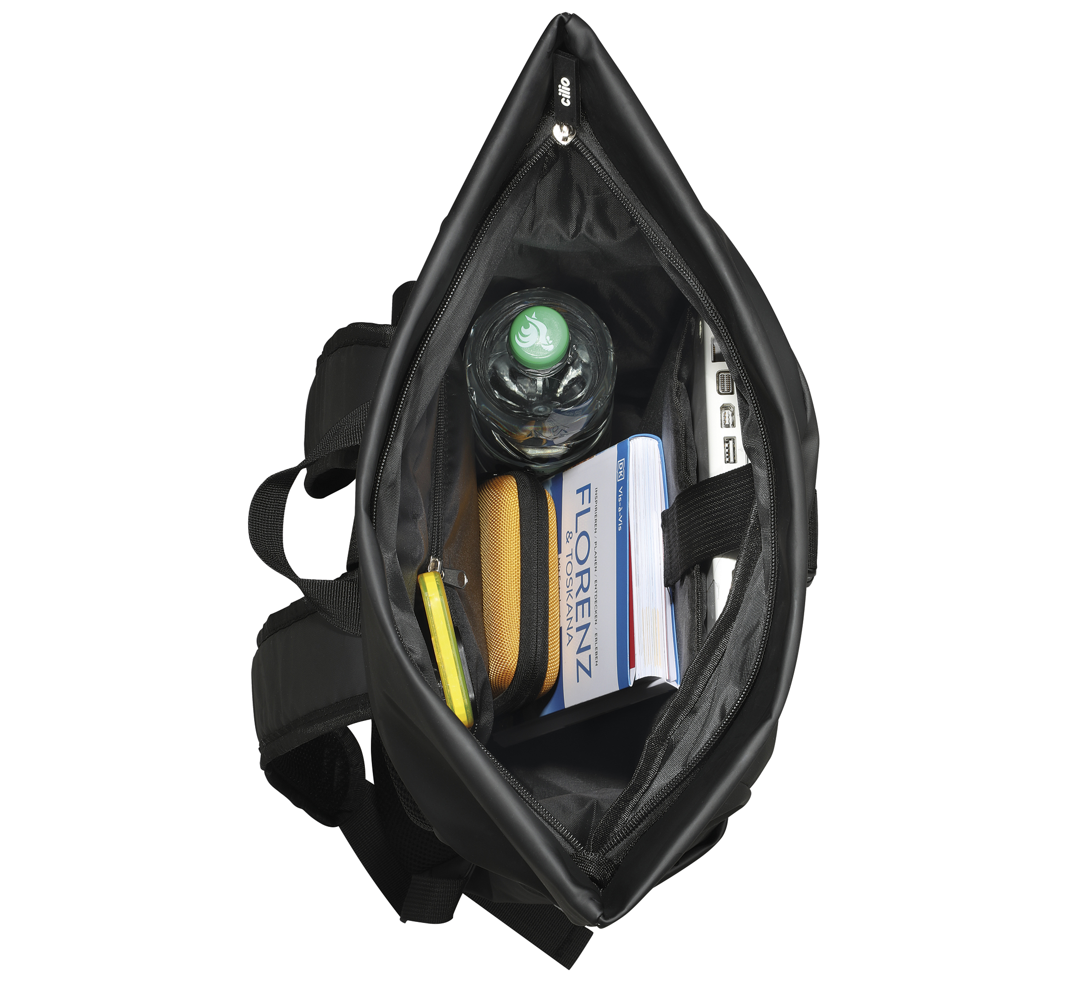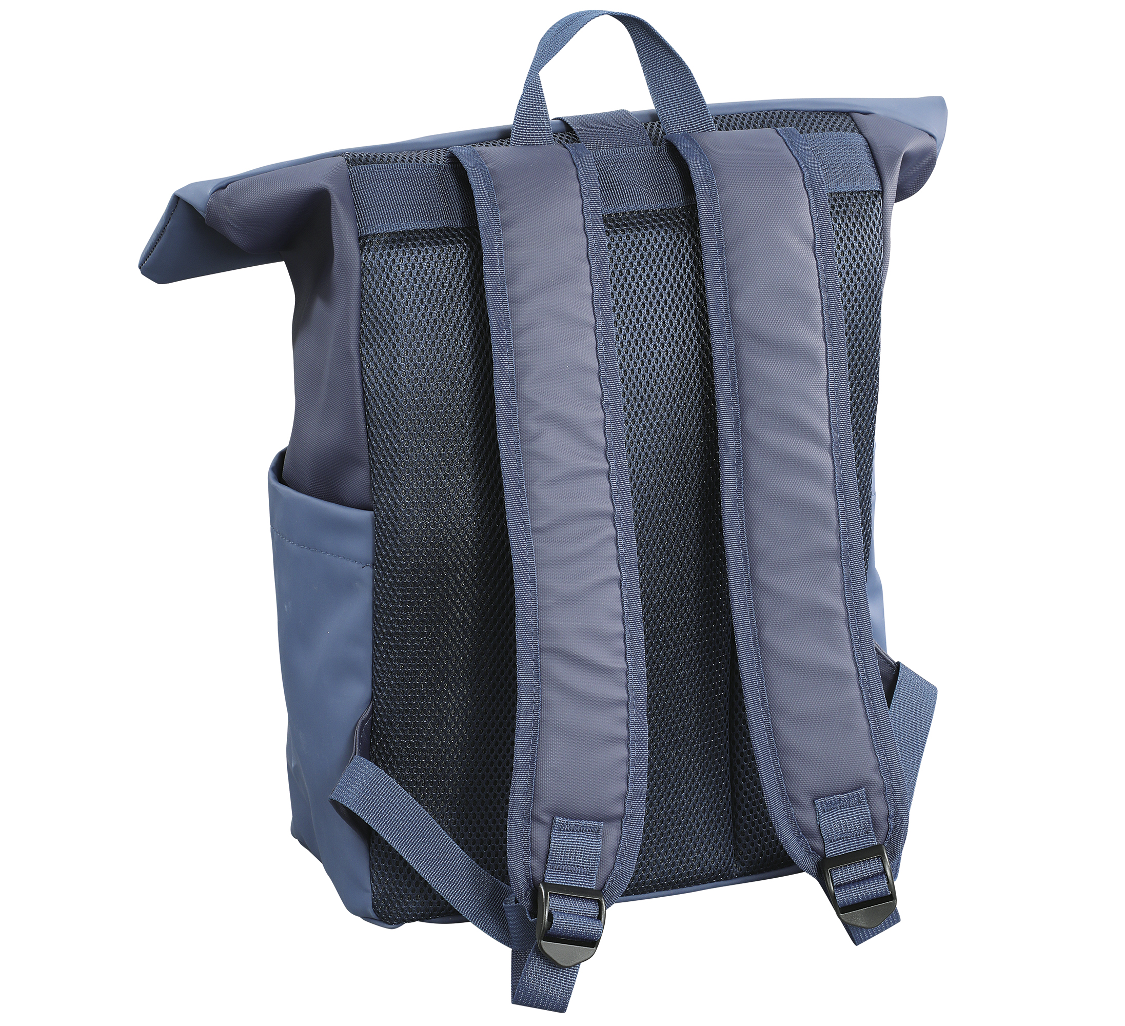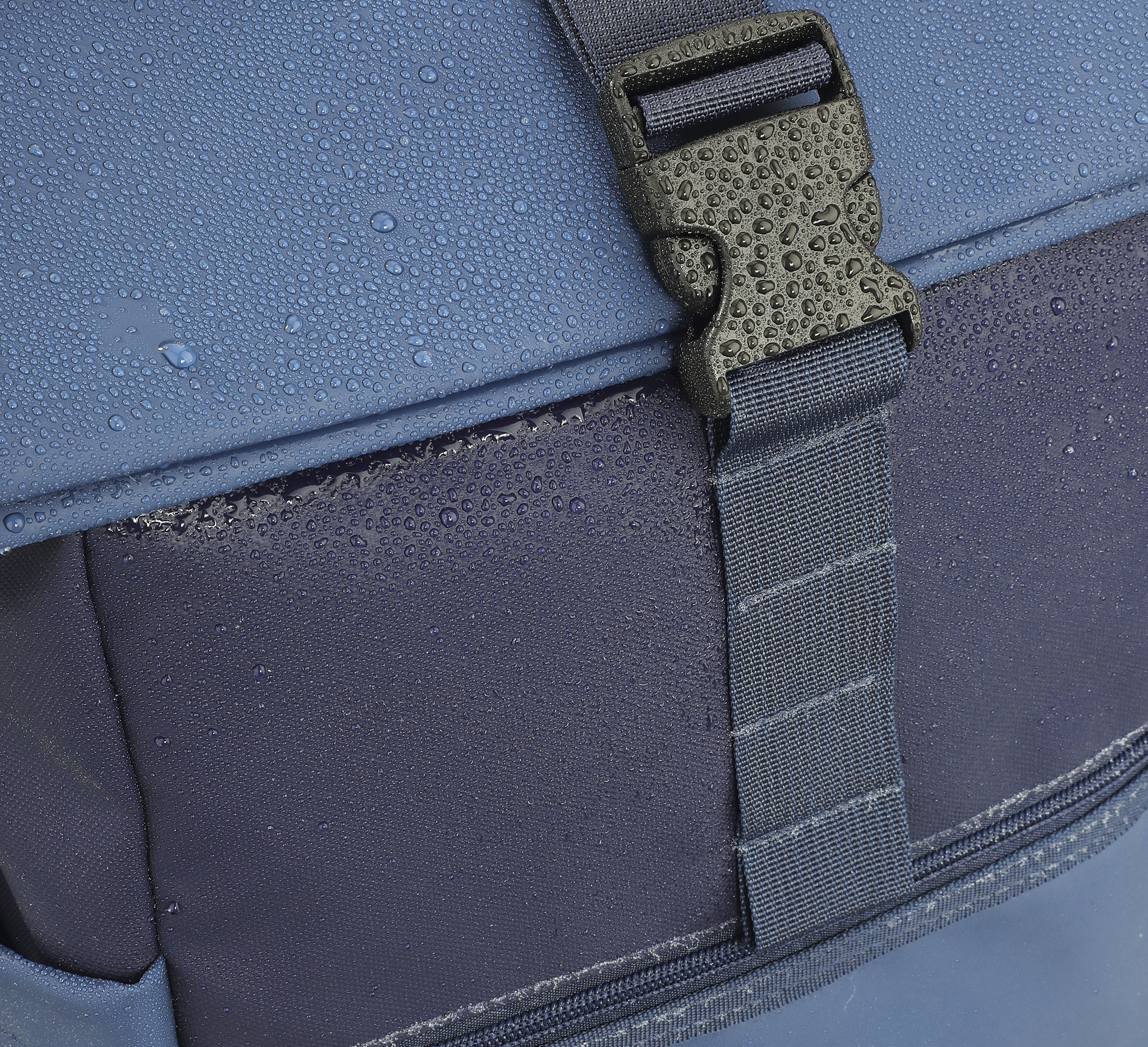 Material: Strapazierfähiger Polyester, innen beschichtet. 2 seitliche Taschen (Höhe: 21 cm). Zusätzliche Fronttasche mit Reißverschluss. Rolltop mit Klickverschluss, verstärkter Boden. Verstellbare, gepolsterte Schultergurte. Mit Aufhängelasche.