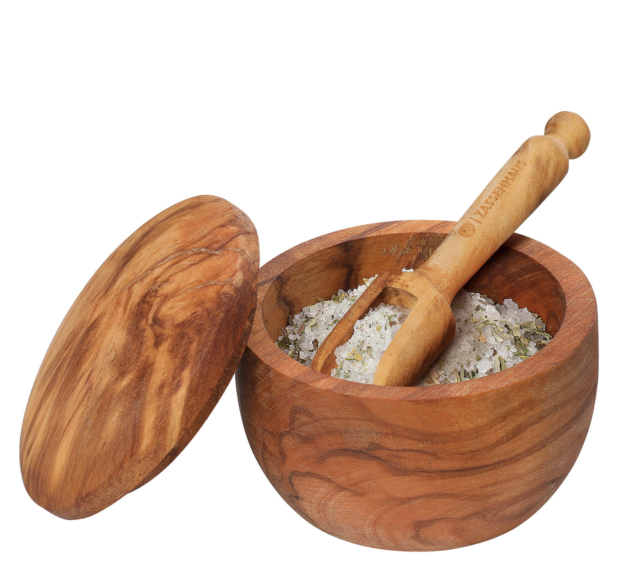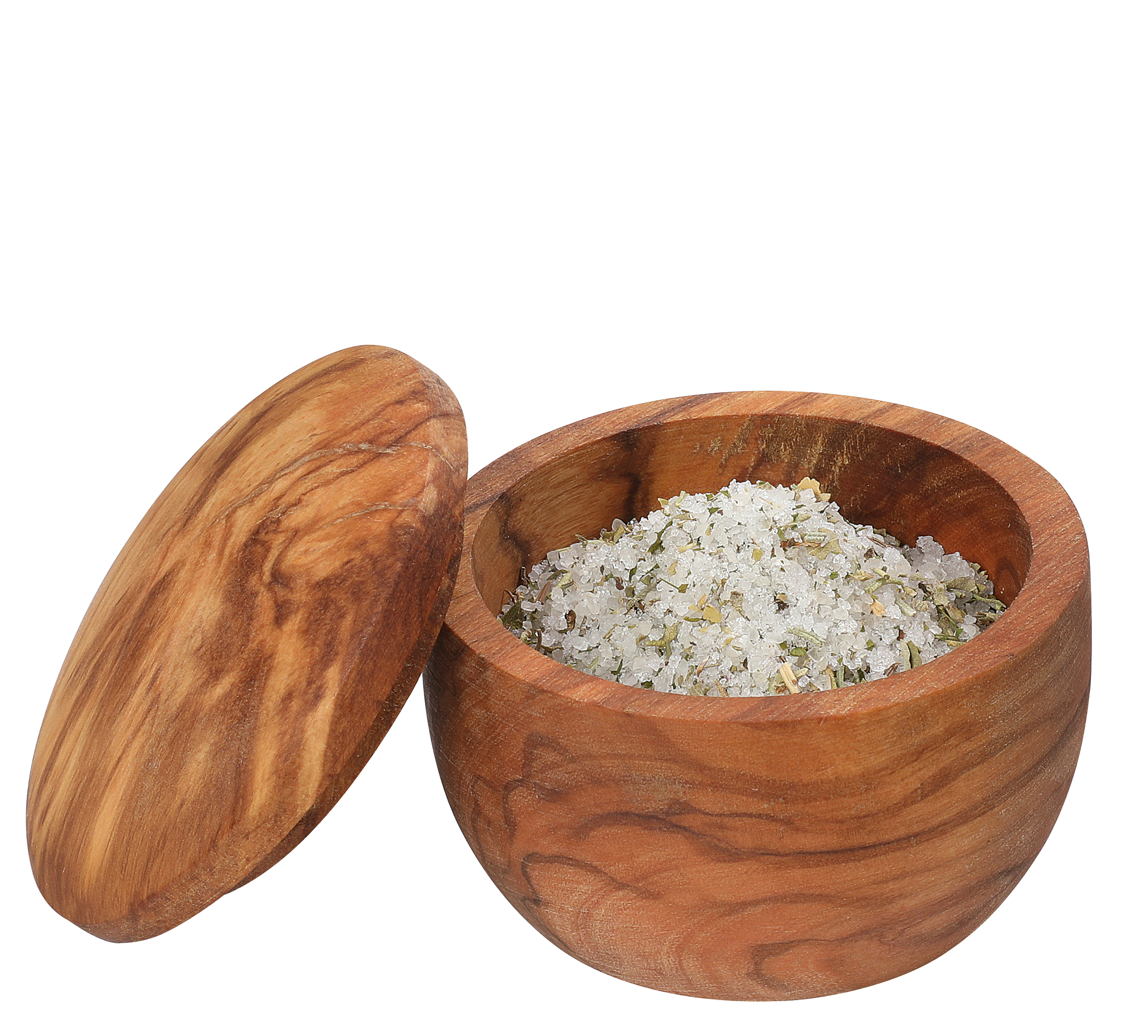 Unverkennbar Olivenholz. Die schöne Maserung prägt die edle Optik des Salztopfes. Das Holz stammt aus dem sonnigen Italien und versprüht auf jedem Tisch mediterranes Flair. Mit Hilfe des passenden Schäufelchens gelingt das Dosieren von Meersalz, aber auch italienischen Kräutern oder Kapern beim Kochen oder bei Tisch mühelos. Dank des Deckels bleibt alles schön geschützt.