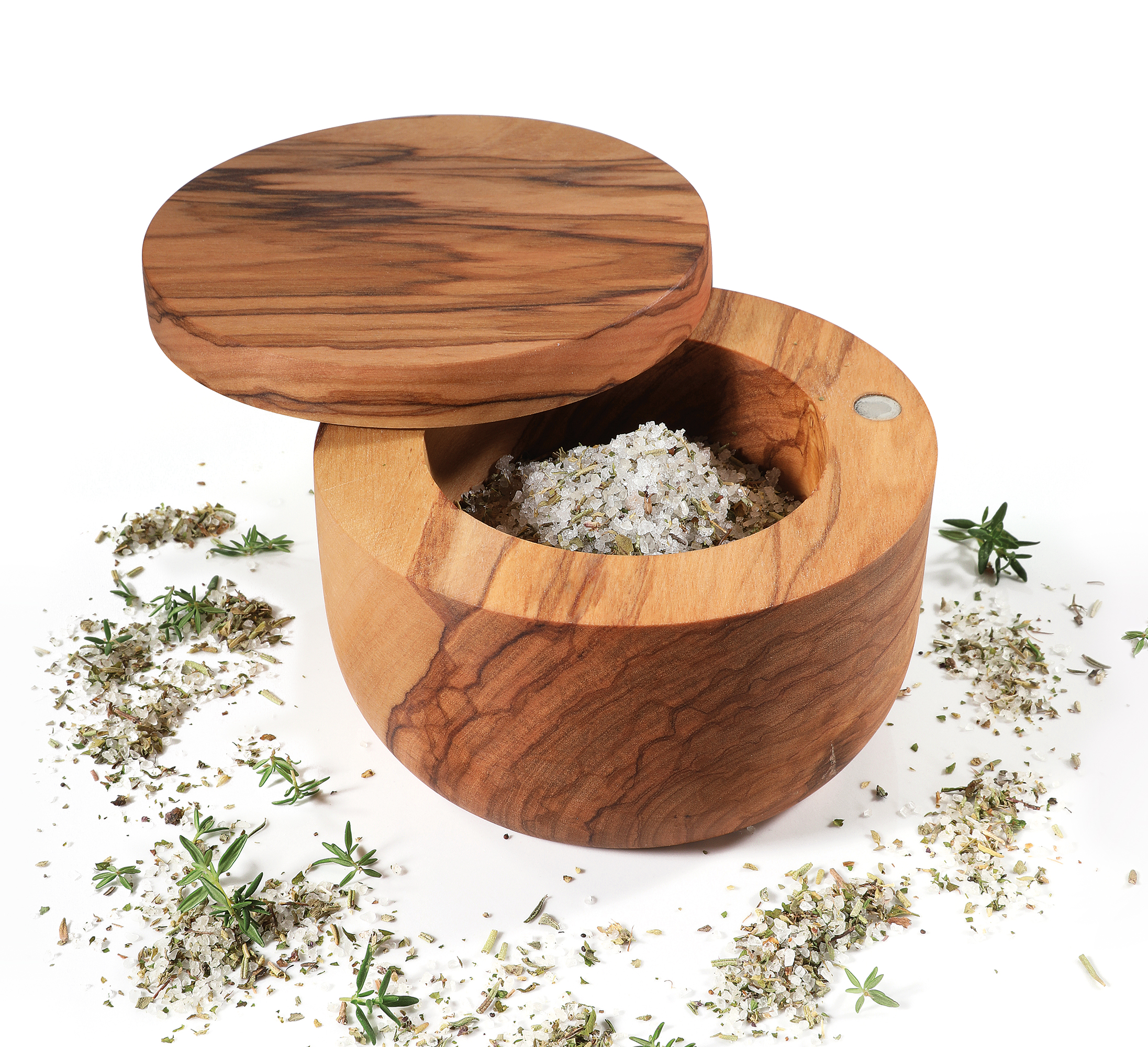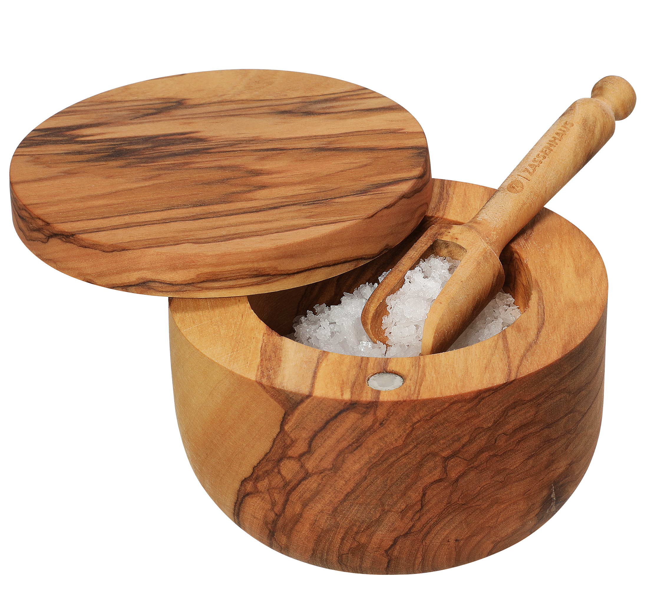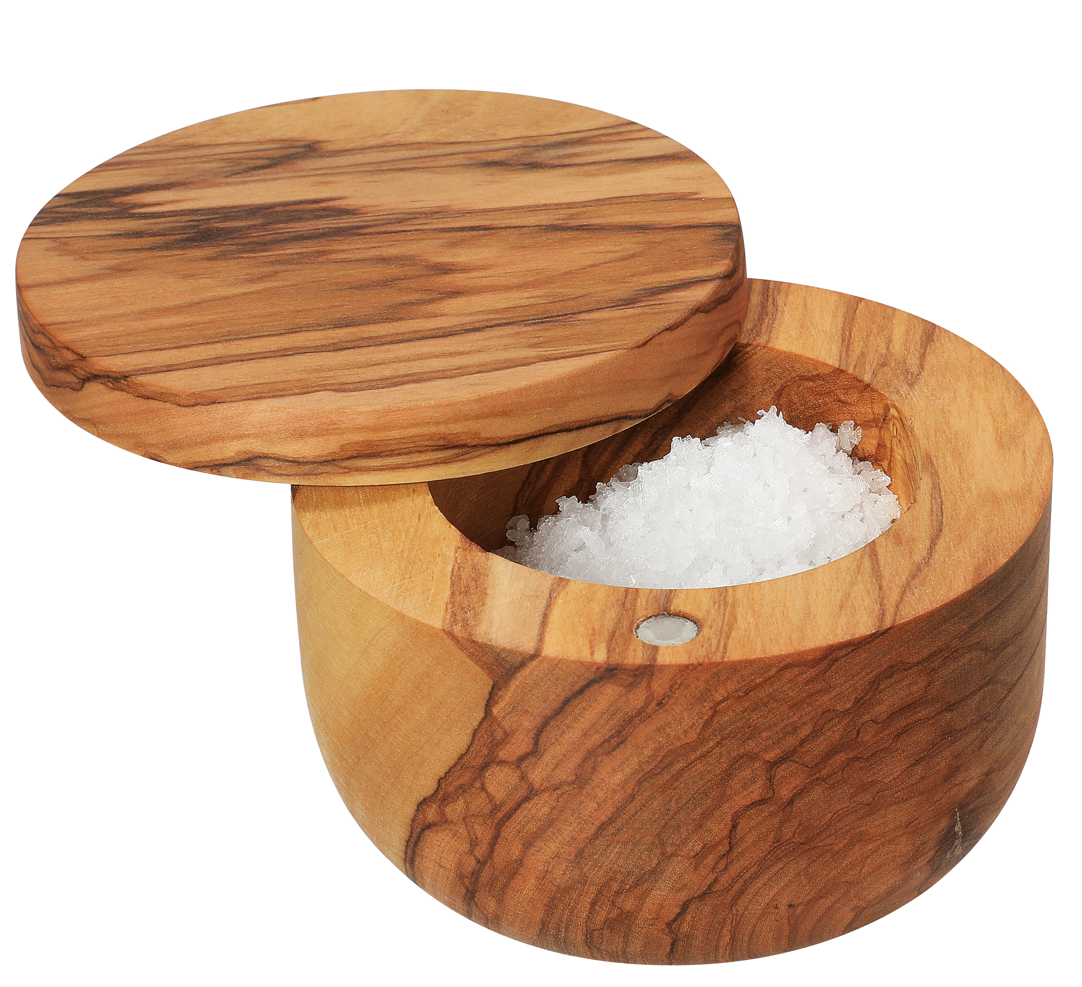 Unverkennbar Olivenholz. Die schöne Maserung prägt die edle Optik des Salztopfes. Das Holz stammt aus dem sonnigen Italien und versprüht auf jedem Tisch mediterranes Flair. Mit Hilfe des passenden Schäufelchens gelingt das Dosieren von Meersalz, aber auch italienischen Kräutern oder Kapern beim Kochen oder bei Tisch mühelos. Dank des Deckels bleibt alles schön geschützt.