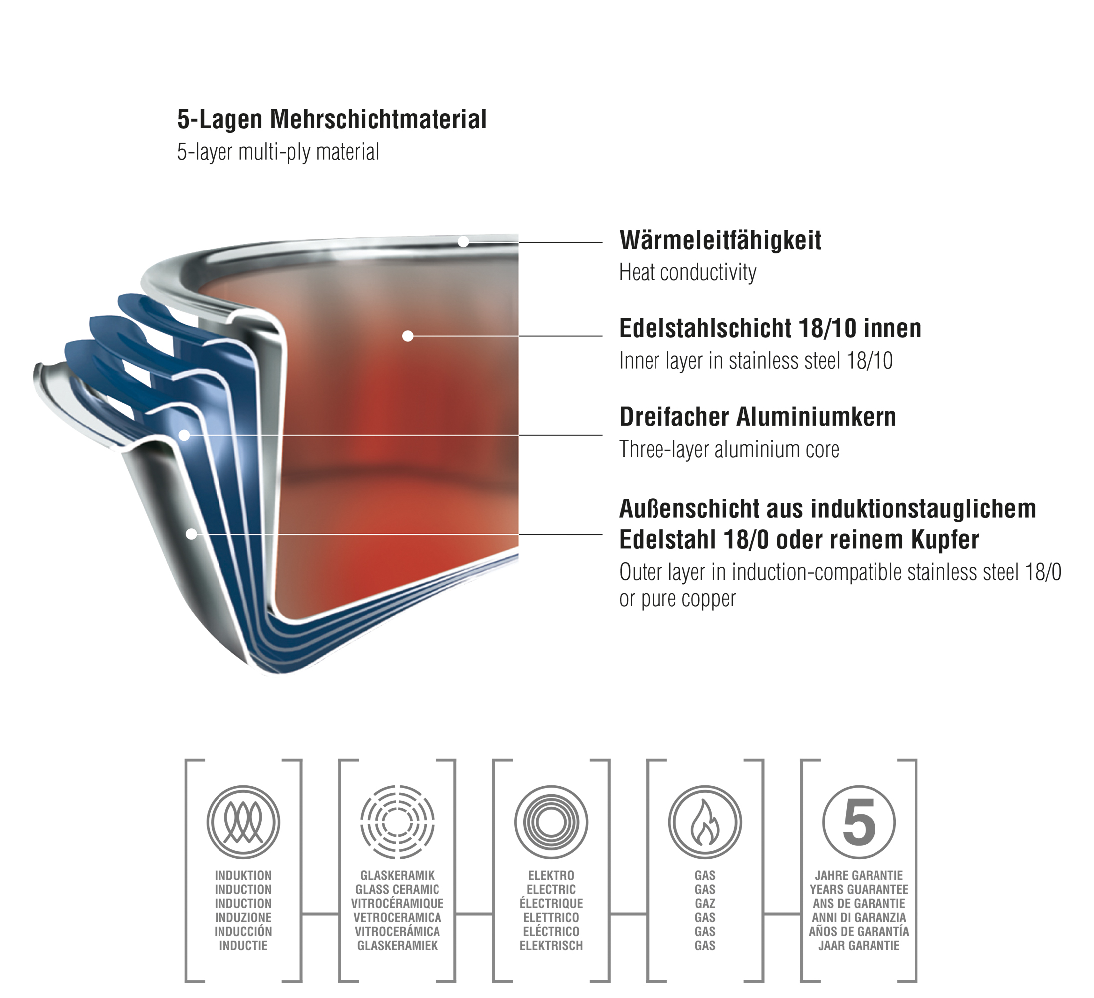 Material: 5-Lagen-Mehrschichtmaterial mit Außenschicht aus induktionstauglichem Edelstahl 18/10, innen Edelstahlschicht 18/10 und dreifachem Aluminiumkern. Geeignet für sämtliche Herdarten inklusive Induktion. Backofen- und spülmaschinenfest.