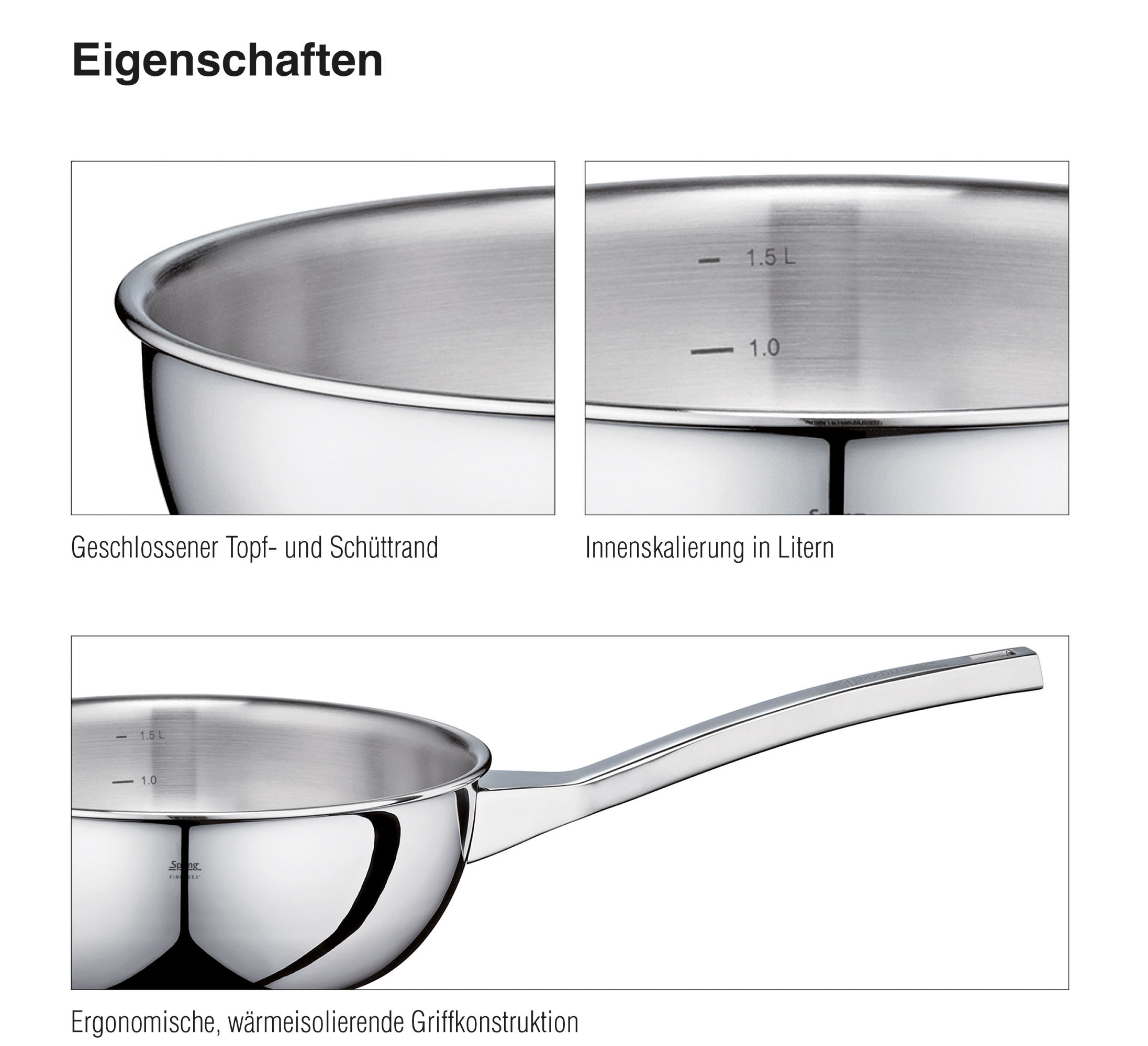 Eine feine Idee! SPRING serviert Ihnen mit der Topf-Serie FINESSE2+ die perfekte Mischung aus zeitlosem Design und hoher Funktionalität. Die vielseitigen Töpfe bewähren sich Tag für Tag, sowohl zu Hause als auch in der Sterneküche. Ihre köstlichen Kreationen garen gleichmäßig, zugleich sparen Sie Zeit und Energie. Das 5-Lagen Mehrschichtmaterial leitet die Wärme optimal vom Boden bis in die Topfwand, die Topf-Innenskala macht den Messbecher überflüssig. Die Sauteuse ist ideal für das scharfe Anbraten, aber auch für das Zubereiten von Soßen. Dank der konischen Form kommen Sie mit dem Schneebesen oder Kochlöffel bis in den letzten Winkel. Der ergonomisch geformte, wärmeisolierende Stielgriff liegt gut in der Hand und ist bequem, wenn Sie Ihr Gargut in Butter schwenken. Wie alle Töpfe der Serie FINESSE2+ ist auch die Sauteuse für alle Herdarten inklusive Induktion geeignet und spülmaschinenfest.