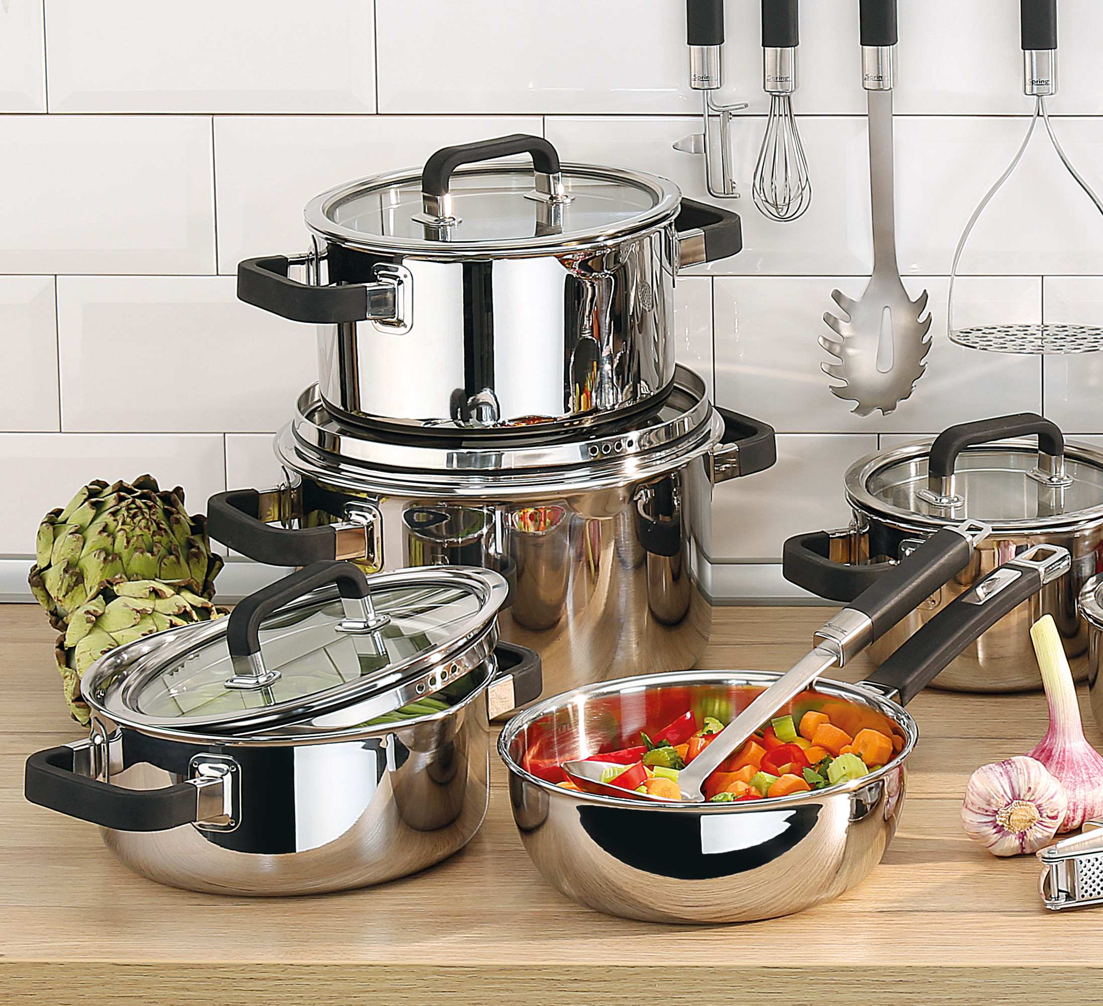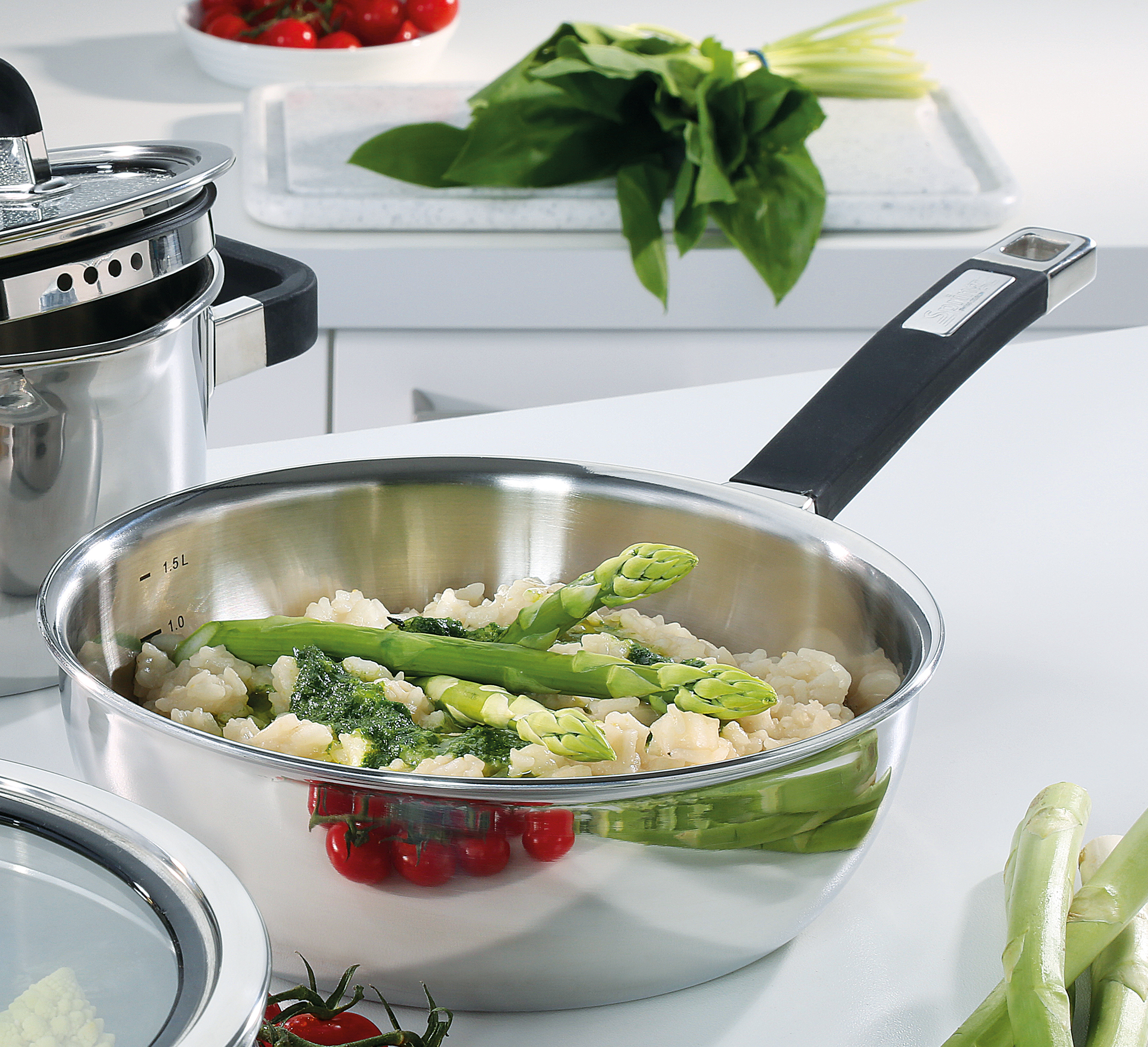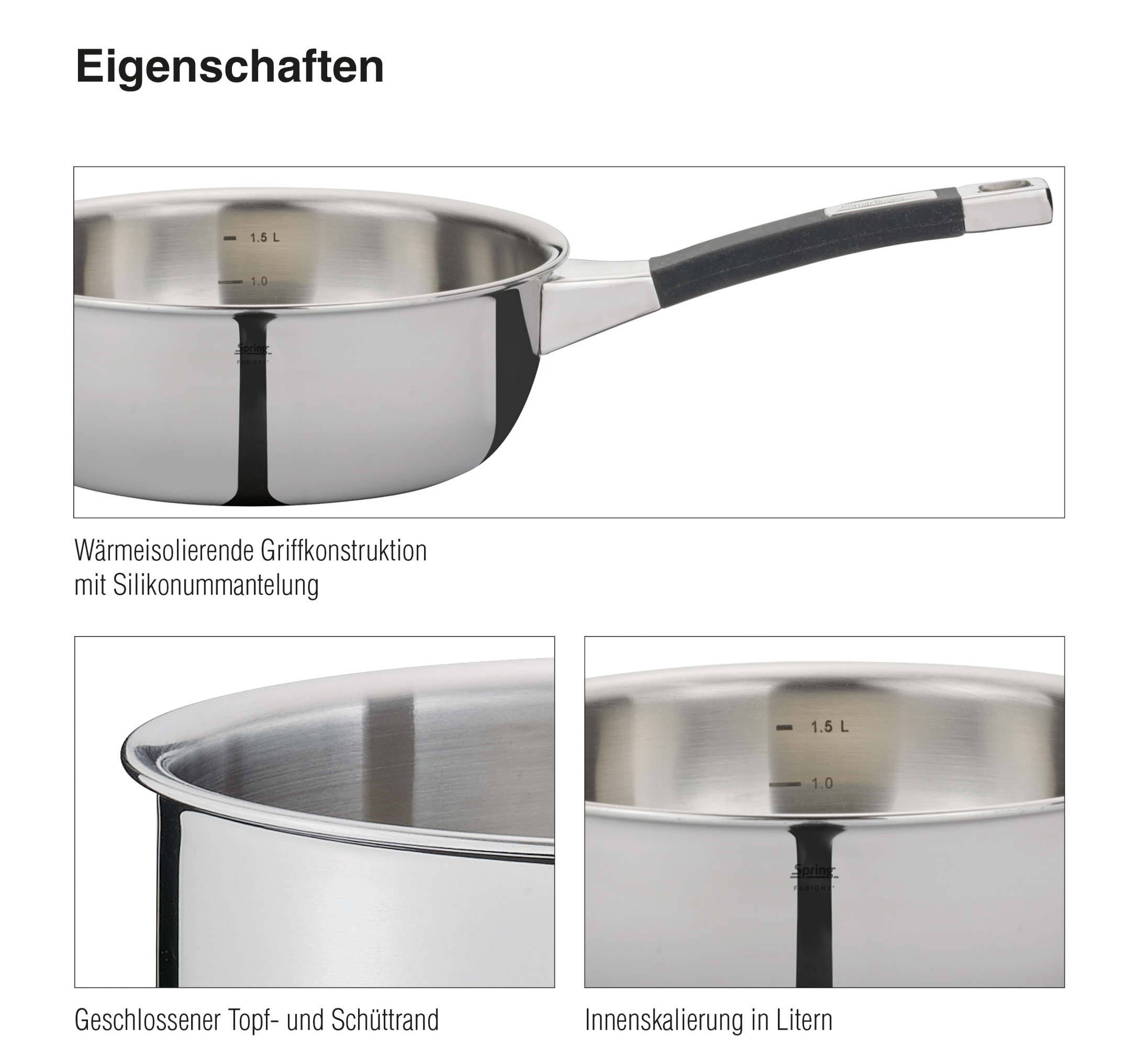 FUSION2+: Edelstahl trifft Silikon. Die Griffe der Topfserie FUSION2+ von SPRING sind silikonummantelt. Das unterscheidet sie von den übrigen Serien des Traditionsunternehmens mit Schweizer Wurzeln. Bekannt und bewährt ist das 5-Lagen-Mehrschichtmaterial. Es leitet die Wärme schnell und gleichmäßig vom Boden bis in die Topfwand. Küchenchefs der Spitzengastronomie und ambitionierte Hobbyköche schätzen diese zeit- und energiesparende Art des Kochens. Weiterer Pluspunkt: Geschmack und Biss der Lebensmittel bleiben voll erhalten. Die Innenskalierung in Litern hilft bei der Zubereitung von Nudeln, Reis oder Gemüse, der Glasdeckel gewährt Ihnen beim wasserarmen Garen den Durchblick. Der speziell geformte, geschlossene Schüttrand ermöglicht das punktgenaue und kleckerfreie Abgießen von Flüssigkeiten und das Abdampfen gekochter Lebensmittel. In der Sauteuse können Sie Saucen perfekt reduzieren und köstliche Puddings kochen.