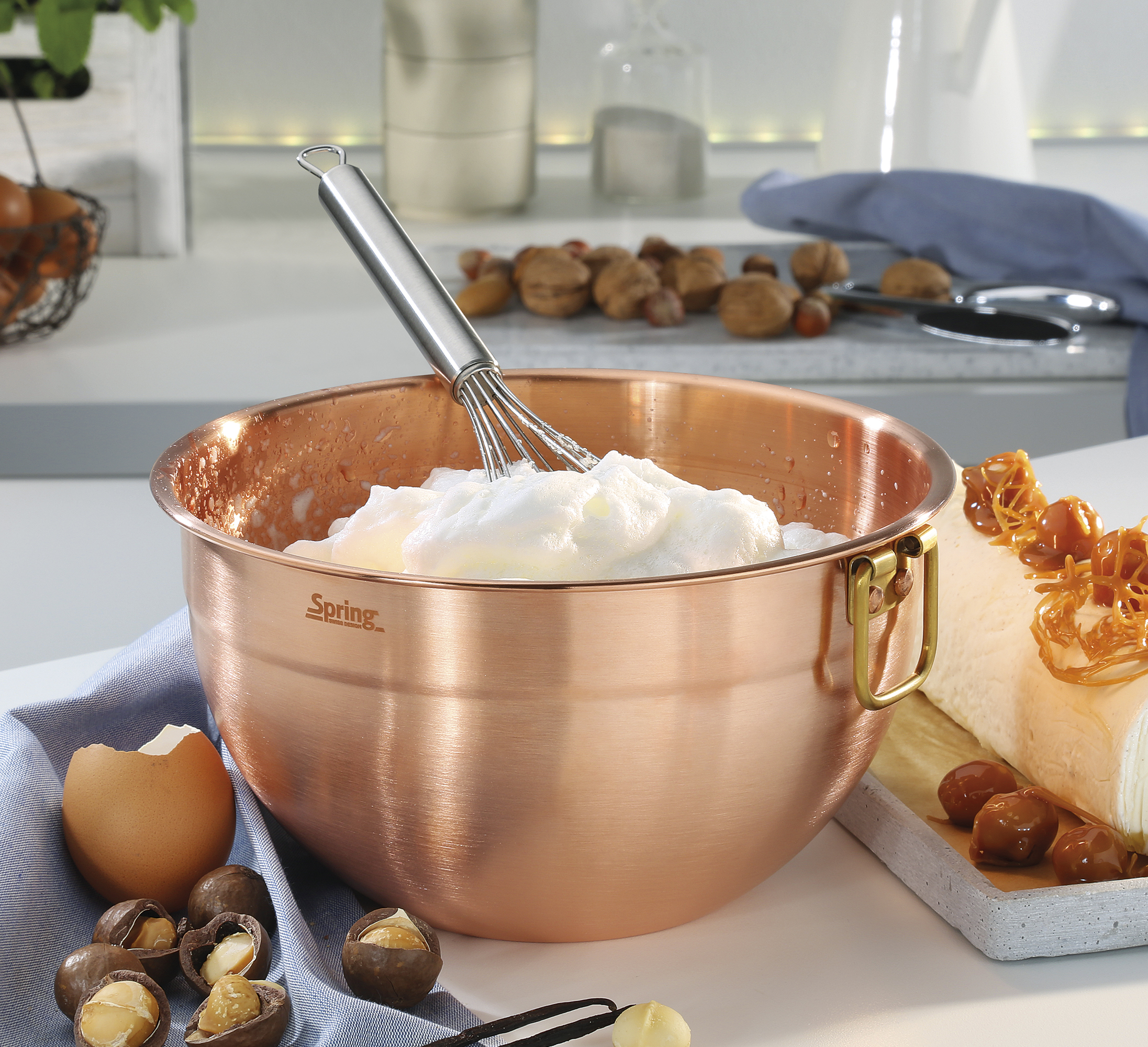 Himmlisch! Eine fluffige Zabaione oder eine Crème brûlée mit krachender Karamellkruste sind die Stars unter den Desserts. Dank der Schüssel CULINOX von SPRING gelingen diese und viele andere Köstlichkeiten perfekt. Sie ist aus edlem Kupfer gefertigt, das wegen seiner hervorragenden Eigenschaften von Profiköchen besonders geschätzt wird. Kupfer leitet die Wärme optimal, ist resistent gegen Bakterien und leicht zu reinigen. Die Schüssel ist die erste Wahl für das kalte und warme Aufschlagen mit dem Schneebesen oder das Erwärmen im Wasserbad.