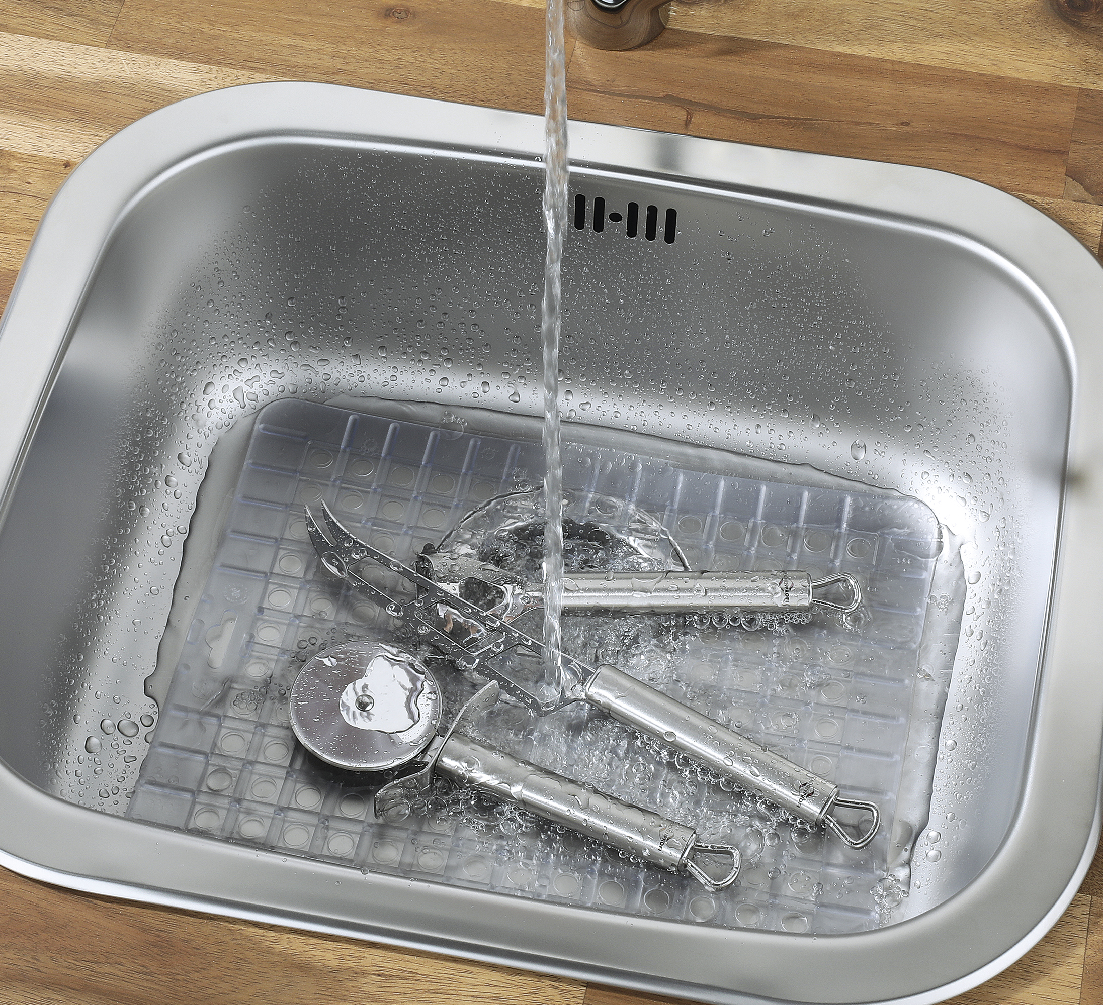 Zwischen ihren Einsätzen tauchen Kochmesser, Pizzaschneider, Sparschäler & Co. regelmäßig im Spülbecken ab. So weit, so sauber. Der Haken: Im Laufe der Zeit können diese und andere spitze Küchenwerkzeuge Kratzer auf der Oberfläche Ihres Beckens hinterlassen. Um dies zu verhindern, hat KÜCHENPROFI die rutschfeste Spülbeckeneinlage entwickelt. Sie schützt den Boden des Waschbeckens und verhindert gleichzeitig, dass empfindliches Geschirr oder Gläser diesem zu nah kommen und Schaden nehmen. Dank der Löcher fließt das Wasser rasch ab. Der clevere Helfer aus hochwertigem Kunststoff ist hitzebeständig bis 60 °C und spülmaschinenfest.