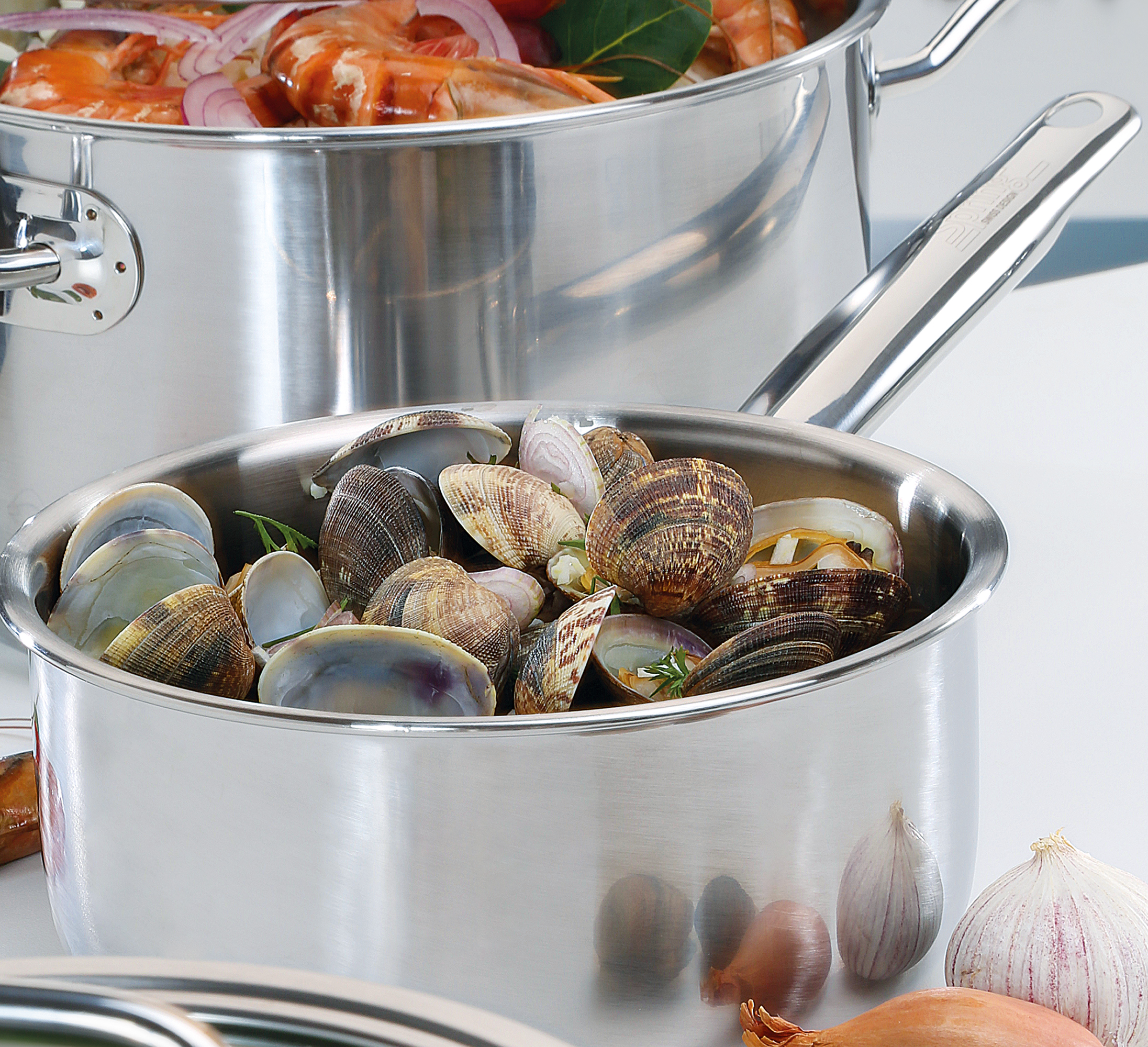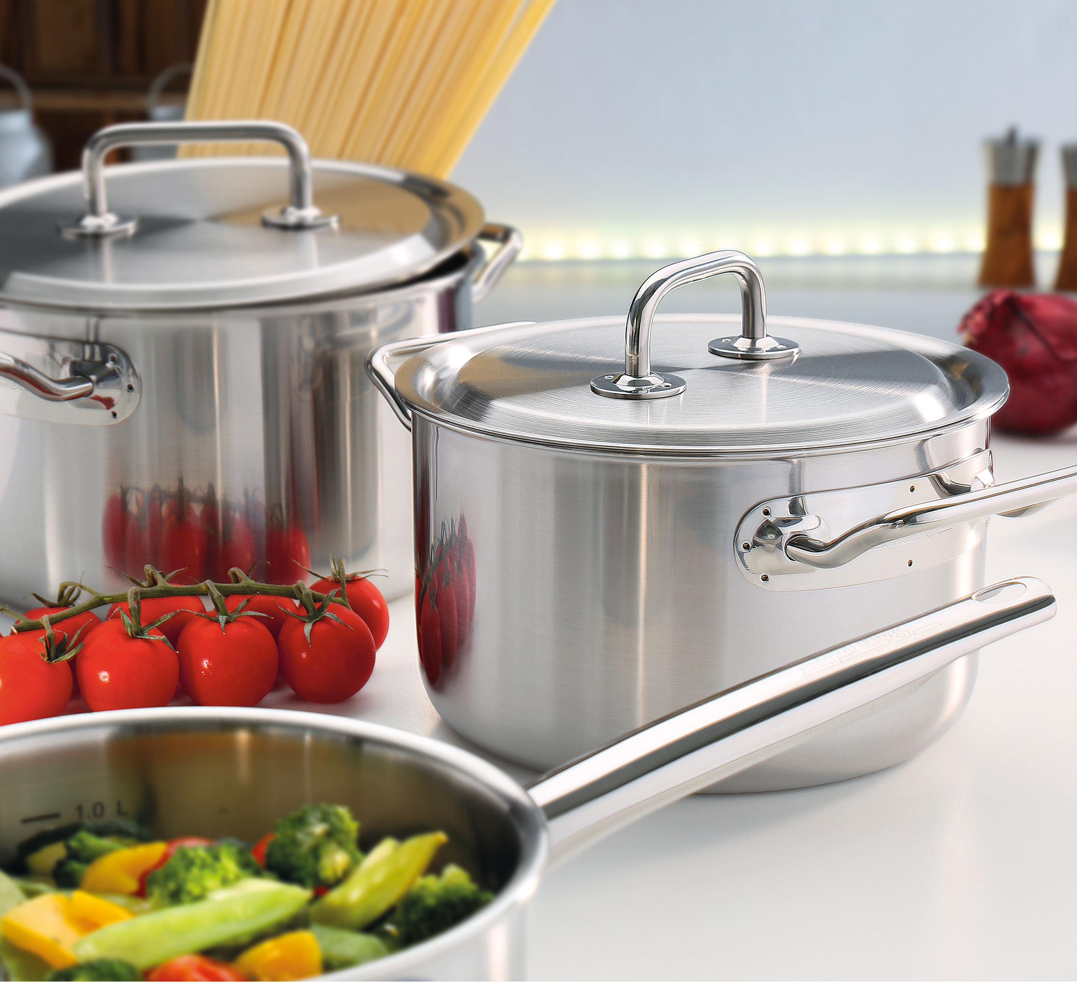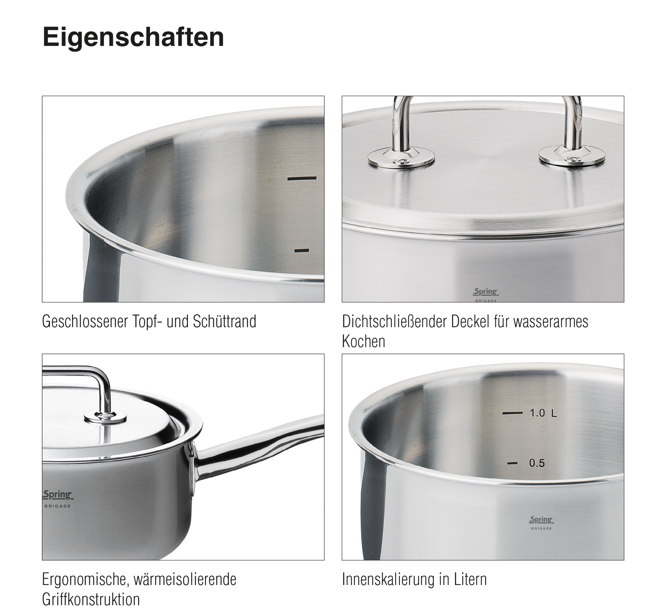Eine perfekte Mahlzeit beginnt mit dem richtigen Equipment. Die Topf-Serie BRIGADE PREMIUM von SPRING ist da die ideale Wahl. Mit der cleveren Kombination von Funktion und Design sind Profis und ambitionierte Hobbyköche gut aufgestellt. Das 5-Lagen-Mehrschichtmaterial leitet die Wärme schnell und gleichmäßig bis zum Topfrand weiter. Sie sparen Zeit und Nerven – da Sie sich auf ein überzeugendes Ergebnis verlassen können. Der Topfdeckel mit dem stabilen Griff sitzt passgenau und ermöglicht ein wasserarmes, schonendes Garen, so dass Brokkoli, Zuckerschoten & Co. ihre Vitamine und die frische Farbe behalten. Auch mit den weiteren Eigenschaften punktet die Serie – der geschlossene Topfrand lässt Korrosion keine Chance, die handlichen Griffe sind wärmeisoliert und bleiben daher ganz cool, und die Innenskalierung ermöglicht das Abmessen direkt im Topf. Die gesamte Kochbrigade ist für alle Herdarten inklusive Induktion geeignet und spülmaschinenfest.