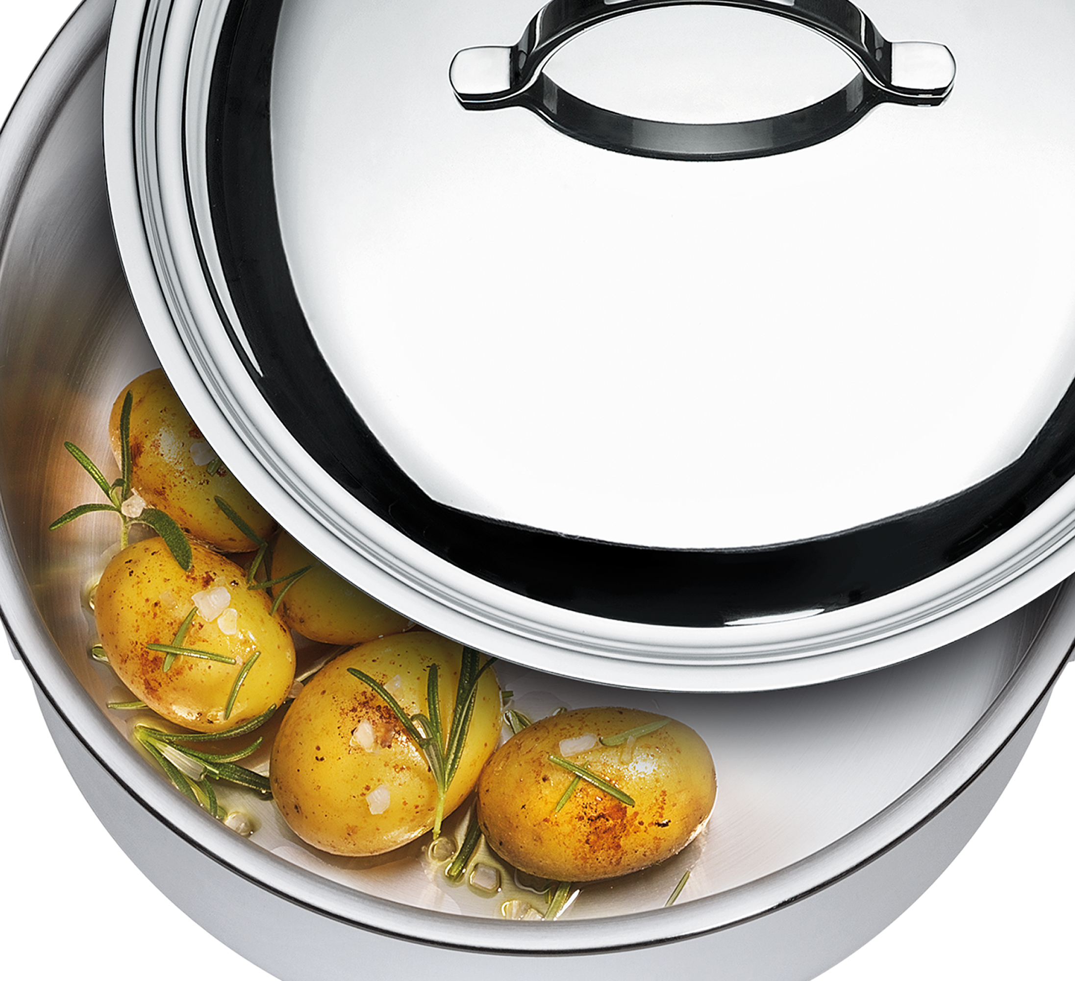 Material: 5-Lagen-Mehrschichtmaterial mit Außenschicht aus induktionstauglichem Edelstahl 18/0, innen Edelstahlschicht 18/10 und dreifachem Aluminiumkern. Geeignet für sämtliche Herdarten inklusive Induktion. Backofen- und spülmaschinenfest.