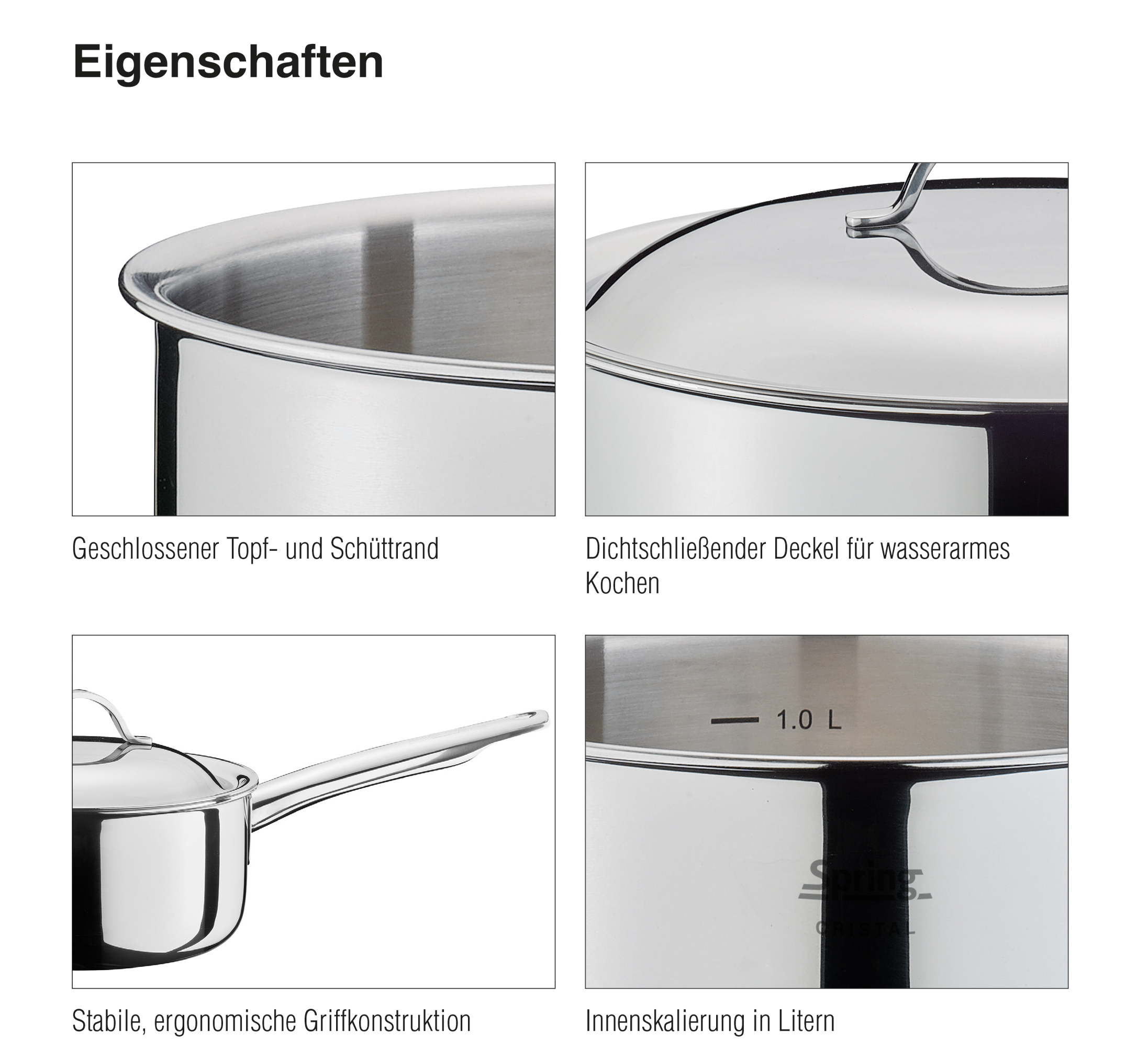 Der Edelstein unserer Topf-Serien. Klar in der Form, unabhängig von Modetrends setzt CRISTAL von SPRING Maßstäbe in der Küche. Die Oberfläche aus hochglanzpoliertem Edelstahl fällt sofort angenehm ins Auge. Innen kommen nochmals Edelstahl und ein dreifacher Aluminiumkern zum Einsatz. Diese 5 Schichten ermöglichen einen Rundum-Kocheffekt, die Wärme verteilt sich optimal im ganzen Topf und die Zutaten werden schonend gegart. So bleiben die Vitamine und der Geschmack erhalten. Darüber freuen sich Ihre Gäste, wenn Sie zarten Rinderbraten, eine mediterrane Gemüse-Kasserolle mit Basilikum und Thymian oder gedämpften Fisch mit Chili, Ingwer und Sherry servieren. Der geschlossene Topfrand schützt vor Korrosion, damit Sie noch viele Rezepte ausprobieren können. Die Serie Cristal ist für alle Herdarten geeignet, inklusive Induktion.