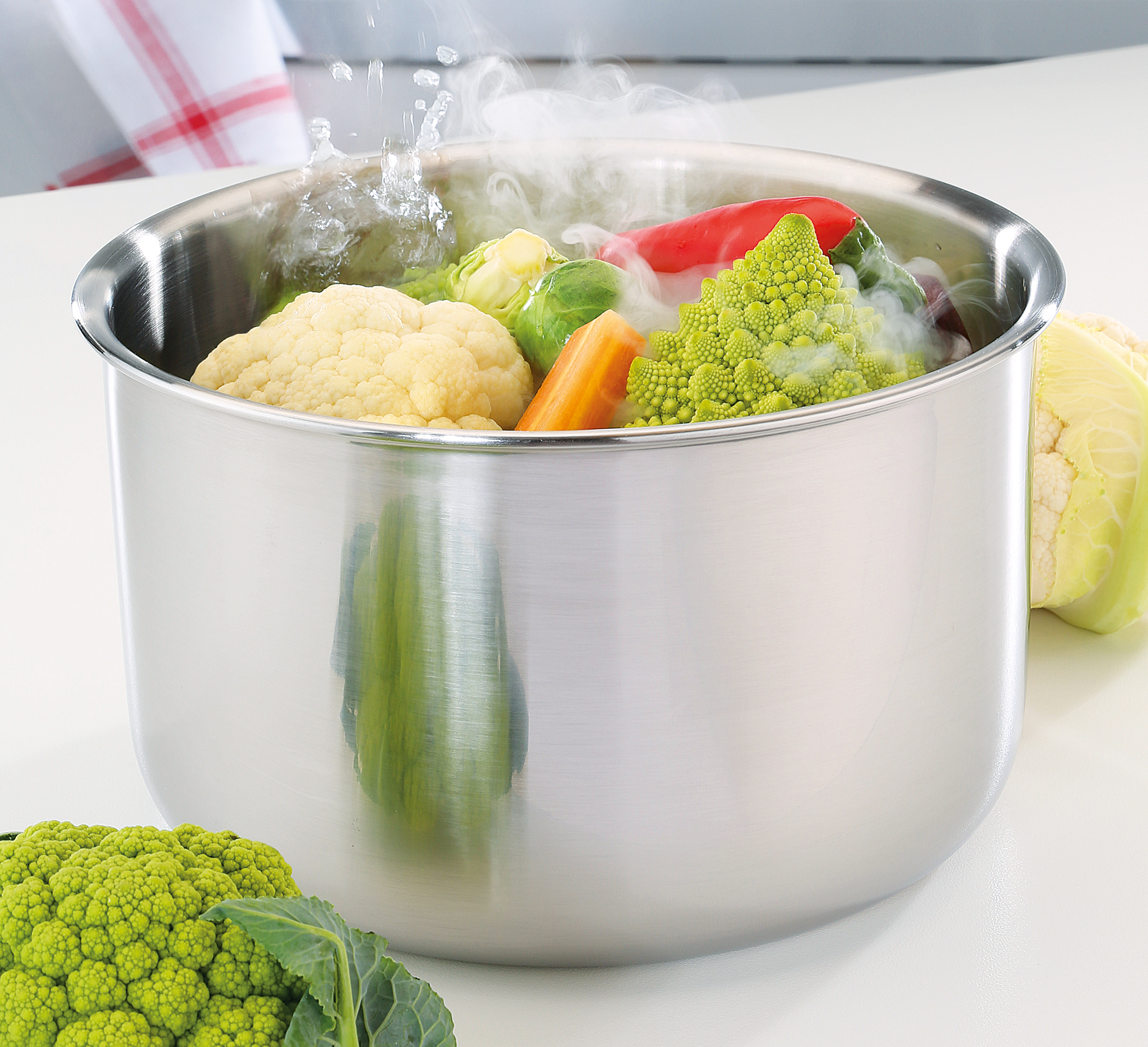 Material: 5-Lagen-Mehrschichtmaterial mit Außenschicht aus induktionstauglichem Edelstahl 18/0, innen Edelstahlschicht 18/10 und dreifachem Aluminiumkern. Geeignet für sämtliche Herdarten inklusive Induktion. Spülmaschinenfest.