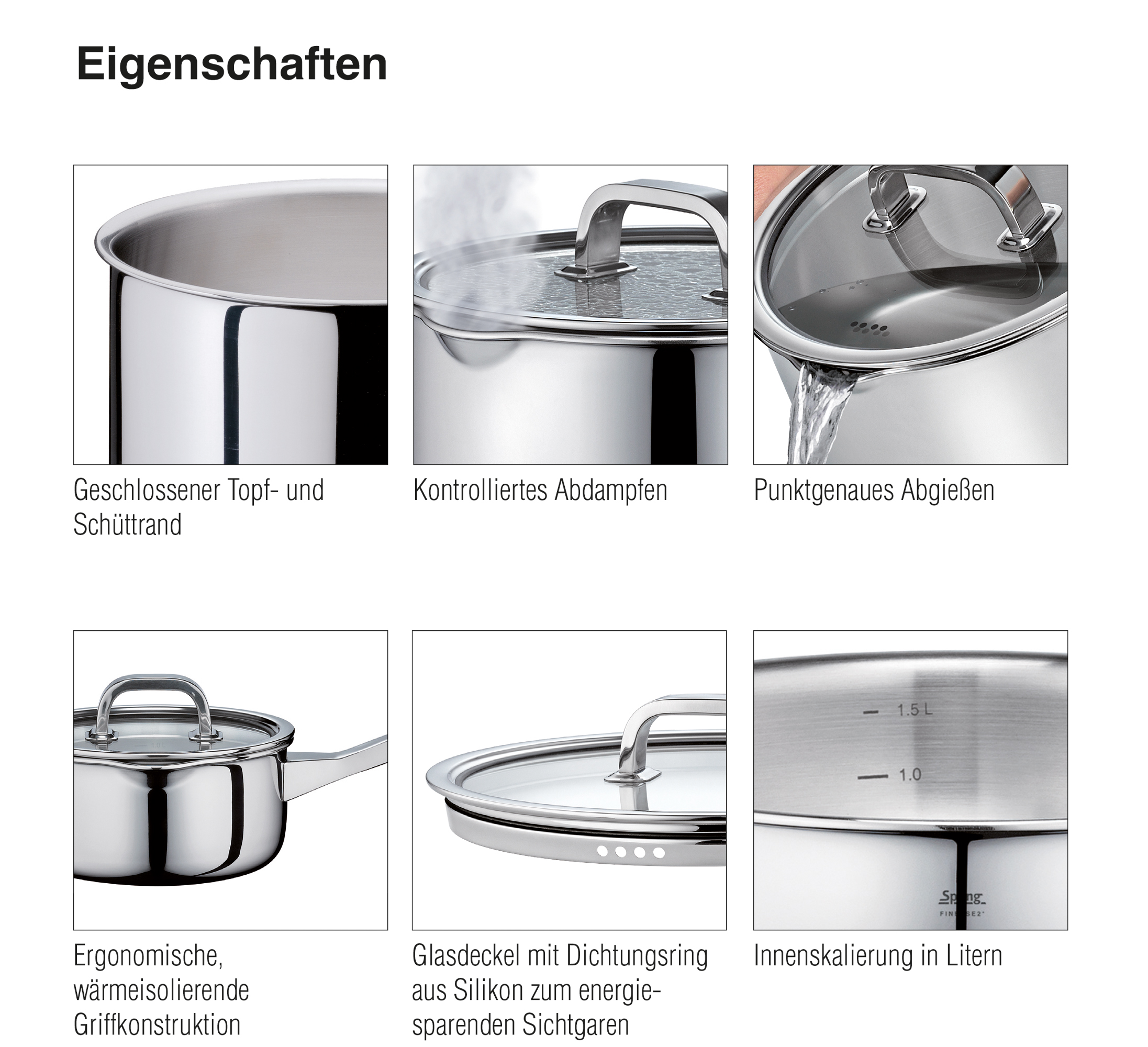 Eine feine Idee! SPRING serviert Ihnen mit der Topf-Serie FINESSE2+ die perfekte Mischung aus zeitlosem Design und hoher Funktionalität. Die vielseitigen Töpfe bewähren sich Tag für Tag, sowohl zu Hause als auch in der Sterneküche. Ihre köstlichen Kreationen garen gleichmäßig, zugleich sparen Sie Zeit und Energie. Das 5-Lagen Mehrschichtmaterial leitet die Wärme optimal vom Boden bis in die Topfwand. Der robuste Glasdeckel schließt dank Silikondichtung besonders dicht und ermöglicht ein schonendes Garen auf Sicht mit wenig Wasser, und die Topf-Innenskala macht den Messbecher überflüssig. Die ergonomisch geformten, wärmeisolierenden Griffe liegen gut in der Hand, und eine speziell geformte Schüttmulde sorgt dafür, dass beim Ausgießen nichts danebengeht. Die Töpfe sind für alle Herdarten inklusive Induktion geeignet und spülmaschinenfest. Die Stielkasserolle bewegt sich zwischen Topf und Pfanne, das macht sie so flexibel einsetzbar. Vom Erwärmen von Milch über das Montieren oder Reduzieren von Saucen bis zum Aufwärmen kleiner Portionen ist alles drin.