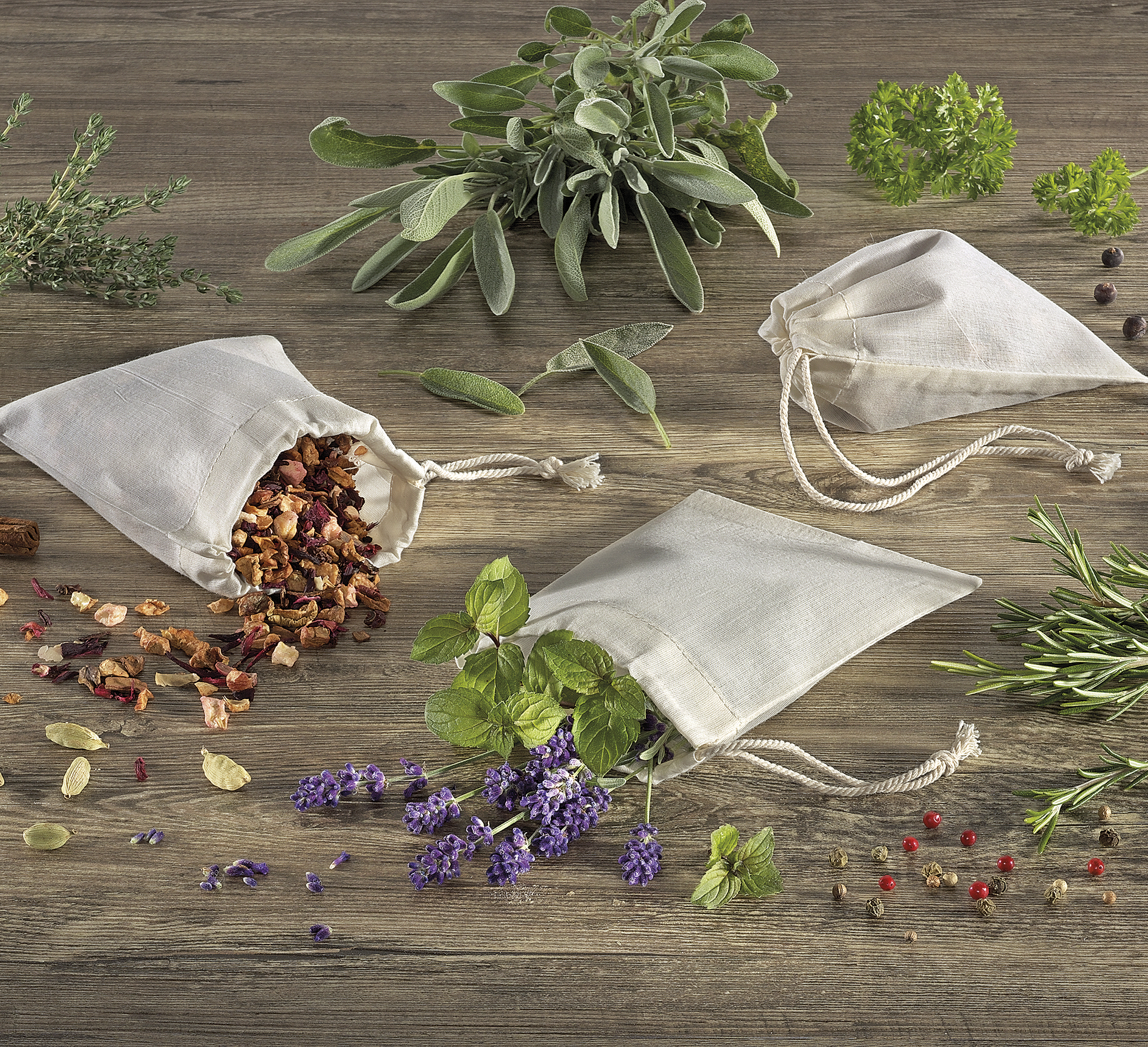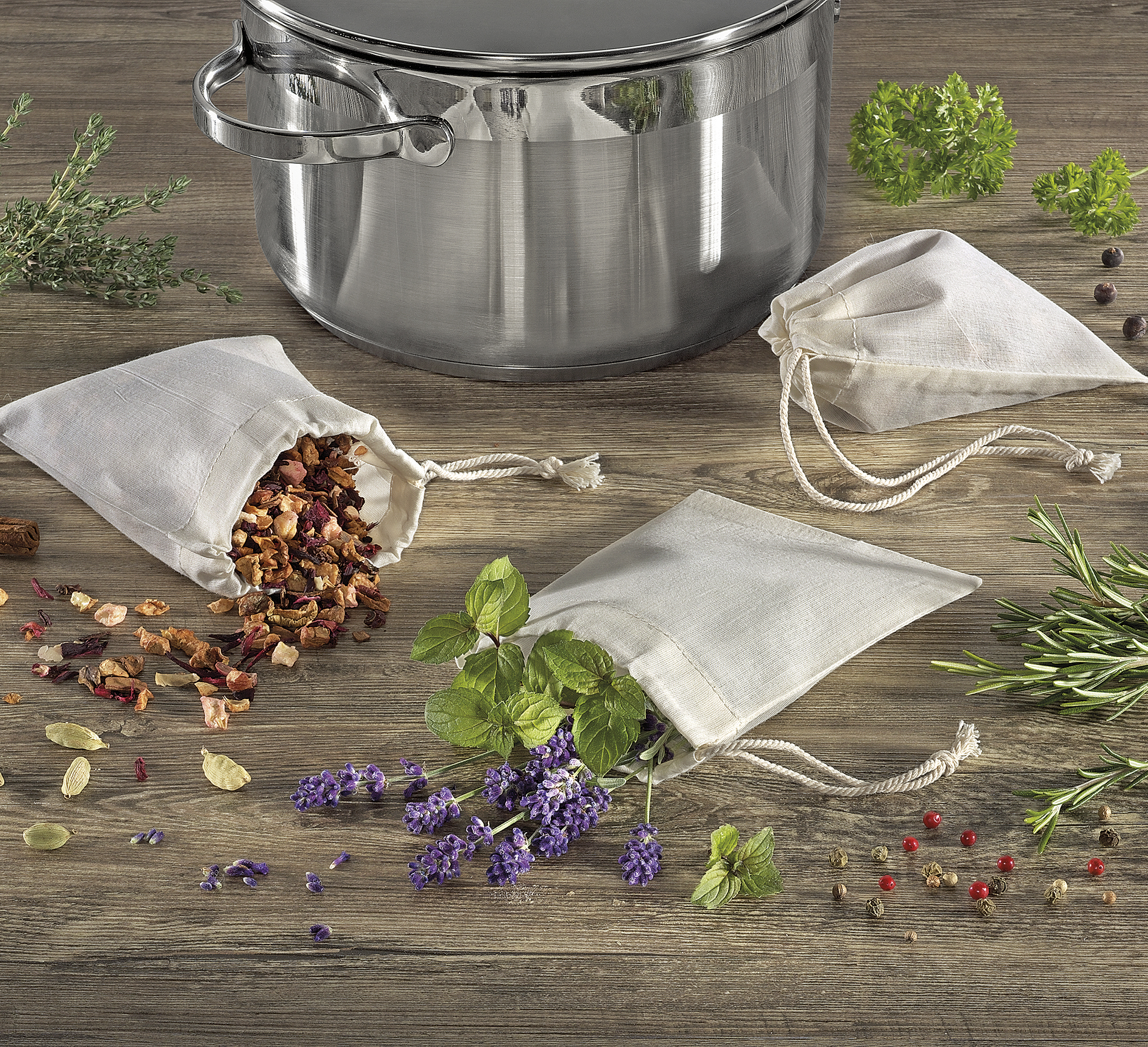 Da ist das Aroma in trockenen Tüchern. Die wiederverwendbaren Beutel von KÜCHENPROFI sind ideal, wenn Sie Ihr Bouquet Garni für Fonds, Suppen, Soßen und Eintöpfe individuell zusammenstellen möchten. Einfach den Beutel mit Kräutern füllen, zubinden und mitkochen. Ihre Speisen nehmen das Aroma an, Gewürzpartikel werden zurückgehalten. Auch für losen Tee eignen sich die Beutel bestens. Sie sind aus reiner Baumwolle gefertigt und können in der Maschine gewaschen werden.