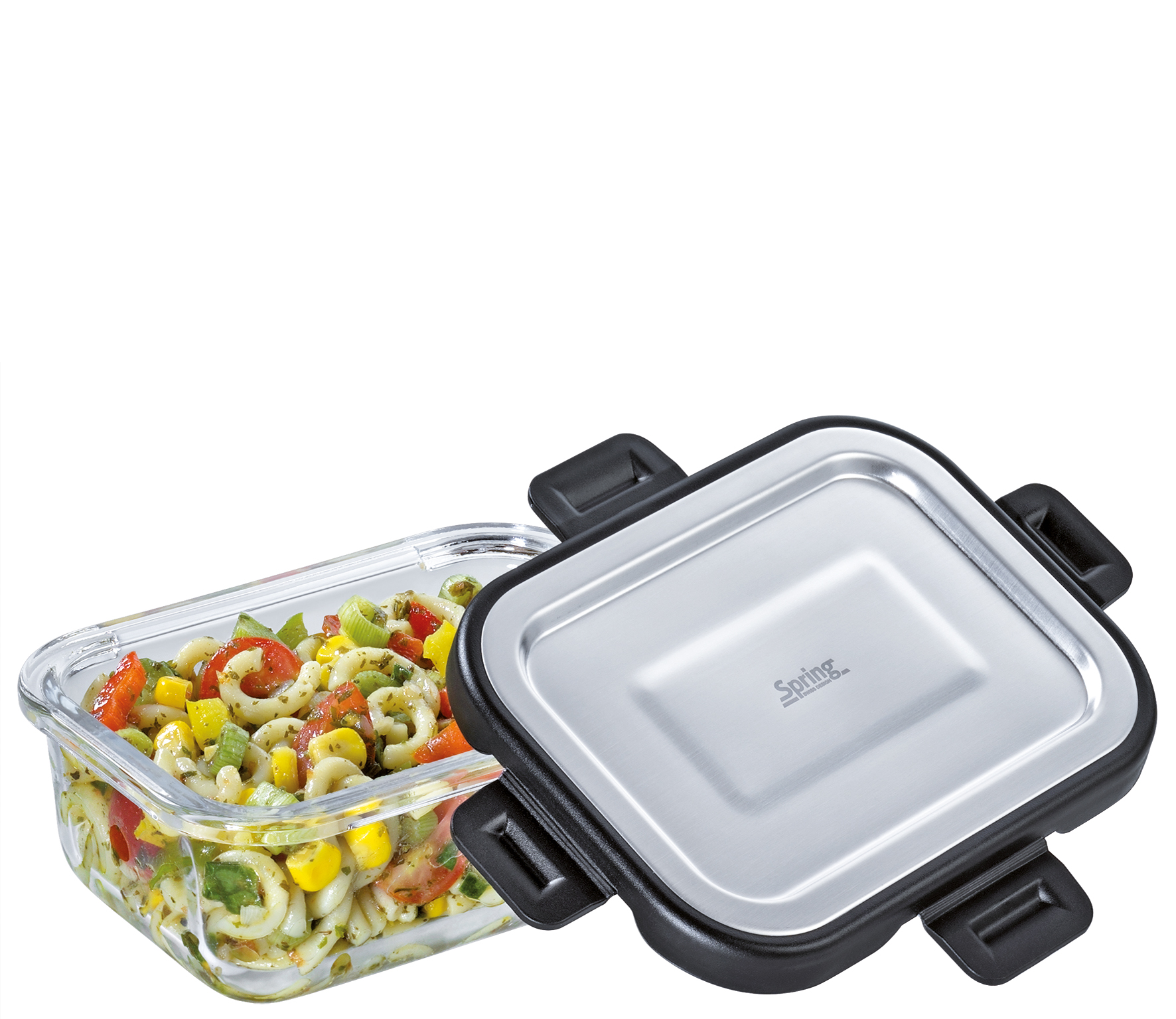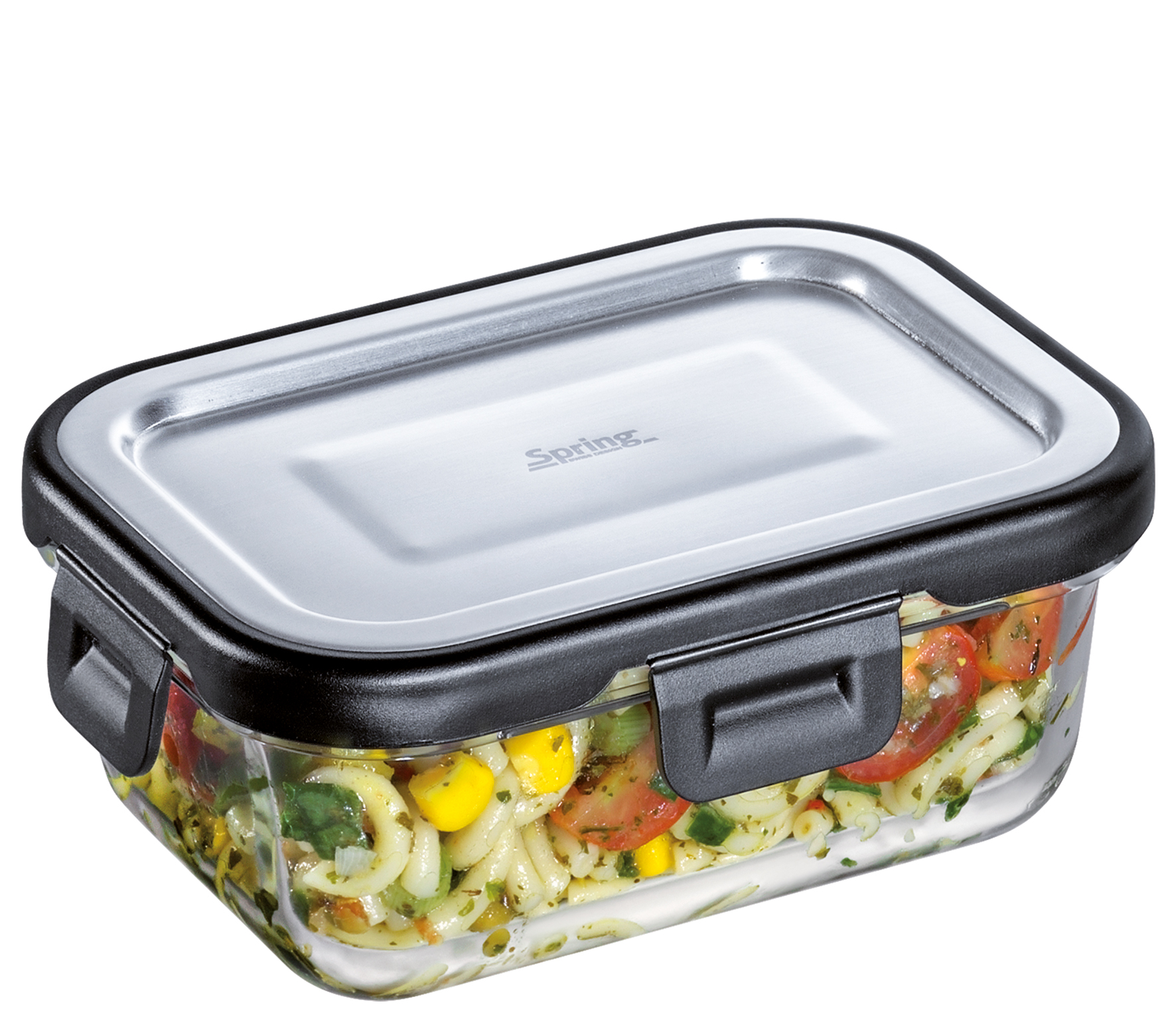 Morgens hält sie die Frühstücksflocken bereit, in der Mittagspause das Power-Vollkorn-Sandwich und den Apfel. Den Rest vom Abendessen bewahrt sie im Kühlschrank oder Gefrierfach auf, später geht es zum Aufwärmen in die Mikrowelle oder den Backofen. Viele Einsatzmöglichkeiten fließen bei der Vorratsdose FUSION 2+ von Spring zusammen. Das robuste Borosilikatglas hat einen fest schließenden Deckel aus Edelstahl mit Silikondichtung. An den Kunststoffgriffen transportieren Sie den Allrounder sicher. Zum Beispiel, wenn Sie Schinken-Käse-Muffins zum Party-Buffet der Freundin beisteuern.