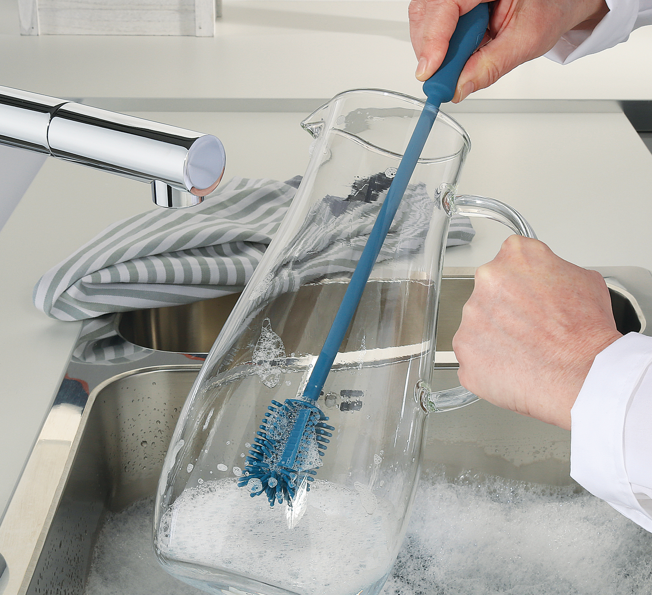 Öfter mal über den Tellerrand schauen. Mit den Küchenhelfern der Serie TREND weckt KÜCHENPROFI die Lust aufs Kochen und Experimentieren. Damit der Spaß auch nach dem Kochen noch besteht, kommt die Spülbürste in bunten Farben daher und bringt Pep in Ihre Küche. Mit dem langen Stiel taucht sie ihren kleinen Kopf mühelos in schmale Öffnungen und lange Flaschenhälse. Sie reinigt Karaffen, Isolierflaschen und Vasen gründlich und kratzfrei.