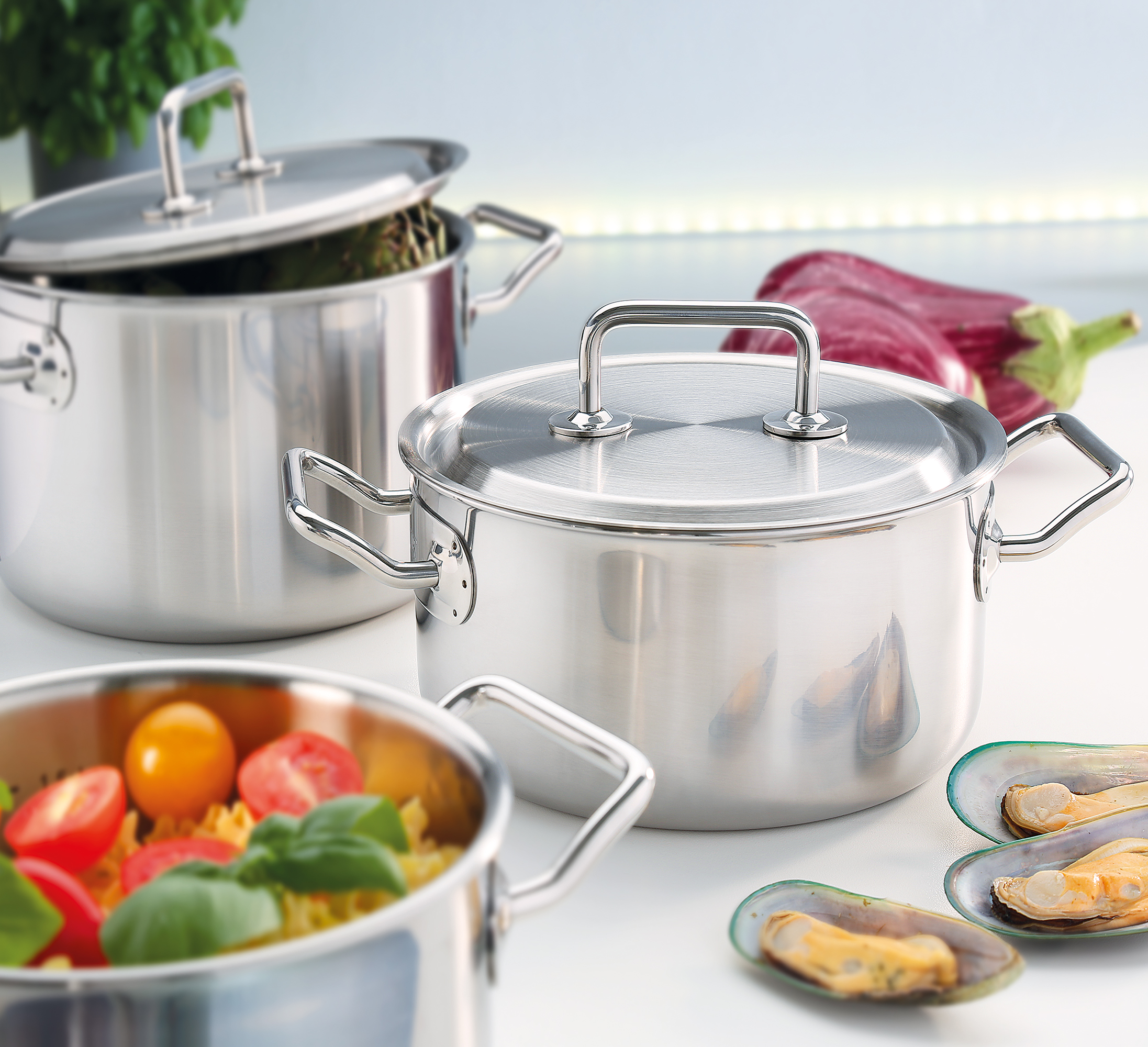 Eine perfekte Mahlzeit beginnt mit dem richtigen Equipment. Die Topf-Serie BRIGADE PREMIUM von SPRING ist da die ideale Wahl. Mit der cleveren Kombination von Funktion und Design sind Profis und ambitionierte Hobbyköche gut aufgestellt. Das 5-Lagen-Mehrschichtmaterial leitet die Wärme schnell und gleichmäßig bis zum Topfrand weiter. Sie sparen Zeit und Nerven – da Sie sich auf ein überzeugendes Ergebnis verlassen können. Der Topfdeckel mit dem stabilen Griff sitzt passgenau und ermöglicht ein wasserarmes, schonendes Garen, so dass Brokkoli, Zuckerschoten & Co. ihre Vitamine und die frische Farbe behalten. Auch mit den weiteren Eigenschaften punktet die Serie – der geschlossene Topfrand lässt Korrosion keine Chance, die handlichen Griffe sind wärmeisoliert und bleiben daher ganz cool, und die Innenskalierung ermöglicht das Abmessen direkt im Topf. Die gesamte Kochbrigade ist für alle Herdarten inklusive Induktion geeignet und spülmaschinenfest.