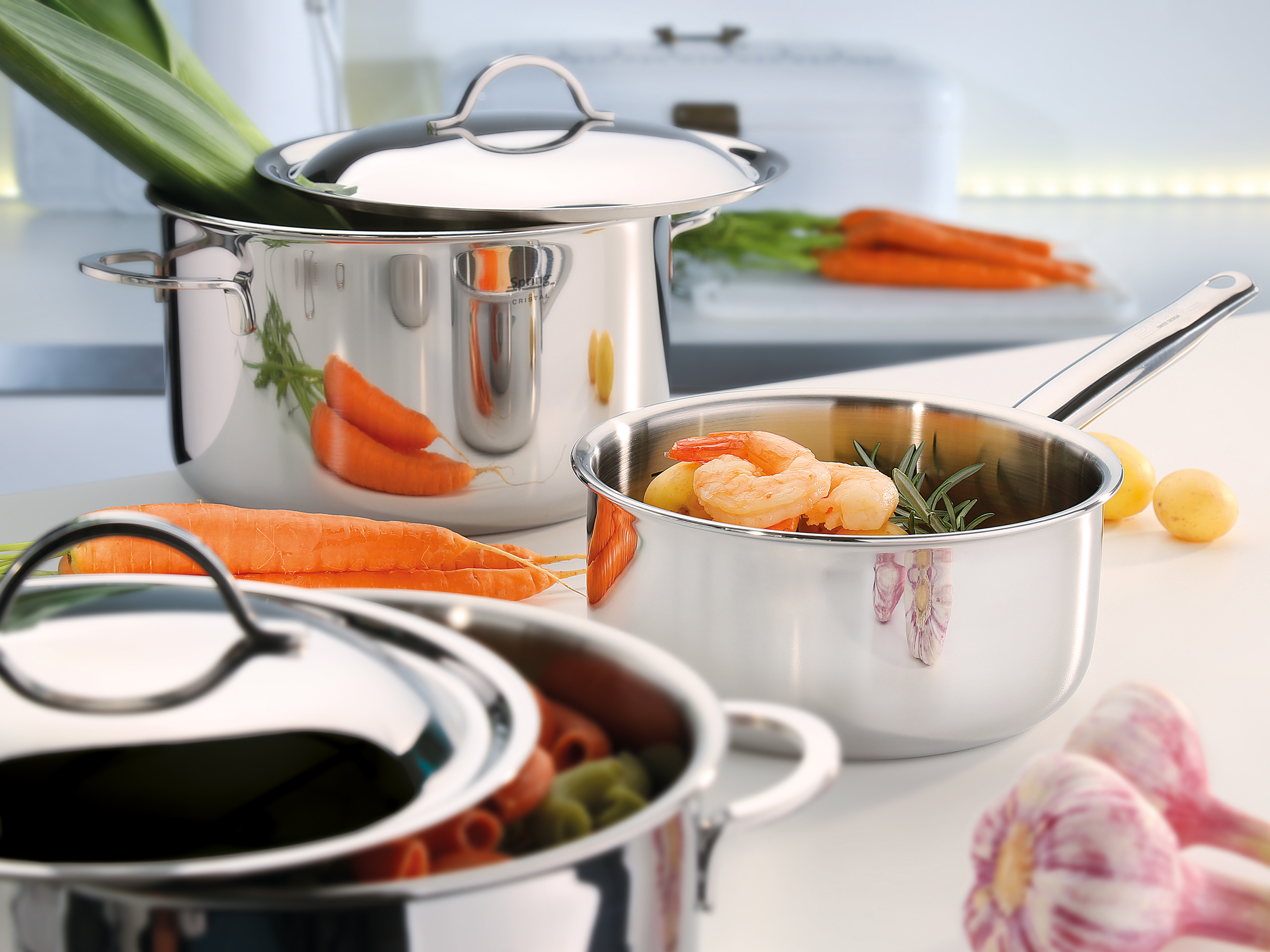 Der Edelstein unserer Topf-Serien. Klar in der Form, unabhängig von Modetrends setzt CRISTAL von SPRING Maßstäbe in der Küche. Die Oberfläche aus hochglanzpoliertem Edelstahl fällt sofort angenehm ins Auge. Innen kommen nochmals Edelstahl und ein dreifacher Aluminiumkern zum Einsatz. Diese 5 Schichten ermöglichen einen Rundum-Kocheffekt, die Wärme verteilt sich optimal im ganzen Topf und die Zutaten werden schonend gegart. So bleiben die Vitamine und der Geschmack erhalten. Darüber freuen sich Ihre Gäste, wenn Sie zarten Rinderbraten, eine mediterrane Gemüse-Kasserolle mit Basilikum und Thymian oder gedämpften Fisch mit Chili, Ingwer und Sherry servieren. Der geschlossene Topfrand schützt vor Korrosion, damit Sie noch viele Rezepte ausprobieren können. Die Serie Cristal ist für alle Herdarten geeignet, inklusive Induktion.
