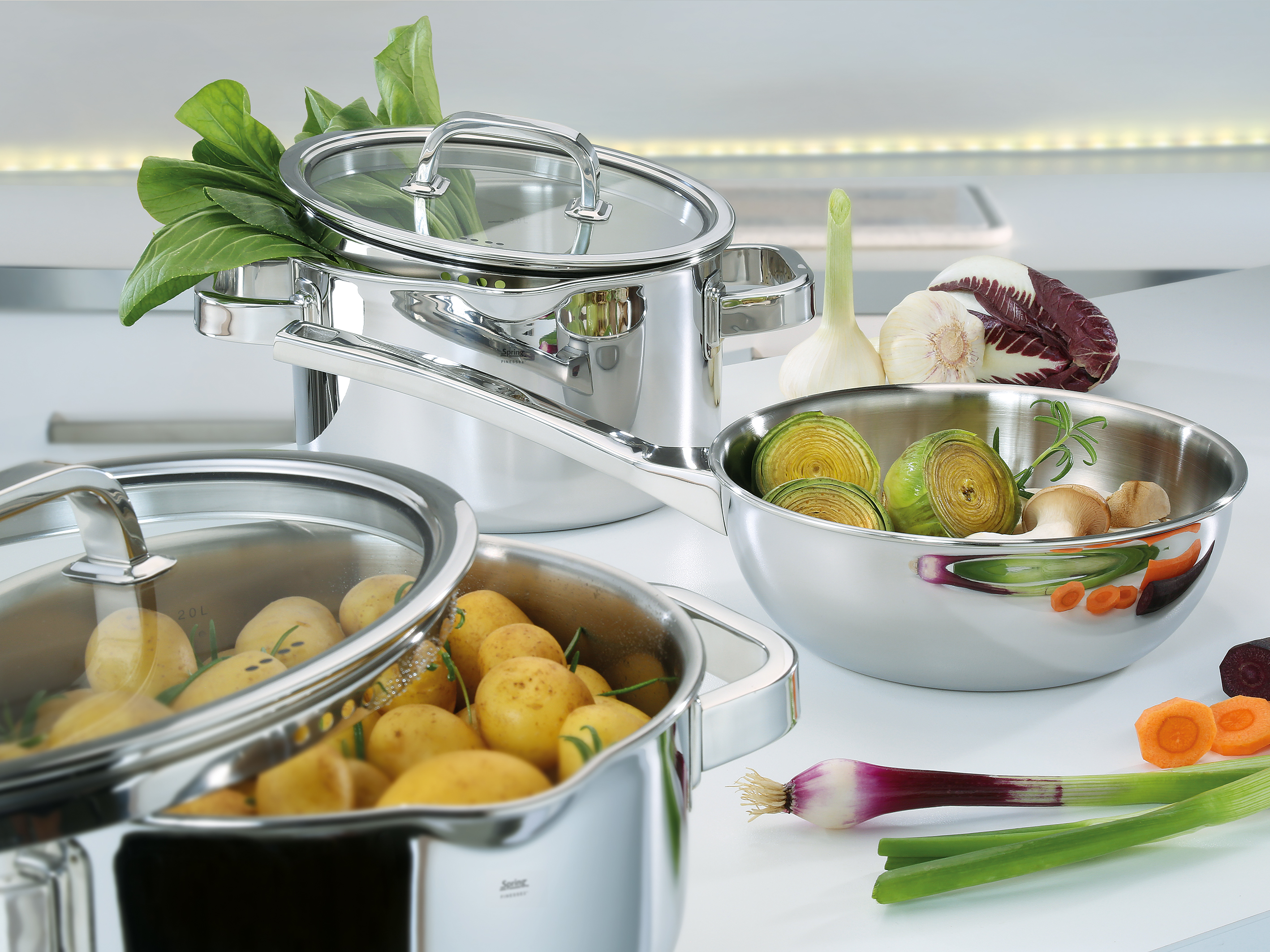 Eine feine Idee! SPRING serviert Ihnen mit der Topf-Serie FINESSE2+ die perfekte Mischung aus zeitlosem Design und hoher Funktionalität. Die vielseitigen Töpfe bewähren sich Tag für Tag, sowohl zu Hause als auch in der Sterneküche. Ihre köstlichen Kreationen garen gleichmäßig, zugleich sparen Sie Zeit und Energie. Das 5-Lagen Mehrschichtmaterial leitet die Wärme optimal vom Boden bis in die Topfwand. Der robuste Glasdeckel schließt dank Silikondichtung besonders dicht und ermöglicht ein schonendes Garen auf Sicht mit wenig Wasser, und die Topf-Innenskala macht den Messbecher überflüssig. Die ergonomisch geformten, wärmeisolierenden Griffe liegen gut in der Hand, und eine speziell geformte Schüttmulde sorgt dafür, dass beim Ausgießen nichts danebengeht. Die Töpfe sind für alle Herdarten inklusive Induktion geeignet und spülmaschinenfest. Gut aufgestellt sind Sie mit dem 5-teiligen Topfset, das neben klassischen Kochtöpfen auch einen Bratentopf und eine Sauteuse umfasst. Perfekt für ein Festmahl in großer Runde.
