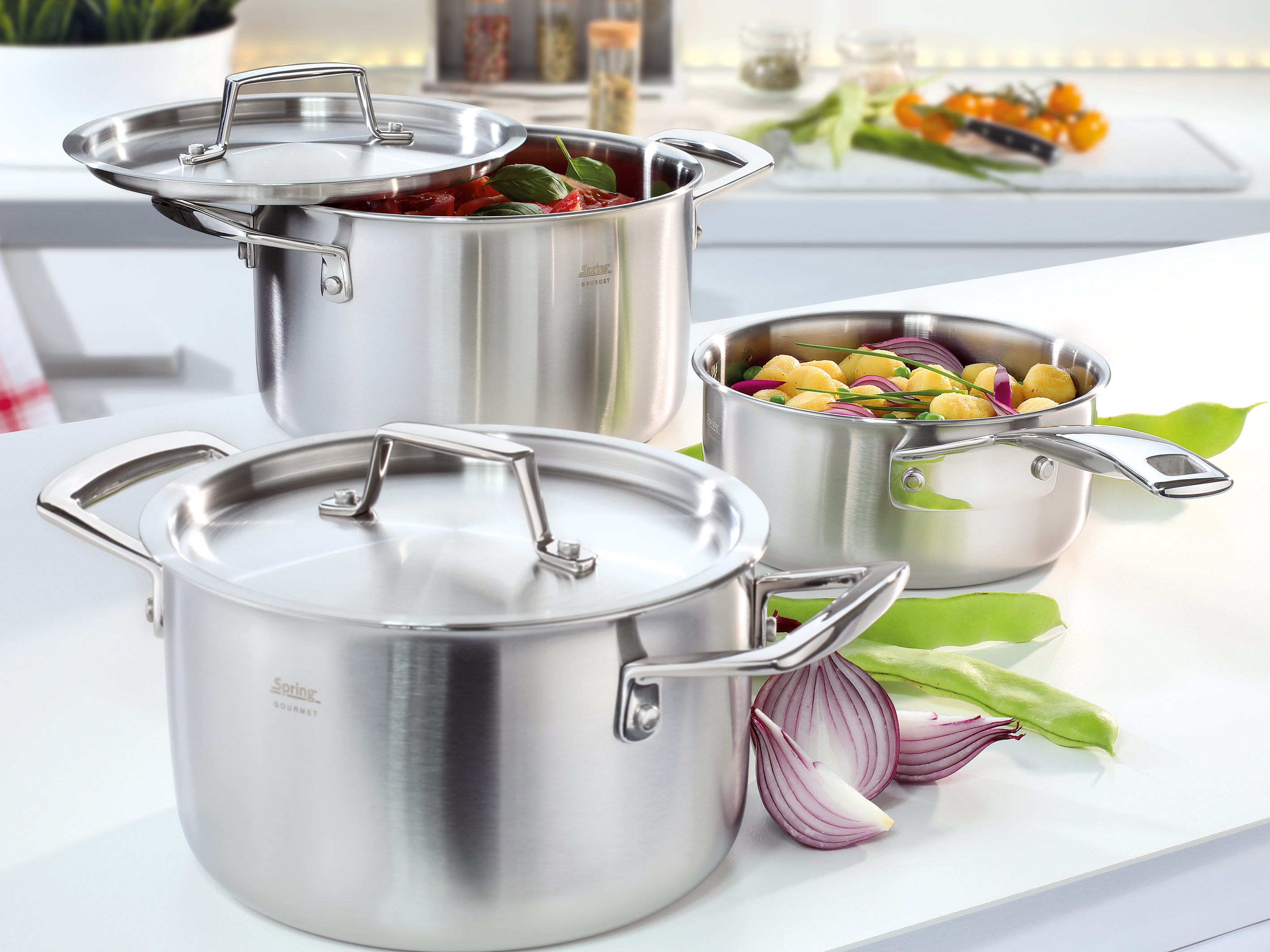 In der Gourmet-Küche stimmt jedes Detail, die einzelnen Komponenten ergeben ein stimmiges Ganzes. Diesen Prinzipien folgt SPRING mit seiner Topf-Serie GOURMET. Das bewährte Mehrschichtmaterial leitet die Wärme optimal bis in den letzten Winkel weiter. Dank des Rundum-Kocheffekts werden Ihre Speisen perfekt gegart. Der passgenaue, fest schließende Deckel ermöglicht ein schonendes Garen mit wenig Flüssigkeit. Vitamine und Geschmack bleiben erhalten. Praktisch: Das benötigte Wasser messen Sie mit Hilfe der Innenskalierung direkt im Topf ab. Der geschlossene Schüttrand garantiert ein kleckerfreies Ausgießen. Auch optisch sammelt das Kochgeschirr aus gebürstetem Edelstahl Sterne.
