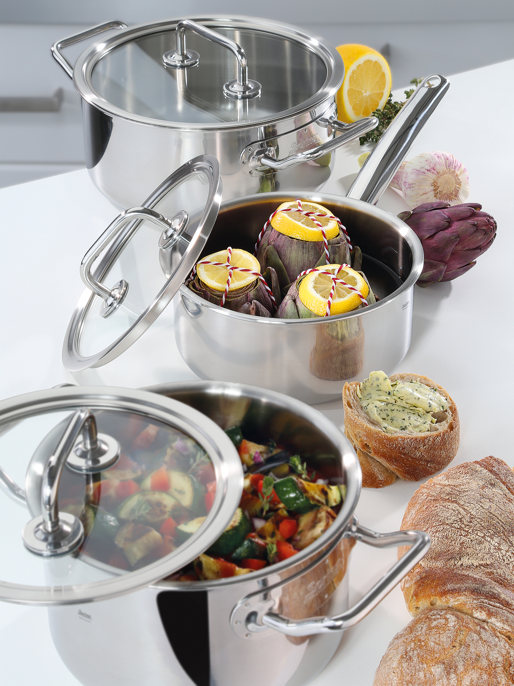 Innovative Ideen für Koch- und Tischkultur ziehen sich seitdem wie ein roter Faden durch die erfolgreiche Unternehmensgeschichte. Mit der Erfindung ihres Fondue Bourguignonne legen die Schweizer Brüder 1953 den Grundstein für den Siegeszug des „Kochen am Tisch“. 1977 bringt SPRING die ersten Gastronorm Chafing Dishes zum professionellen Kochen und Präsentieren auf den Markt. Und bereits seit 1994 verfügen unsere Kochgeschirrserien über induktionsfähiges Mehrschichtmaterial.