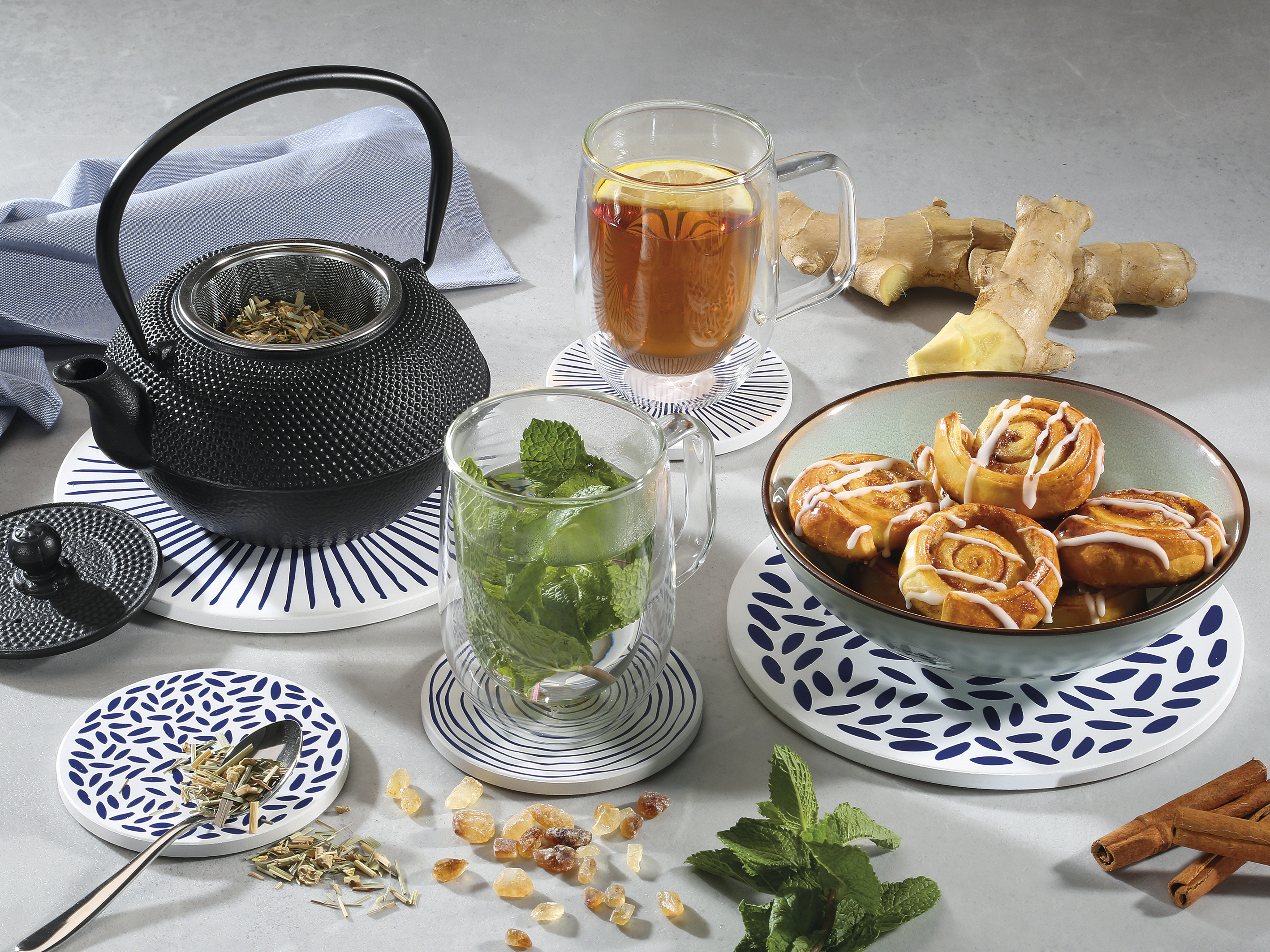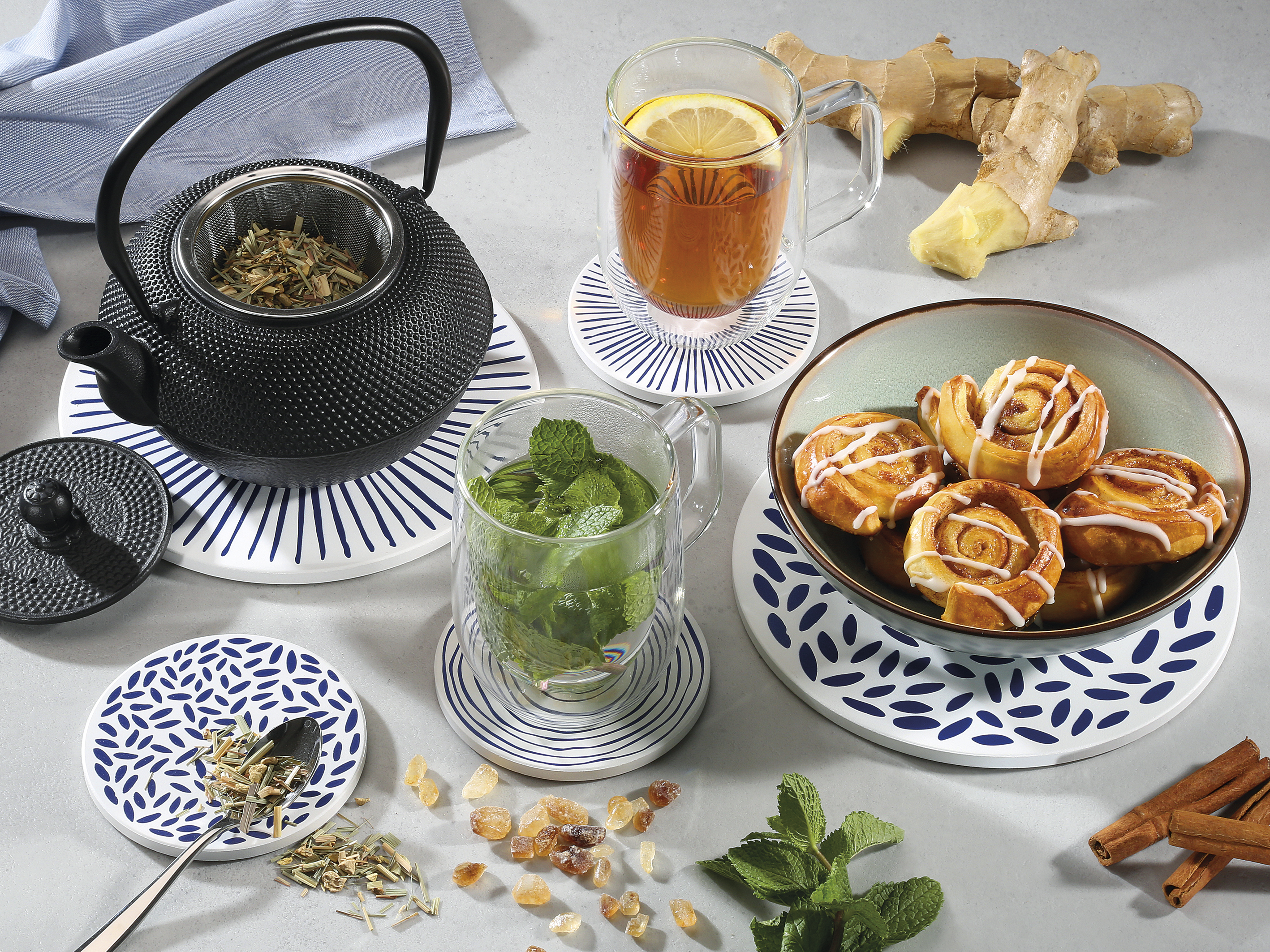 Klar wie die Polarluft ist das Design der Untersetzer NORDIC von ZASSENHAUS. Die blauen Linien, Tropfen und Kreise auf weißem Grund setzen frische Akzente auf Ihrem Tisch. Die dekorativen Untersetzer sind aus Keramik gefertigt und haben einen Korkboden, der Oberflächen vor Verschmutzung, Kratzern und Hitze schützt. Die praktischen Accessoires sind hitzebeständig bis 180 °C und in verschiedenen Größen erhältlich. Sie passen unter die Teekanne, Tassen und die Schüssel mit den Kanelbullar, den schwedischen Zimtschnecken. Beim Familienfest finden Töpfe und Schüsseln auf den Untersetzern Platz, nach dem Anstoßen werden die Gläser darauf abgesetzt.