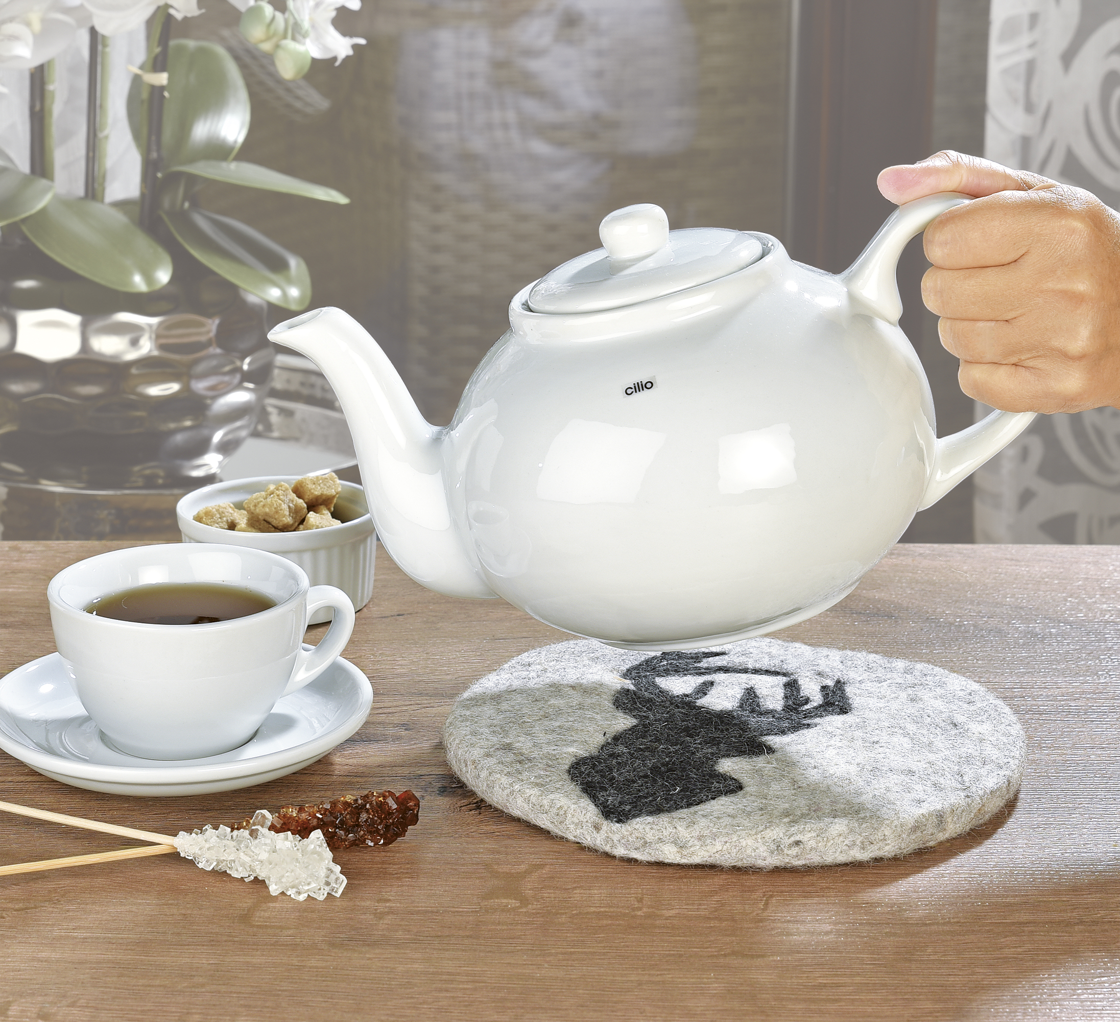 Gestatten? Unser Platzhirsch! Er setzt sich gegen heiße Töpfe, Pfannen, Tee- und Kaffeekannen durch und verteidigt Ihre empfindlichen Oberflächen. Der Untersetzer LANA von cilio ist im Rahmen eines Projektes entstanden, das Familien in Nepal unterstützt. Hergestellt wird das originelle Accessoire aus robuster Schafwolle in Handarbeit. Dabei werden die Prinzipien des Fairen Handels eingehalten. Für sein Engagement erhielt der Produzent mit Sitz in der Nähe von Kathmandu das Zertifikat der World Fair Trade Organisation (WFTO). Das Unternehmen übernimmt auch ökologische Verantwortung. So kommen beim Färben der hochwertigen Schafwolle ausschließlich im Labor getestete, azofreien Farbstoffe zum Einsatz.