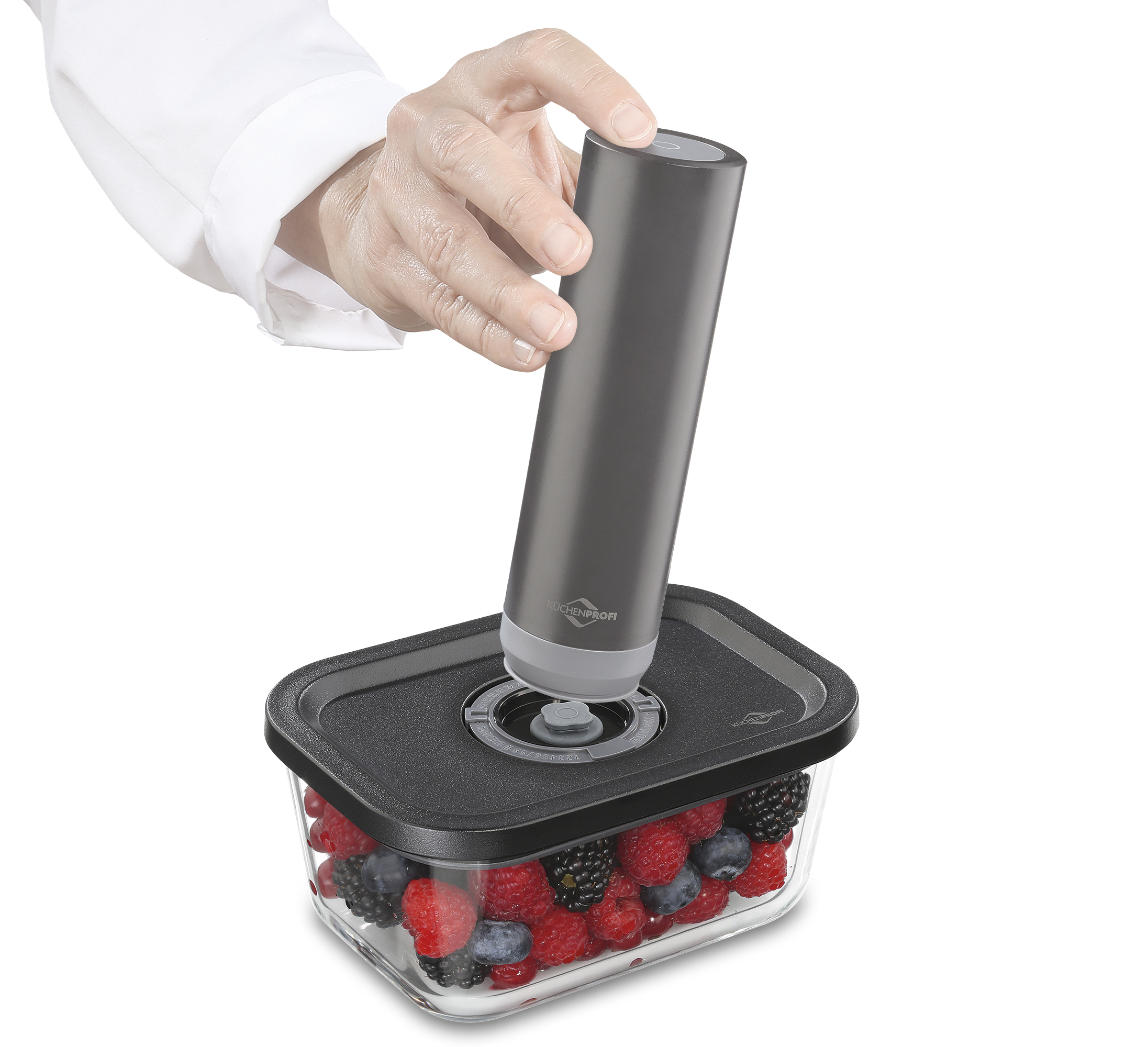 Bei der Vakuumbox EASYFRESH hat das KÜCHENPROFI-Team um die Ecke gedacht. Der praktische Behälter besitzt eine passgenaue Stelle zum Andocken der Vakuumpumpe. Zudem ist die Box aus Borosilikatglas besonders robust. Sie steckt nicht nur die Minusgrade in der Tiefkühltruhe weg, sondern darf - ohne Deckel - zum Erwärmen der Speisen direkt in die Mikrowelle. Der auslaufsichere Deckel mit Ventil und einstellbarer Datumsanzeige sitzt fest, wenn Sie die mit Sandwiches, Obst oder Salat gefüllte Vakuumbox zur Arbeit, zum Sport oder während der Fahrt in den Urlaub transportieren.