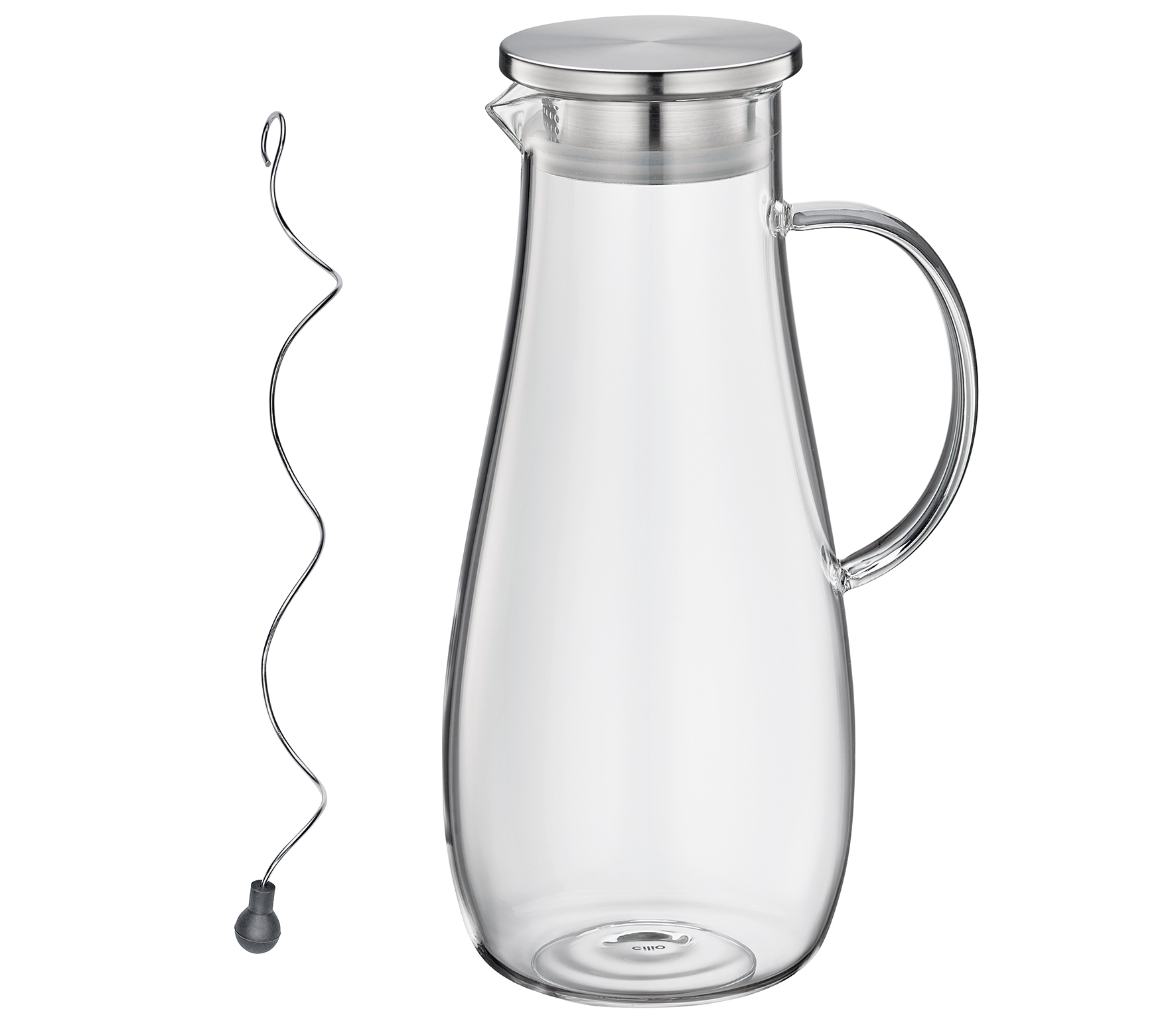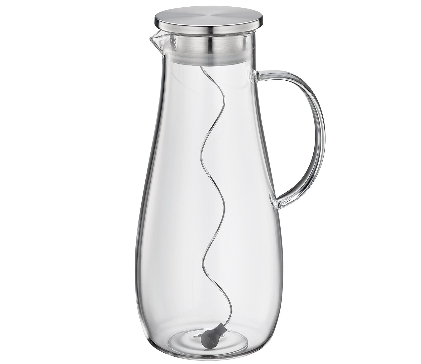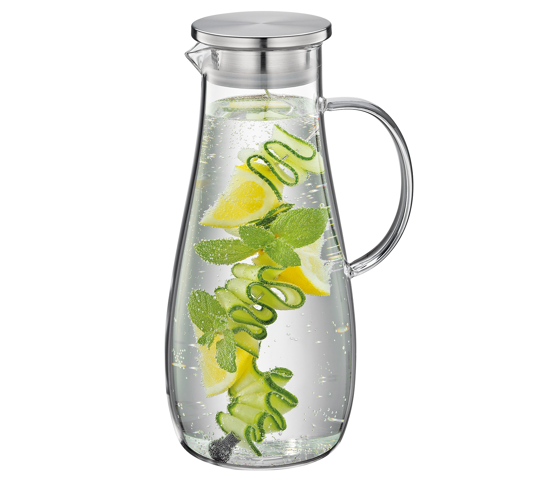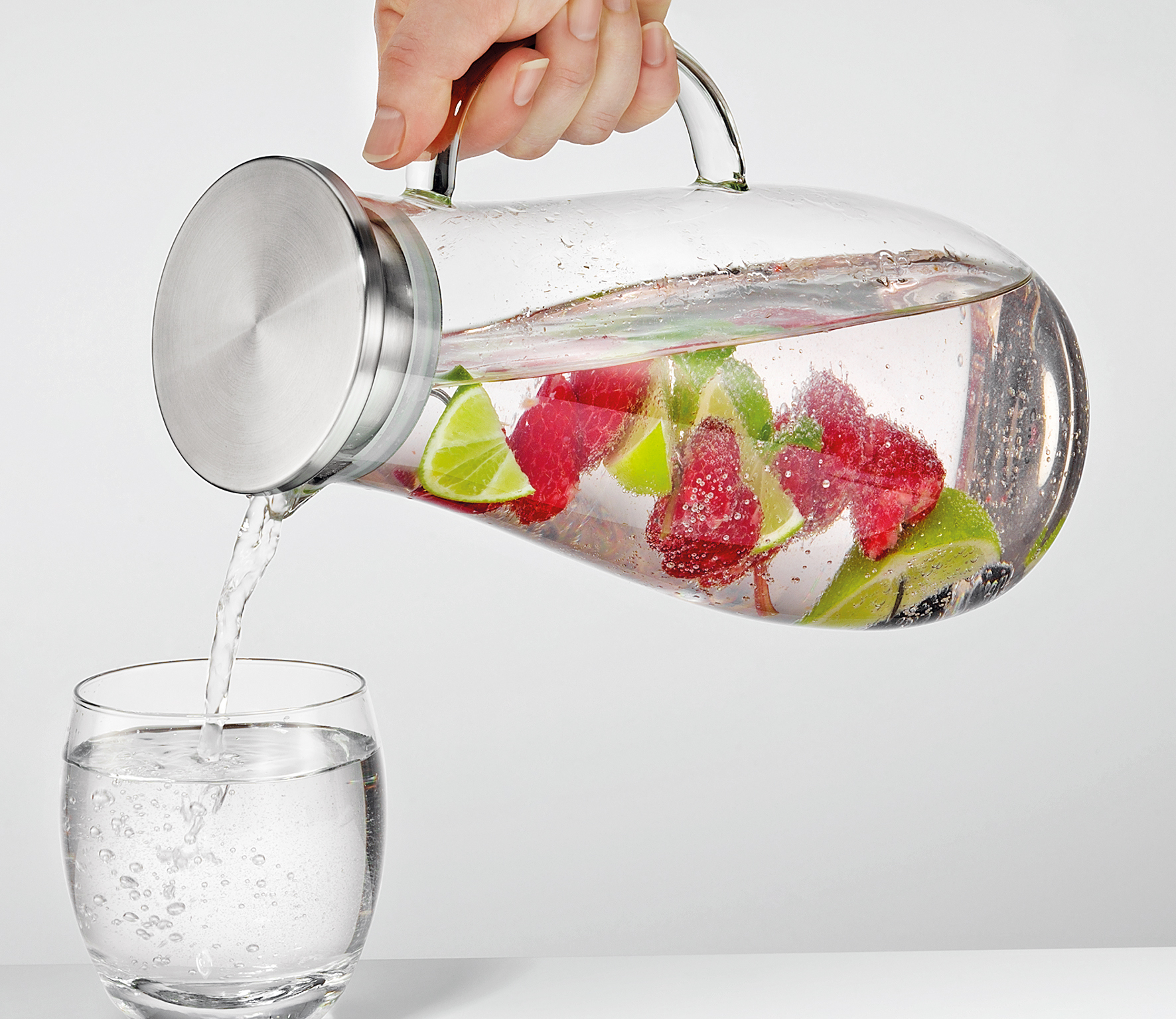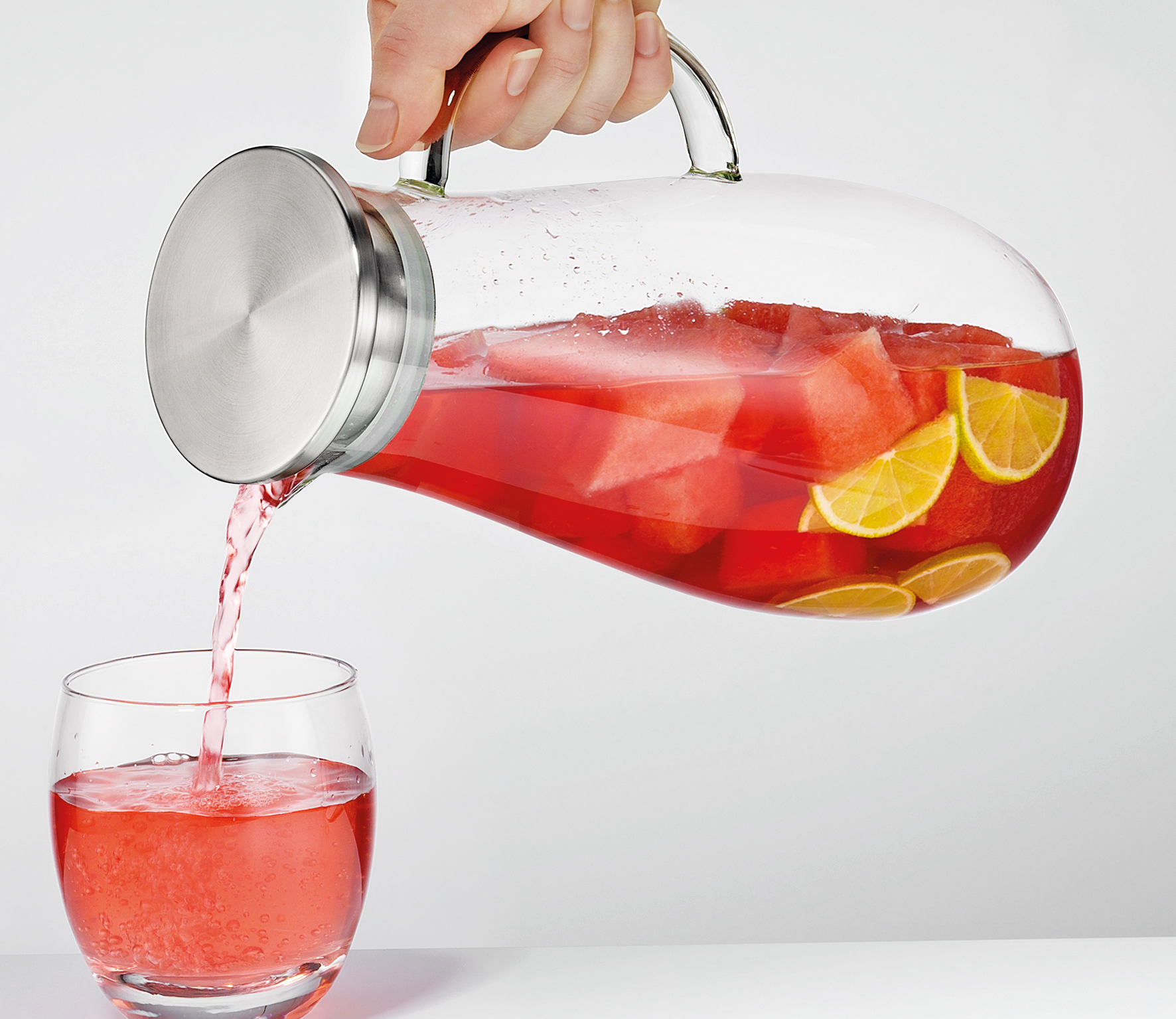 Um fit und gesund zu bleiben, benötigt unser Körper Flüssigkeit. Am besten 1,5 bis 2 Liter täglich. Das klappt mit der Wasserkaraffe TROPICANA von cilio locker. In dem schlanken Gefäß servieren Sie Wasser, Tee und Säfte stilvoll. Der Deckel mit zwei Ausgießern hält Insekten fern, der integrierte Filter verhindert, dass Eiswürfel und lose Früchte in Ihr Glas gelangen. Gerne in die Karaffe darf der separate Spieß, den Sie nach Lust und Laune mit Früchten und Kräutern bestücken können. Ihre Kids stehen nicht so auf Wasser? Wenn in der Karaffe saftige Himbeeren oder Ananaswürfel am Spieß warten, sieht die Sache gleich anders aus.