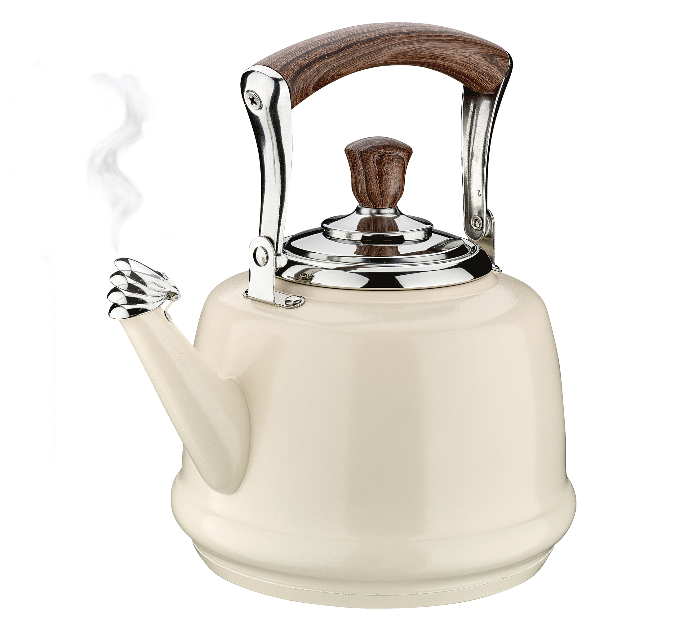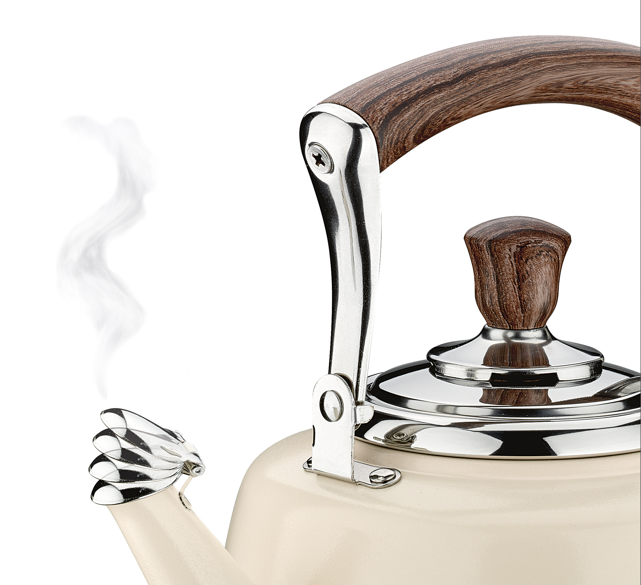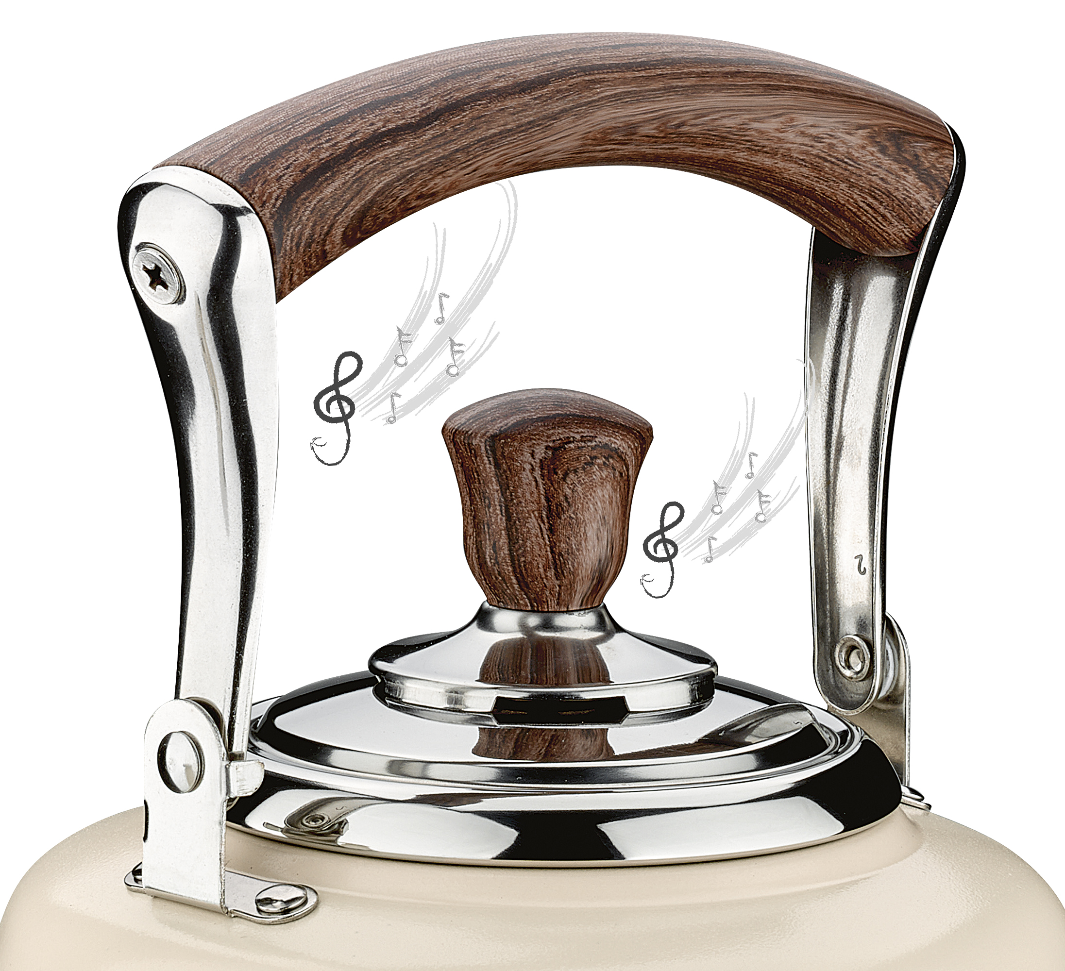 Wie edel ist der denn? Sehr! Der Wasserkessel BIANCO von cilio ist ein Hingucker in Ihrer Küche. Der Edelstahl ist cremefarben lackiert, die Griffe in Holzoptik runden den erstklassigen Look ab. Der Kessel lässt sich leicht befüllen, sein induktionsgeeigneter Kapselboden bringt das Wasser rasch zum Kochen. Spätestens, wenn die harmonische 2-Ton-Flöte im Deckel sich meldet, ist es Zeit, den Tee oder das Kaffeepulver für Ihr Lieblingsgetränk aus dem Schrank zu holen. Auch für die Zubereitung von Babynahrung ist der dekorative Wasserkessel geeignet. Der wärmeisolierende Griff sorgt für eine sichere Handhabung.