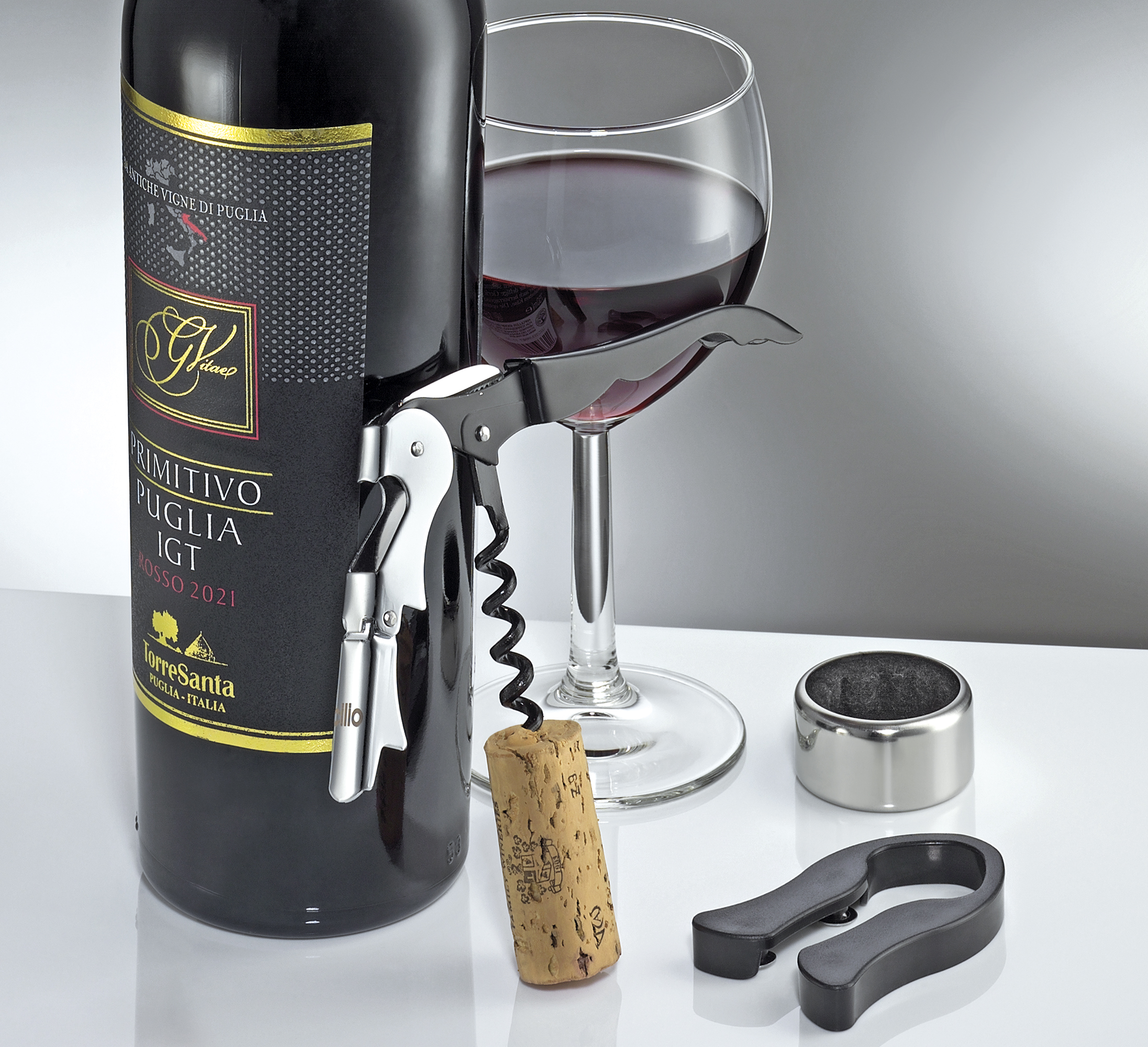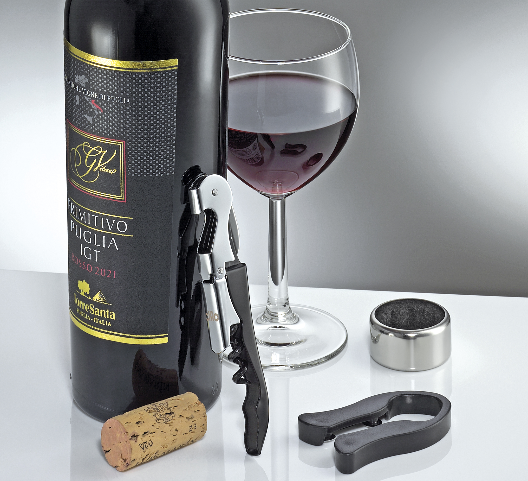 Folienschneider und einen Tropfenfänger zum sauberen Einschenken.