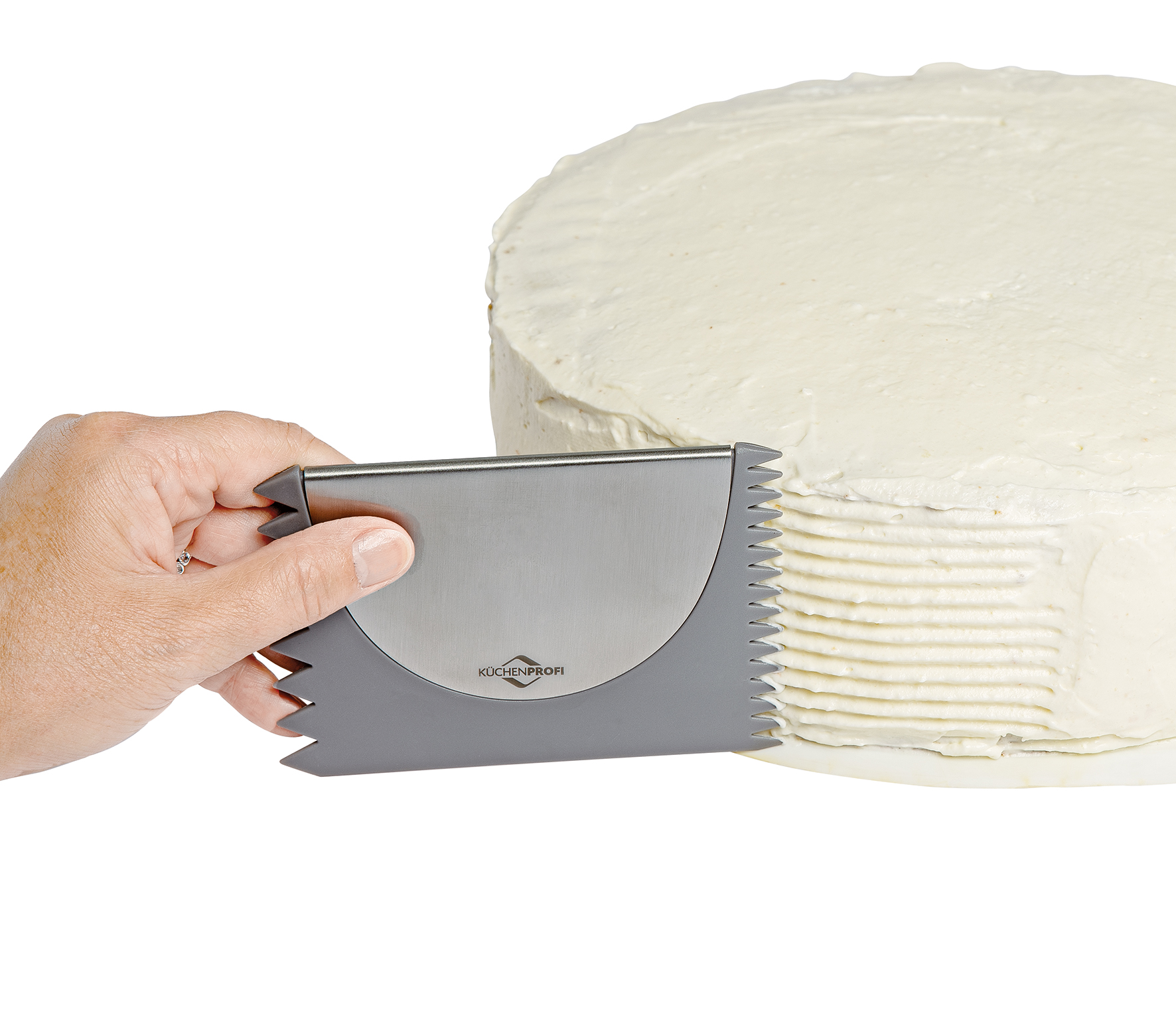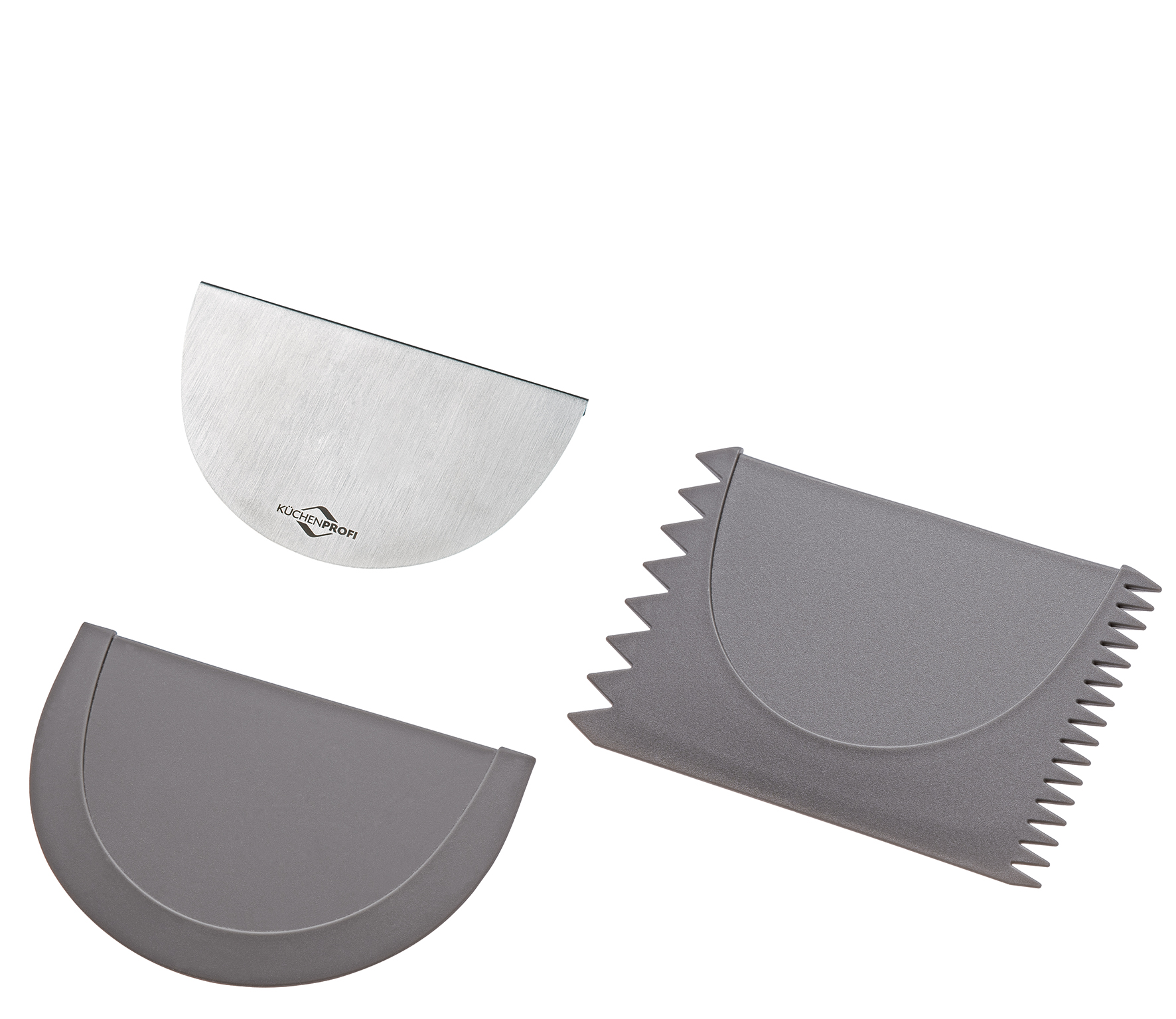 Zuckerbäcker und Brotfans bekommen tatkräftige Unterstützung. Das Teigschaber-Set VARIO von KÜCHENPROFI ist vielseitig einsetzbar. Der flexible Küchenspachtel aus hygienischem Silikon holt den letzten Rest aus der Rührschüssel und streicht ihn in der Form glatt. Der Spachtel löst auch die Teiglinge für Ihr selbst gebackenes Brot von der Unterlage. Beim Herausarbeiten von Verzierungen für die Buttercremetorte kommt die Teigkarte mit gezahnten Kanten aus hochwertigem Kunststoff zum Einsatz. Der aufsteckbare Griff aus Edelstahl sorgt bei beiden Back-Tools für mehr Stabilität.