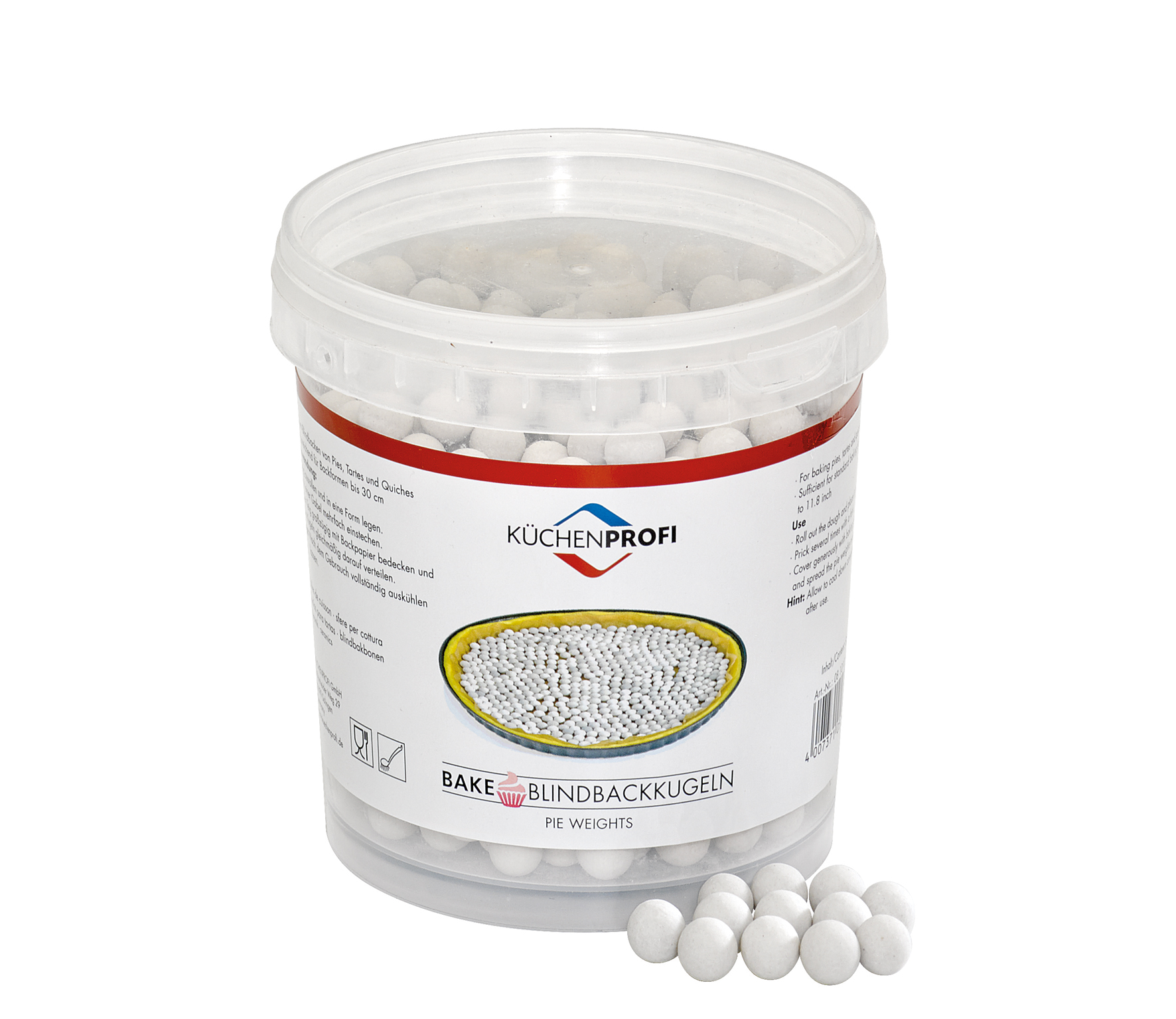 Halten Ihren Tortenboden im Blick. Mit den BAKE Blindbackkugeln von KÜCHENPROFI beschweren Sie die Böden von Torten, Quiches, Pies und Obstkuchen. Die praktischen Helfer verhindern, dass der Teig im Ofen hochbackt und unschöne Blasen wirft. Zudem halten die wiederverwendbaren Backbohnen den Teigrand an Ort und Stelle, nichts rutscht ab. Einfach den ausgerollten Teig mit einer Gabel mehrfach einstechen, großzügig mit Backpapier bedecken und die Kugeln gleichmäßig darauf verteilen. Kommt Ihr Prachtstück aus dem Ofen, kühlen die Backperlen aus Keramik aus, werden kurz abgespült und sind wieder startklar.