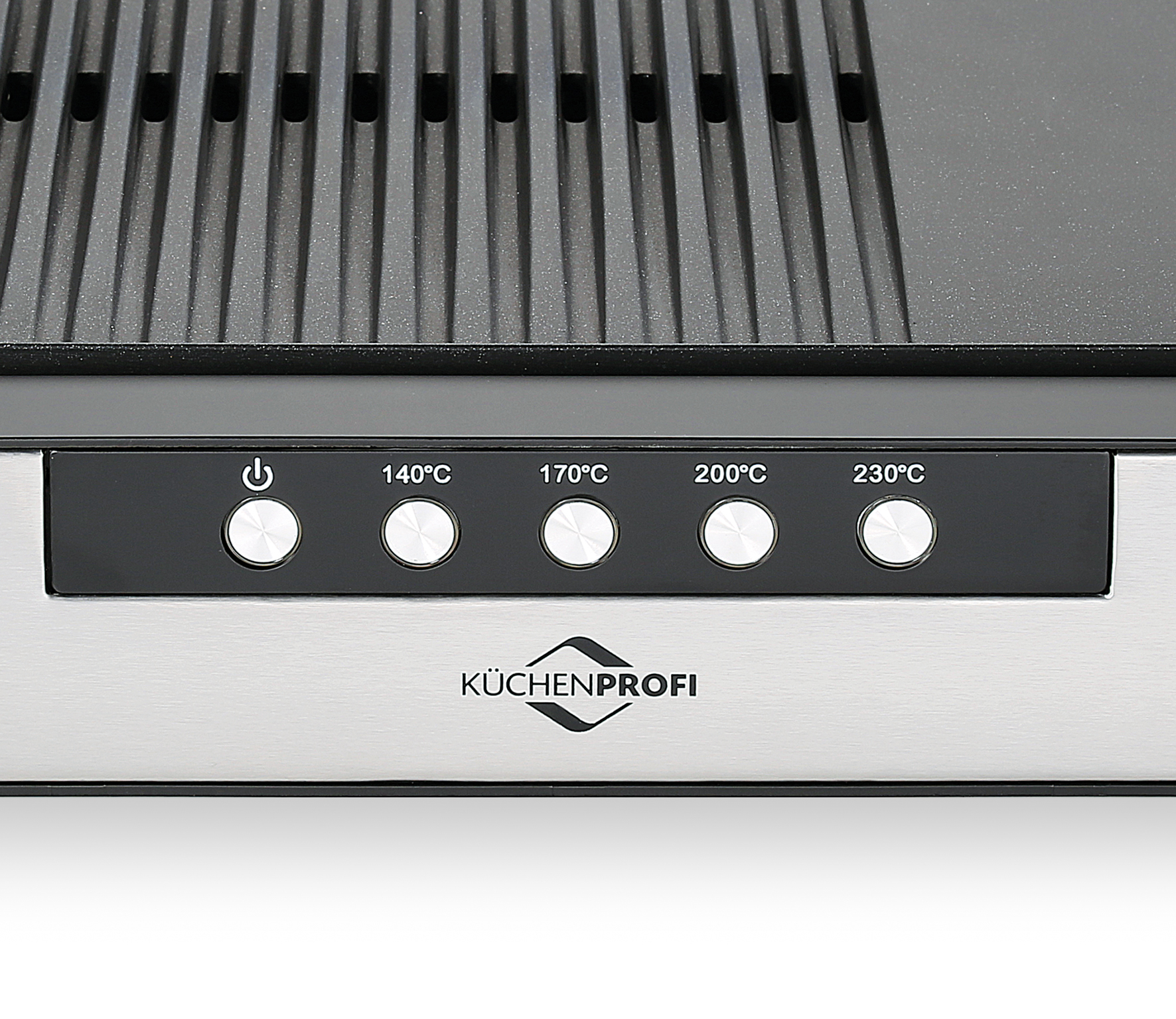 Grillfläche mit geriffelter und glatter Oberfläche, 42,5 x 30 cm. Grillplatte mit hitzeisolierten Griffen und integriertem Heizelement für direkte Wärmeübertragung. Hochwertige Antihaftbeschichtung für fettarmes Grillen und Braten sowie leichte Reinigung. 4 voreingestellte Temperaturstufen und beleuchtete Tasten. Herausnehmbare Fettauffangschale aus Edelstahl rostfrei. Rutschfeste Füße für sicheren Stand. Mit Bedienungsanleitung.