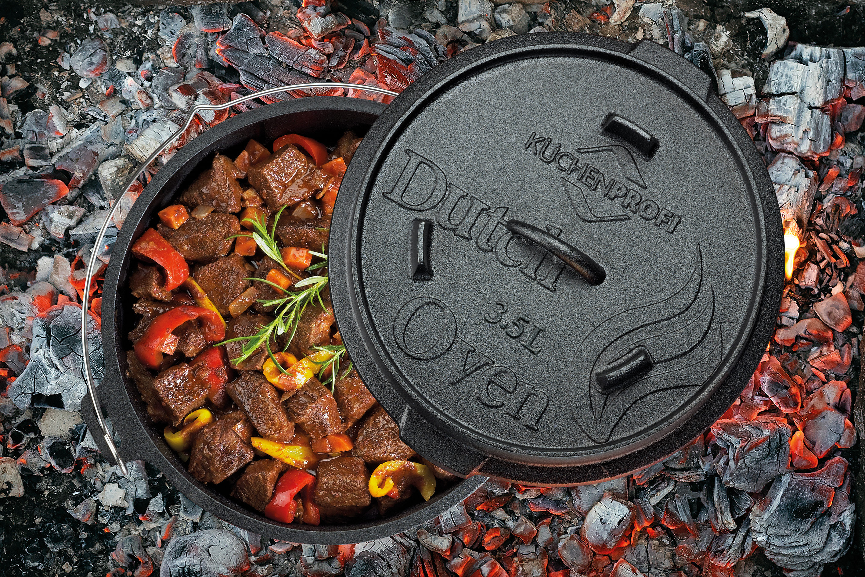 Jetzt wird es deftig! Marinierte Schweinenackensteaks und Bacon treffen auf Zwiebeln und Paprika, darüber kommt großzügig BBQ Sauce. Während das Schichtfleisch im Dutch Oven von KÜCHENPROFI auf dem Grill brutzelt und seinen Duft verbreitet, genießen Sie den Sommerabend mit Ihren Freunden oder der Familie. Auch Eintöpfe und knuspriges Brot gelingen in dem Allrounder aus robustem Gusseisen mühelos. Der Krustenbraten schmort in einem Sud aus Gemüse und Bier, in die integrierte Öffnung am Topfrand hängen Sie das Thermometer ein und überwachen die Kerntemperatur des Prachtstücks. Der Dutch Oven ist geeignet für Grills, Feuerschalen, alle Herdarten und Backofen. Tipp: Nutzen Sie den Deckel zur Zubereitung von Pizza.