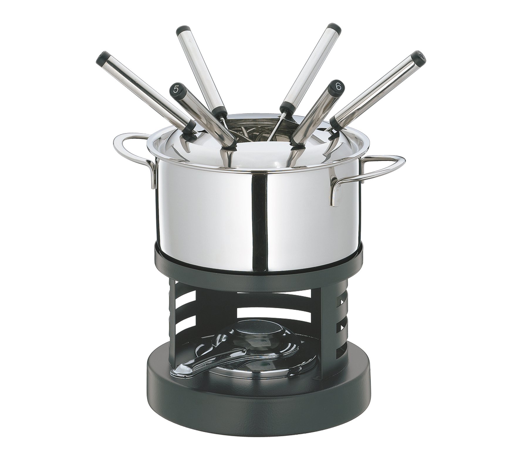 Bestehend aus: Fondue-Topf mit Spritzschutz, Rechaud, Sicherheits-Pastenbrenner, 6 Fleischfonduegabeln.