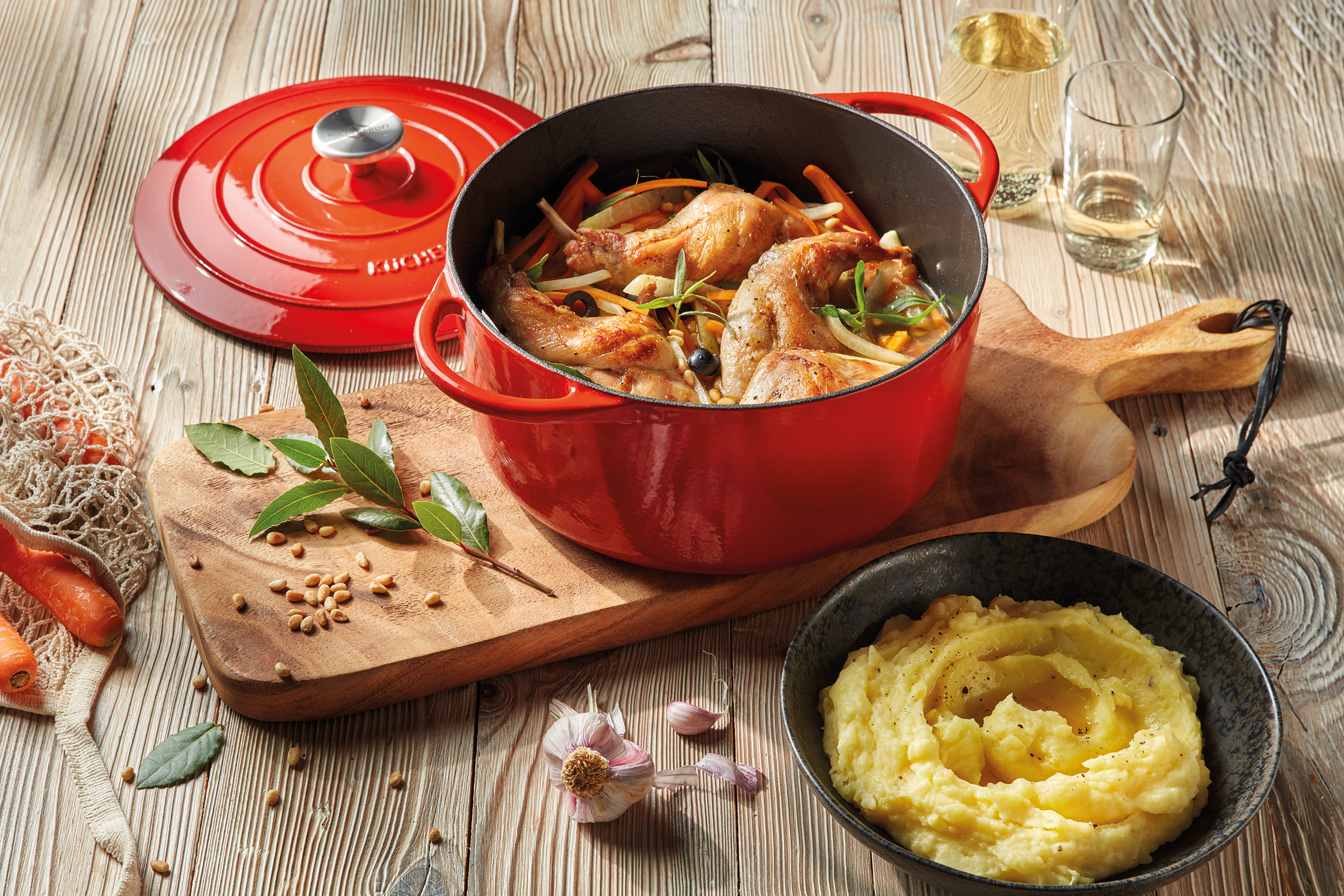 Von der Sonne verwöhntes Gemüse, Lammfleisch aus dem Hochland, Fisch und Meeresfrüchte – das alles bietet die Provence. Vielseitig, leicht und gesund ist die Küche dieser südfranzösischen Region. In dieser Tradition steht die KÜCHENPROFI Guss-Kollektion PROVENCE. Die Serie ist ideal zum Schmoren, Köcheln, Kochen, Braten und Frittieren. Das Gusseisen nimmt die Hitze schnell auf und verteilt sie optimal. So können Sie nach kurzer Zeit die Energiezufuhr reduzieren – das spart Strom und erhält das Aroma Ihrer Lebensmittel. Die PROVENCE-Kochgeschirre sind für alle Herdarten inklusive Induktion geeignet, die Knöpfe bis 250 °C backofenfest. Beim stilvollen Servieren ist das Kochgeschirr der Frische-Kick auf Ihrer Tafel. Das ebenso zeitlose wie durchdachte Design mit den handlichen Knöpfen und ergonomischen Griffen ist ein echter Blickfang. Und jetzt ist Ihre Fantasie gefragt. Wie wäre es mit einem Miesmuscheleintopf mit Seelachs, Lauch, Kartoffeln und einem Schuss Wermut? Bon appétit!