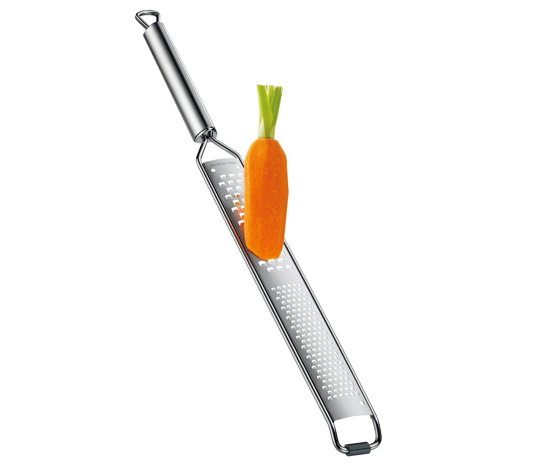 Trifft den Geschmack anspruchsvoller Köche. Die Serie PARMA von KÜCHENPROFI verbindet Funktion und Design perfekt. Die Basics für den täglichen Einsatz an Herd und Backofen sind aus robustem Edelstahl gefertigt und geeignet für die Spülmaschine. Ihre Griffe liegen gut in der Hand, das schlanke Design macht sie zum Hingucker an der Küchenleiste. Dort haben Sie von der Vorspeise bis zum Dessert für jede Gelegenheit den passenden Helfer am Start. Im wahrsten Sinne vielseitig. Der Zester GOURMET hat eine feine und eine grobe Seite. Letztere zerkleinert Möhren und Äpfel für den Rohkostsalat, Feinarbeit leistet die Reibe mit den scharfen Zähnen bei Zitrusfrüchten.