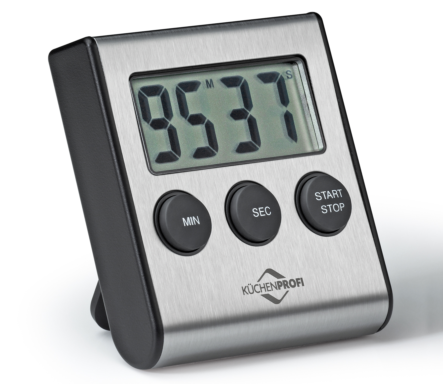 Erster in Sachen Pünktlichkeit. Beim Kochen und Backen ist auf den Digital-Timer PRIMUS von KÜCHENPROFI Verlass. Sein Timer und die Stoppuhr haben eine maximale Laufzeit von 99 Minuten und 59 Sekunden. Den Countdown lesen Sie ganz bequem auf dem Display ab. Ebenfalls praktisch: Sie können den Zeitmesser dort positionieren, wo Sie ihn am besten im Blick haben. Mit dem Standfuß direkt auf der Arbeitsfläche, mit Hilfe des Magneten an der Dunstabzugshaube oder samt Öse an der Küchenleiste.