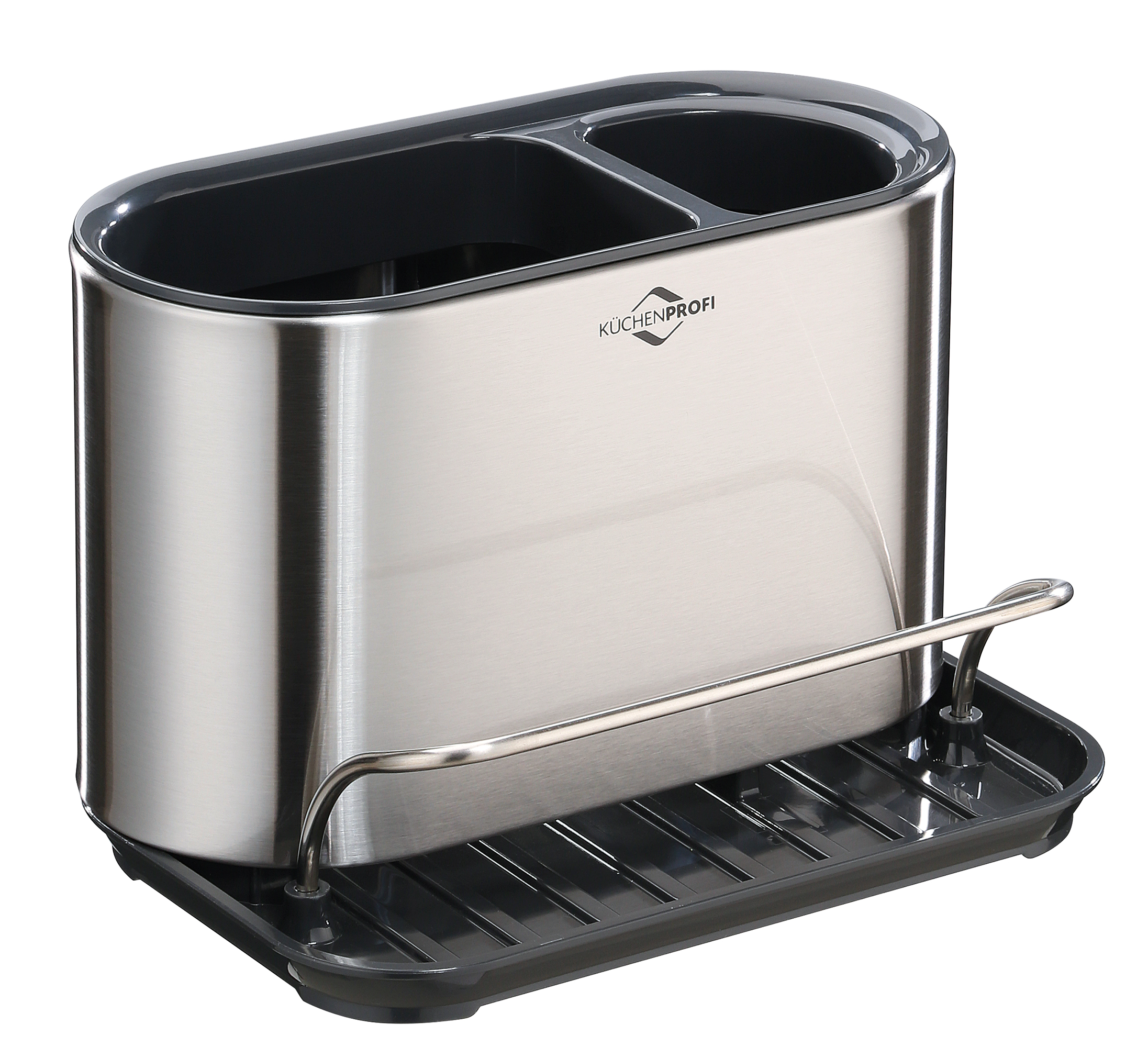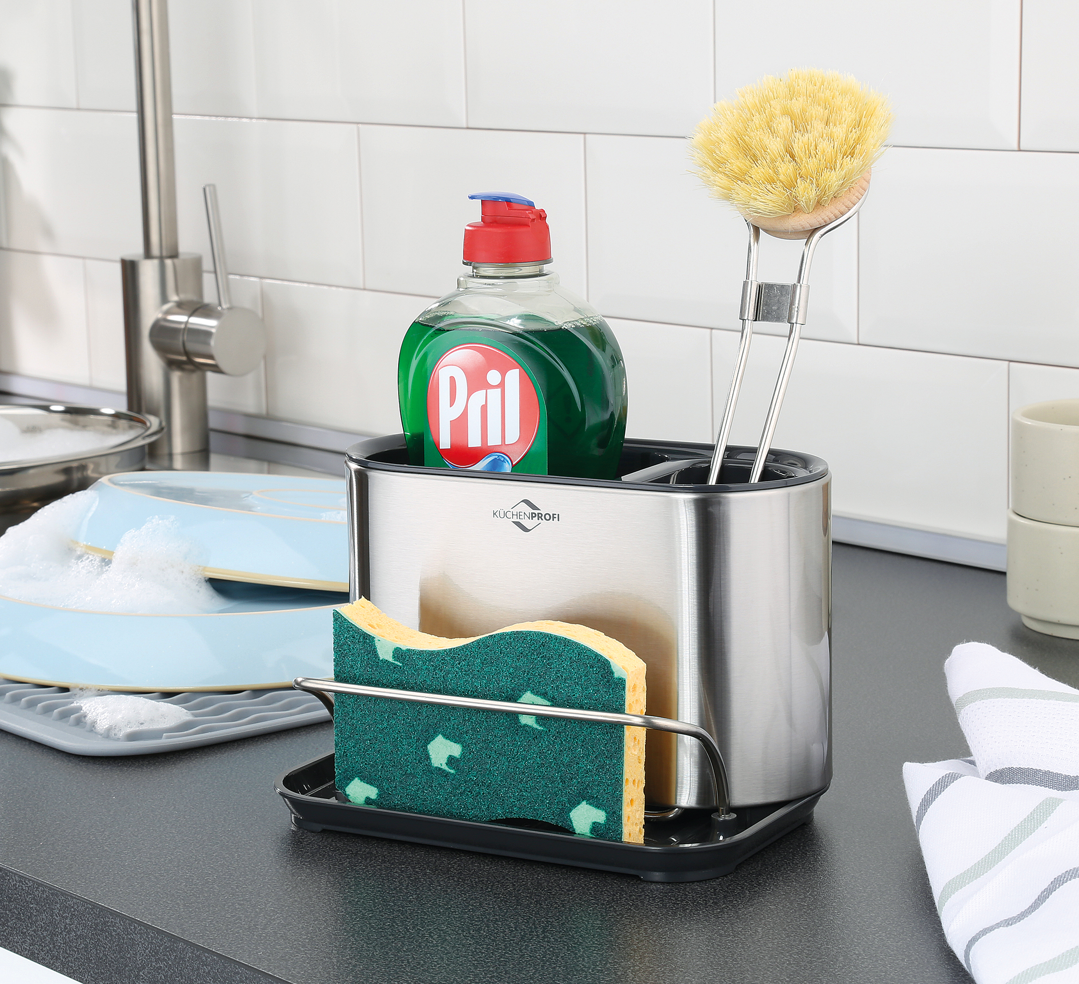 Blitzsauber gelöst! Die Spülstation PRIMUS von KÜCHENPROFI unterstützt Sie dabei, die Geschirrberge verschwinden und die Oberflächen glänzen zu lassen. Der Behälter aus rostfreiem Edelstahl und hochwertigem Kunststoff hat separate Fächer für Spülmittelflasche und Spülbürste. Der Schwamm oder das Schwammtuch parken in der Ablage mit Bügel. Praktisch: Die Abtropfschale fängt Wassertropfen auf. Damit der glänzende Eindruck der Spülstation lange erhalten bleibt, bitte den Schwamm immer mit der weichen Seite zur Edelstahloberfläche drehen, um Kratzer zu vermeiden.