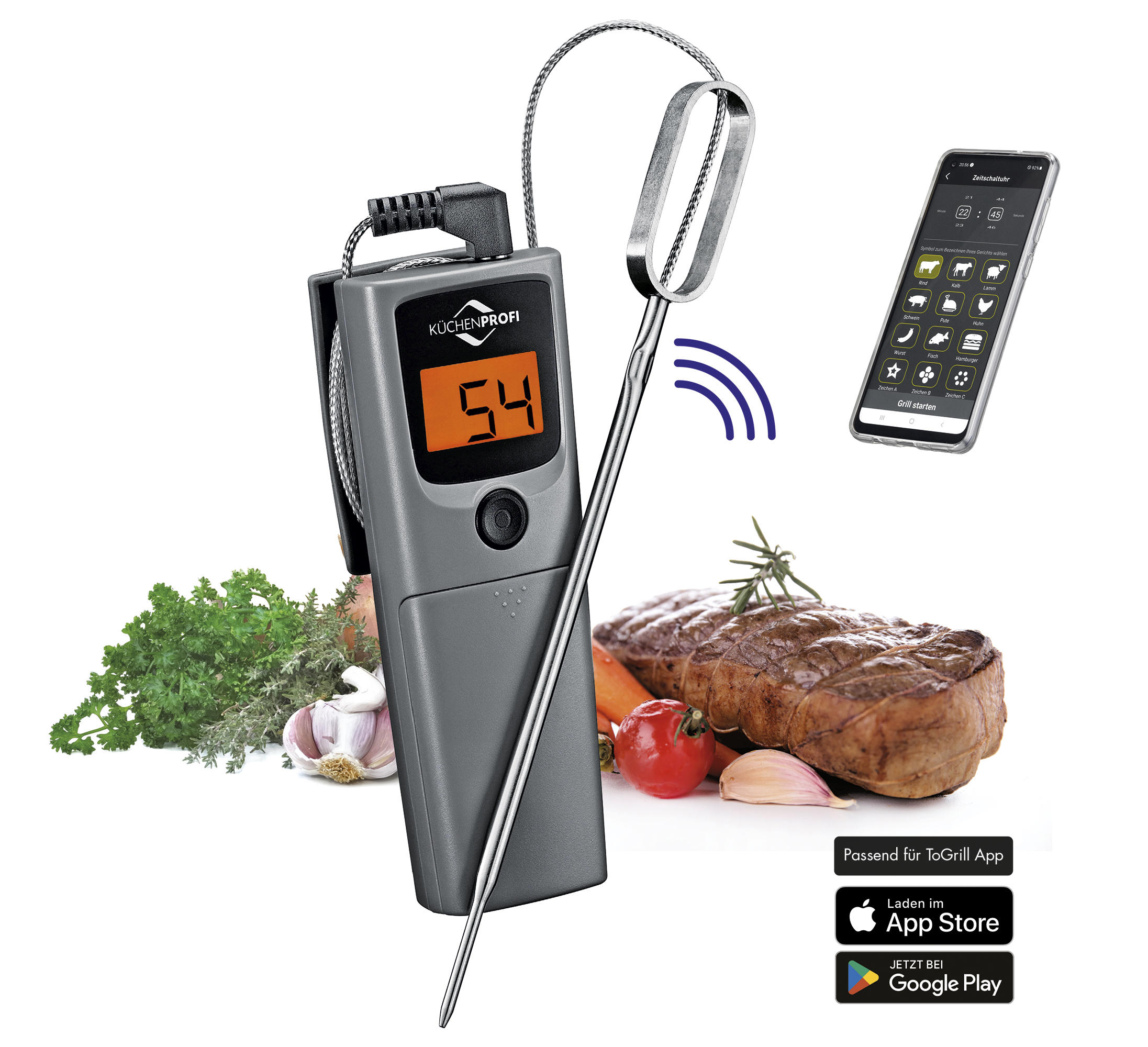 Ganz schön schlau! KÜCHENPROFI verbindet die digitale Welt mit analogem Grillgenuss. Das BBQ Braten- und Grillthermometer SMART hat einen präzisen Messfühler, der die Kerntemperatur Ihres Grillguts von 0 °C bis 300 °C misst. Steaks und das Pulled Pork gelingen auf den Punkt. Auch ideal zur Kontrolle der Temperatur im Grill oder Backofen. Unsere Empfehlung: Verbinden Sie das Thermometer mit der ToGrill App, frei verfügbar für Android und iOS. So können Sie nicht nur zwischen voreingestellten Lebensmittelarten und Garstufen wählen, Sie behalten auch die Kontrolle über die Kerntemperatur. Und zwar überall. Dank des mobilen Grillassistenten bewegen Sie sich frei zwischen Ihren Gästen. Stehen die Leckereien auf dem Tisch, wird ein Selfie gemacht.