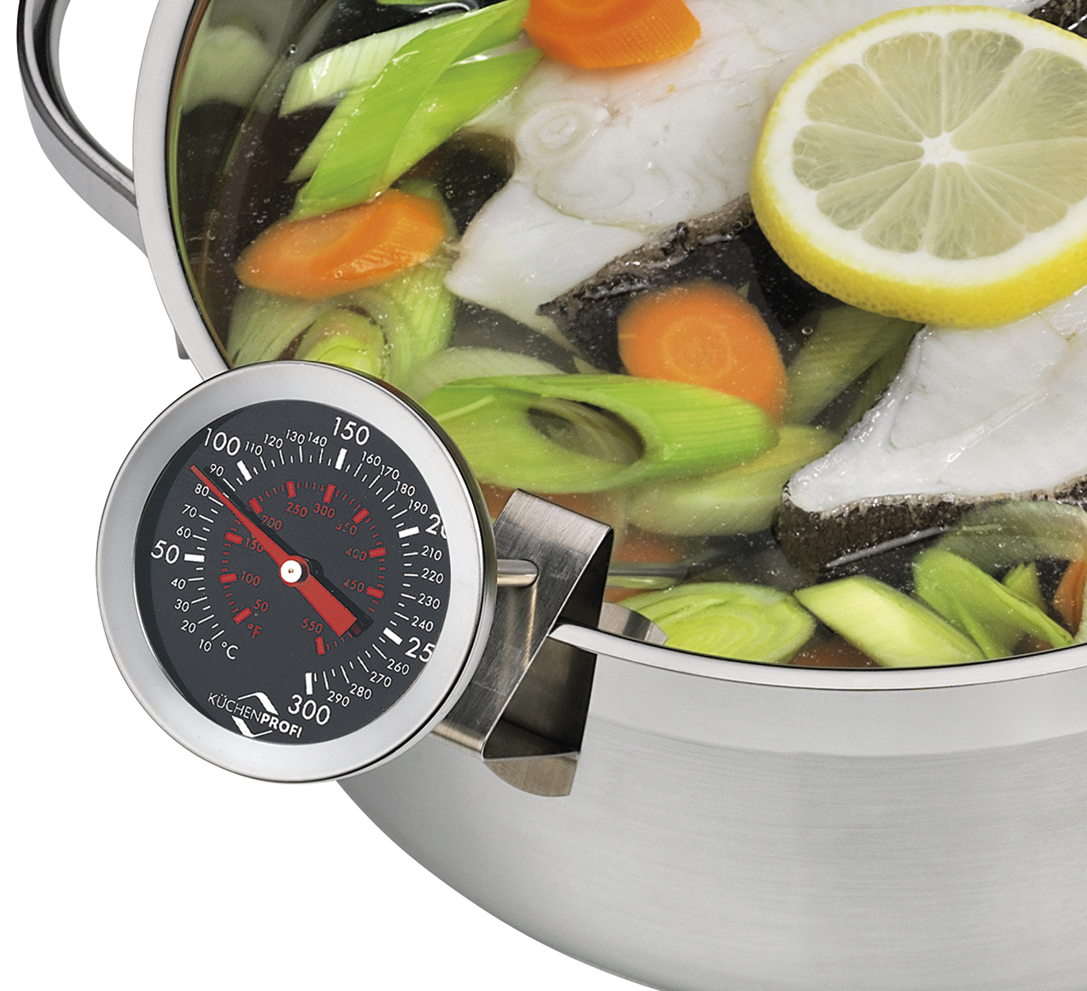 Goldgelbe Pommes Frites, zarte Tempura mit Gemüse oder Krabben, fluffige Berliner. All diese Köstlichkeiten kommen aus der Fritteuse. Das KÜCHENPROFI Frittier-Thermometer sorgt für ein perfektes Ergebnis. Sie befestigen es mit dem Clip einfach am Topf oder der Fritteuse und sehen, ob das Fett die ideale Temperatur von ca. 170 – 180 °C erreicht hat. Eine wesentlich exaktere und sicherere Methode als ein Holzstäbchen in das siedende Öl zu halten und zu schauen, ob Bläschen emporsteigen. Dank des ausgedehnten Temperaturbereichs von 0 – 300 °C können Sie das Thermometer auch zum Pochieren, Niedertemperaturgaren und bis ca. 160 °C als Zuckerthermo-meter einsetzen. Frittier-Tipp: Tauschen Sie das Öl spätestens nach fünf Vorgängen aus, da es dann verunreinigt ist und sich nicht mehr hoch genug erhitzen lässt.