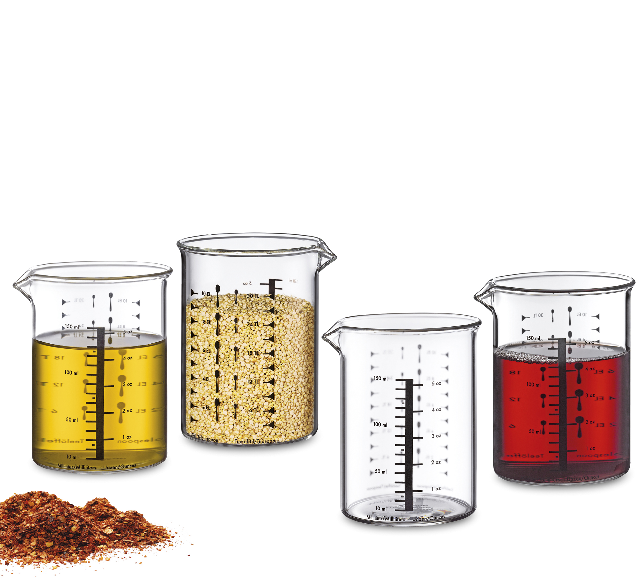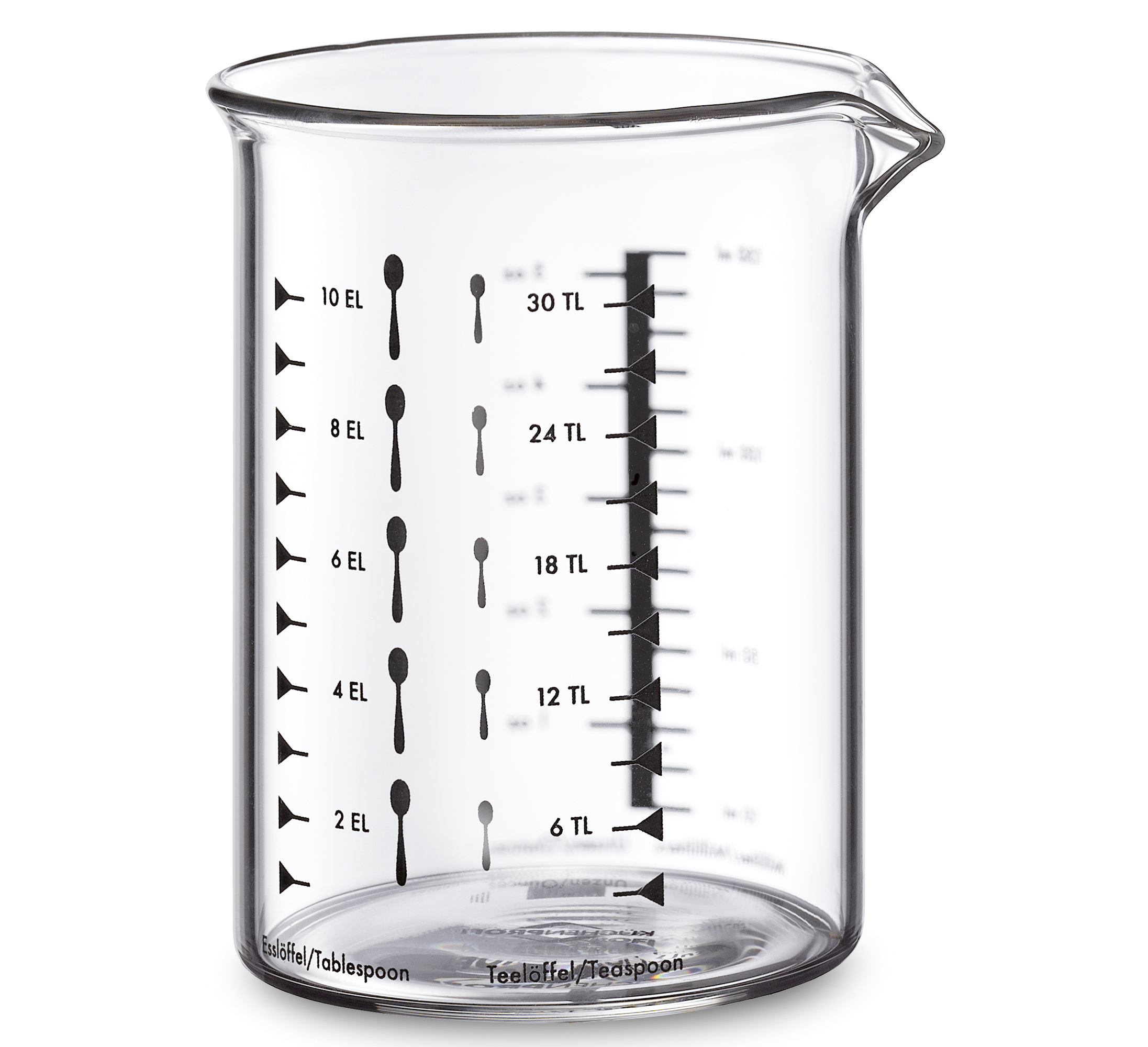 Glasklar: Der Messbecher von KÜCHENPROFI gehört beim Backen und Kochen zur Grundausstattung. Er zeigt Ihnen zuverlässig die benötigte Menge flüssiger und fester Lebensmittel wie Reis, Couscous, Mehl oder Zucker an. Da die Angaben je nach Rezept variieren, verfügt der Messbecher über praktische Skalen in Milliliter, Unzen, Ess- und Teelöffel. Das Borosilikatglas ist hitzebeständig und robust.