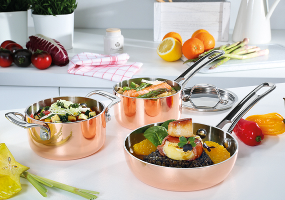 Eine glänzende Idee – Kupfer ist seit jeher das edelste Material, das für die Herstellung von Töpfen und Pfannen eingesetzt wird. Mit der Serie CULINOX interpretiert SPRING diesen Klassiker neu und verbindet Altbewährtes mit den Ansprüchen moderner Küchen.