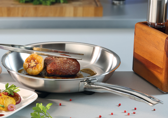 Die Edelstahl-Pfanne BRIGADE PREMIUM ist unbeschichtet und kann sehr hoch erhitzt werden. Sie ist die ideale Wahl für saftige Steaks, krosse Bratkartoffeln und knuspriges Seafood.