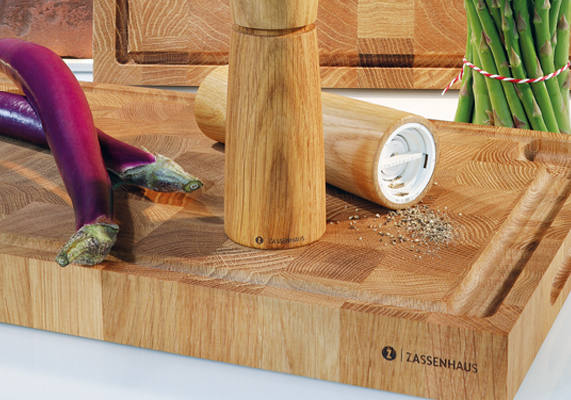 Mit seiner warmen Struktur passt Eichenholz aus europäischer Fertigung in jedes Küchen-Ambiente. Die kopfverleimten Hackblöcke in Profiqualität sind das besondere Highlight.